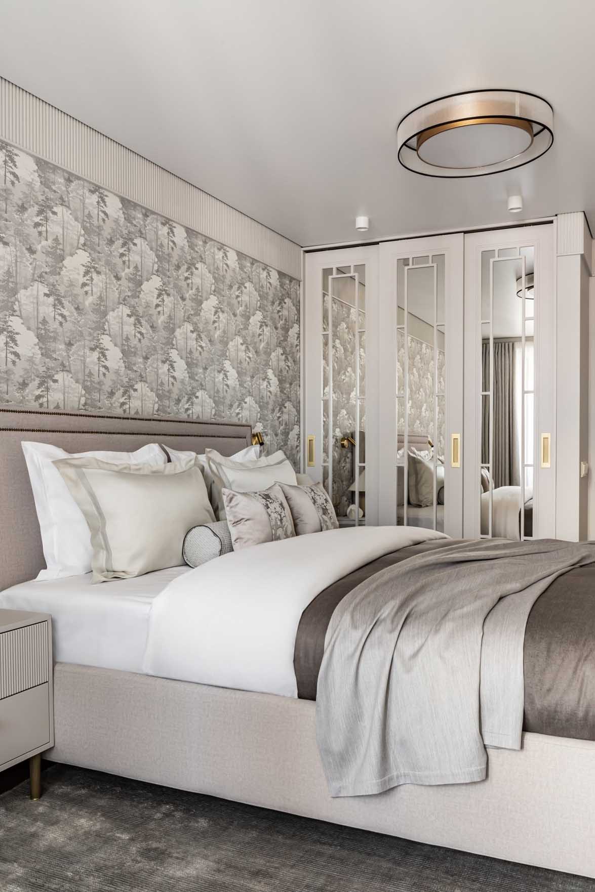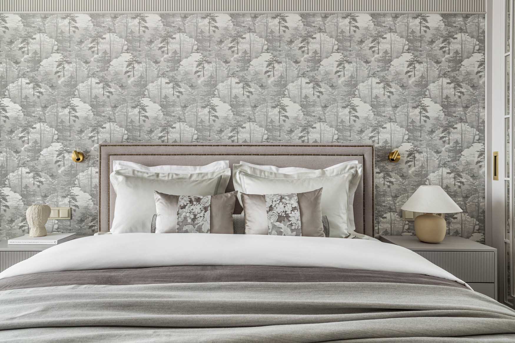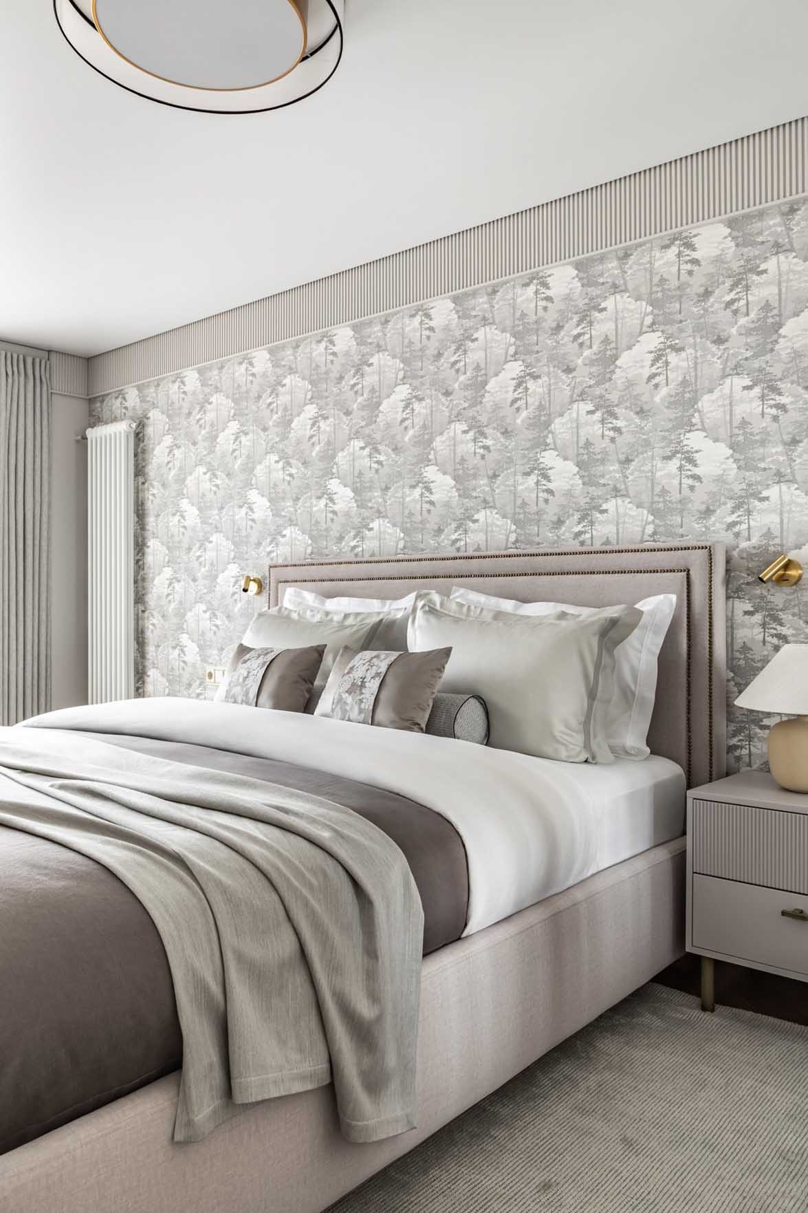 A hálószobában a falakat poliuretán díszlécek tagolják, az ágy fejtámlája mögötti felületet pedig texturált tapéta díszíti, amely melegséget és otthonosságot kölcsönöz a helyiségnek.
