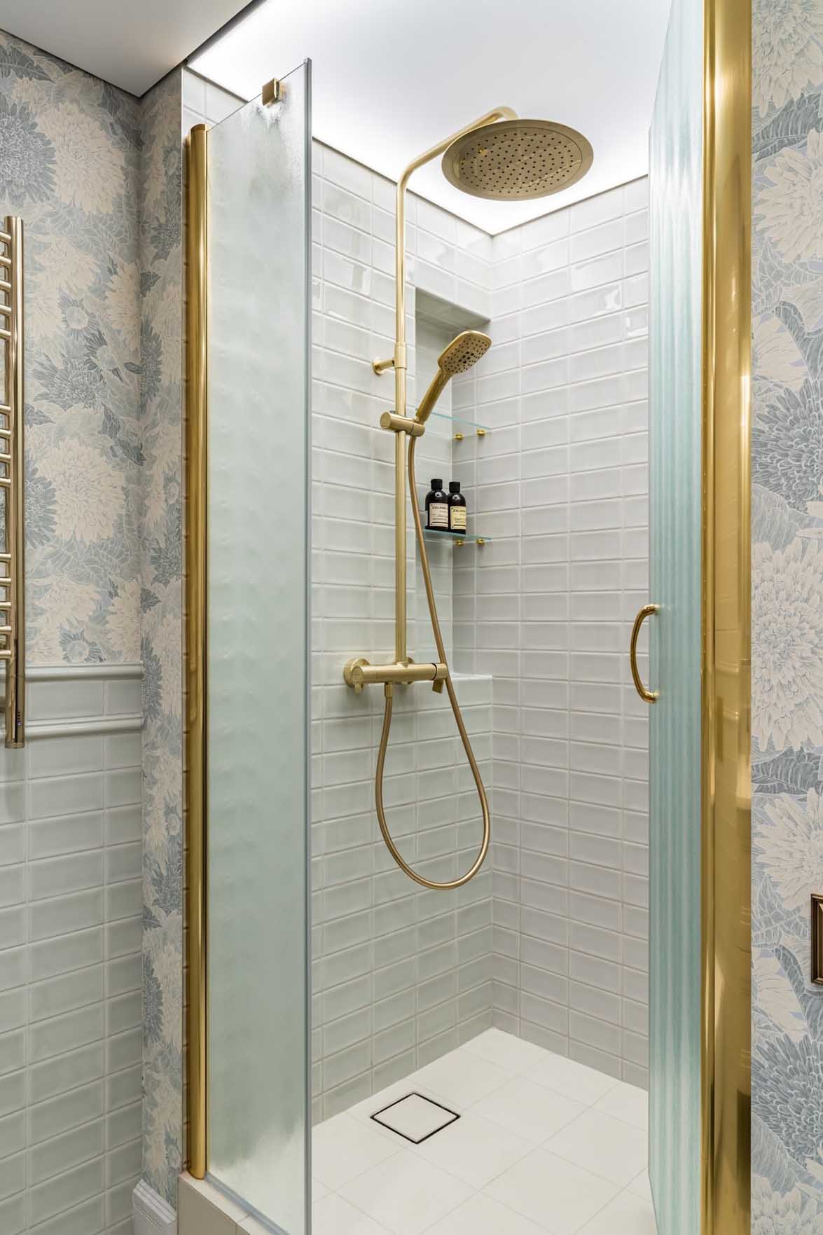 A megnövelt alapterületű fürdőszobában minden funkció kényelmesen elfért: az épített zuhanyzó, a mosógép és a szükséges tárolók is. A mosdó alatt egy nagyméretű, függesztett szekrény biztosít helyet a pipereholmiknak, amelyet a falba süllyesztett, praktikus falfülkék egészítenek ki. A burkolatok terén a kisméretű fali csempe és a vízálló tapéta kombinációja dominál, melyet a sárgaréz szerelvények és csaptelepek tesznek igazán elegánssá és időtállóvá.