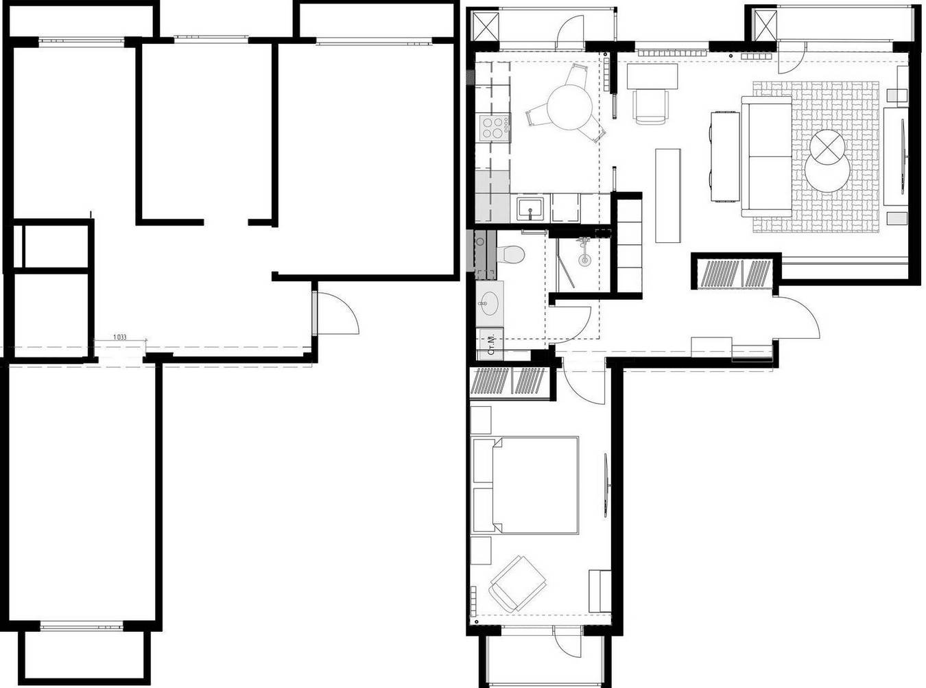 Az ingatlanon radikális átalakítást végeztek. A korábbi, korszerűtlen elosztású – szűk konyhával és apró, különálló vizesblokkokkal rendelkező – lakásból falbontásokkal és térszervezéssel egy tágas, szellős életteret hoztak létre. A fürdőszoba alapterületét megnövelték, így kényelmesen elfért benne egy épített zuhanykabin. A konyhát egybenyitották a nappalival, egy tágas közösségi teret létrehozva, míg a második szoba megmaradt kényelmes hálószobának. A konyha és a nappali közé elegáns, üvegezett térelválasztó elemek kerültek, amelyek vizuálisan nem szűkítik a teret, mégis funkcionális határt képeznek.