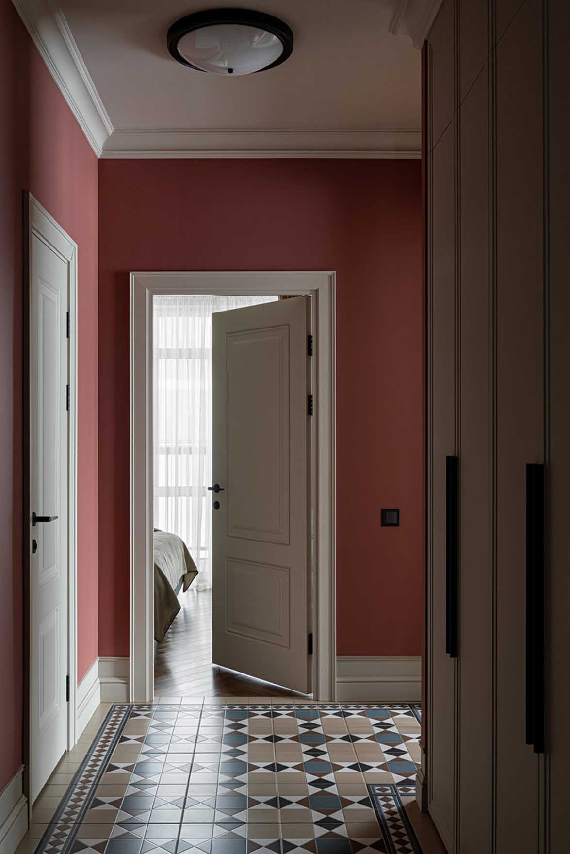 Az előszobában a padlót spanyol Pamesa járólapokkal burkolták. A falak színesek, a Little Green egy meleg bordó árnyalatával festve.