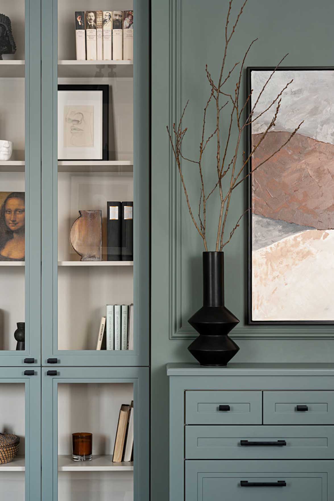 A térkialakítás során egy építészeti akadályt is sikerült előnnyé kovácsolni: a nappaliba benyúló tartóoszlopot beépített polcrendszerrel vették körül. A díszlécek, a polcok és az oszlop azonos színkiemelést kaptak, így a szerkezeti elem szinte „feloldódik” a térben, miközben praktikus tárolófelület jött létre.