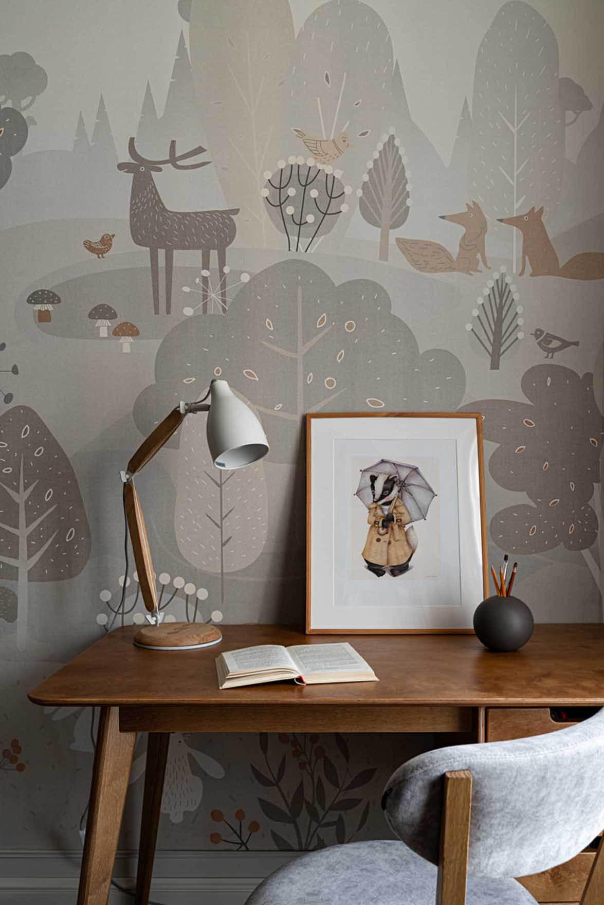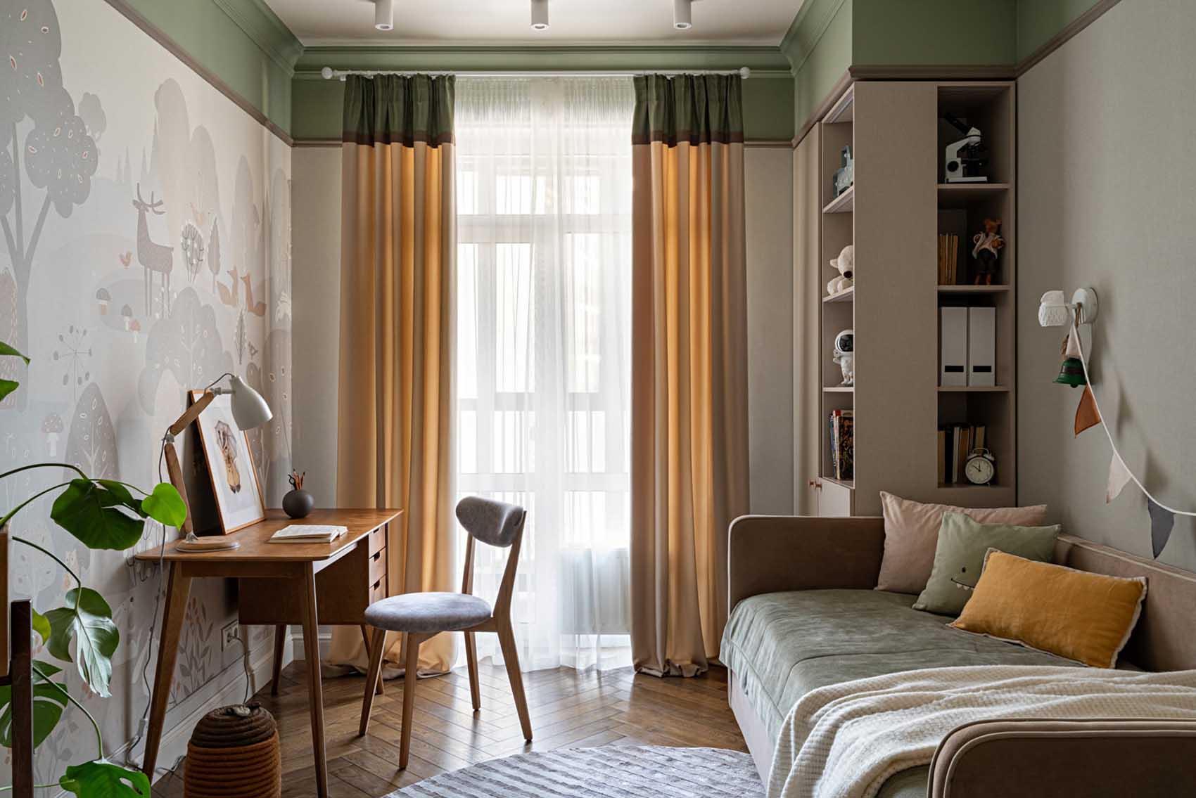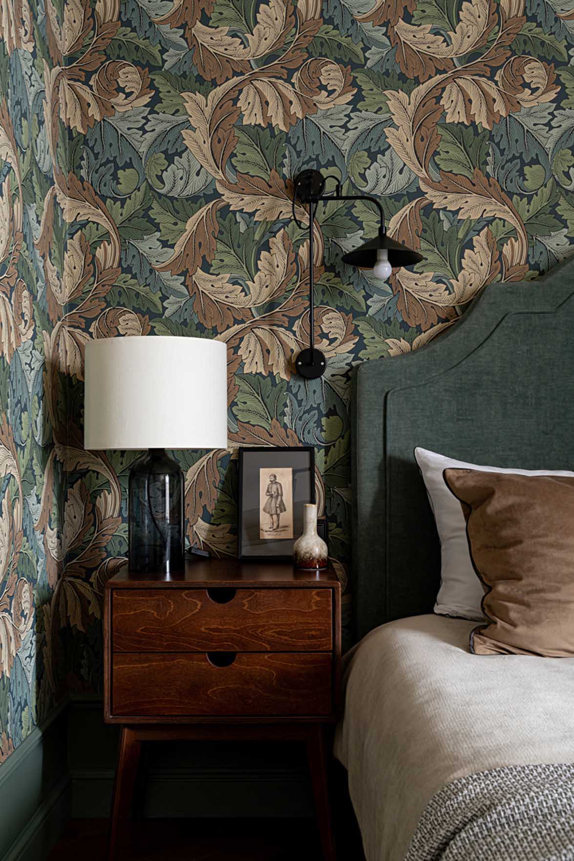 A privát zónák – hálószoba, gyerekszoba és fürdők – dekorációja a William Morris tapéták botanikus tematikájára épül. A projektet a tervező találóan „Mesebeli erdőnek” nevezi, utalva a zöld és bogyós gyümölcs árnyalatok gazdagságára, valamint a minden helyiségben felbukkanó növényi motívumokra. Az iskoláskorú fiú szobájában a színvilágot az okker és az olíva árnyalatai, valamint a tapétán megjelenő erdei motívumok határozzák meg.