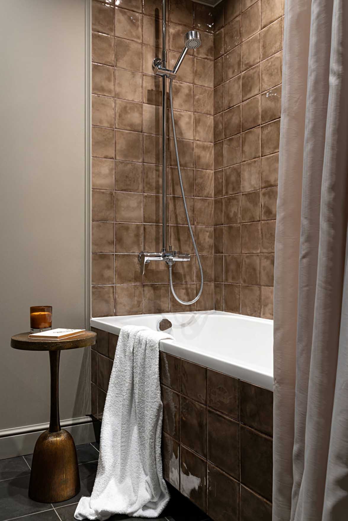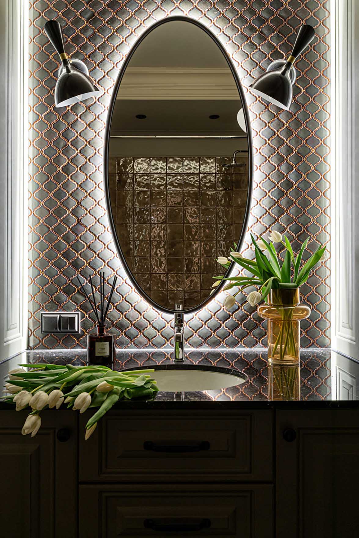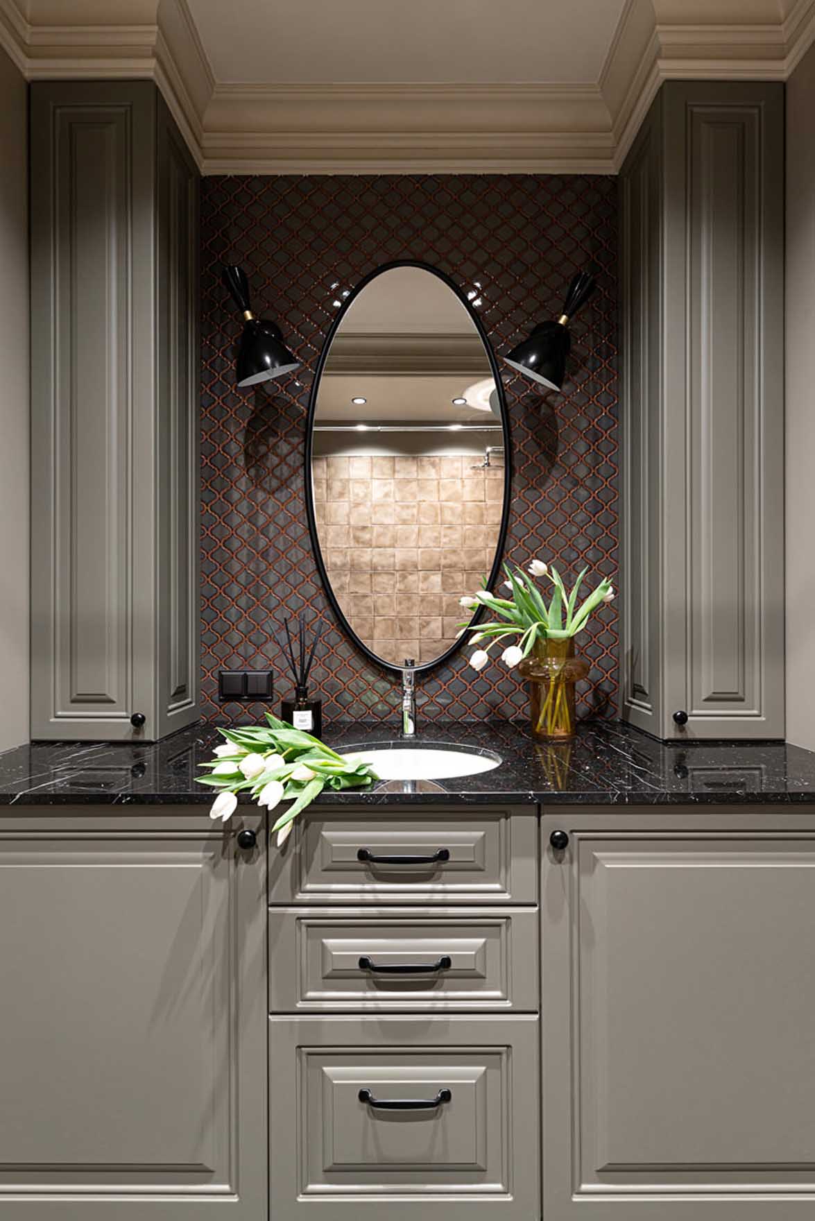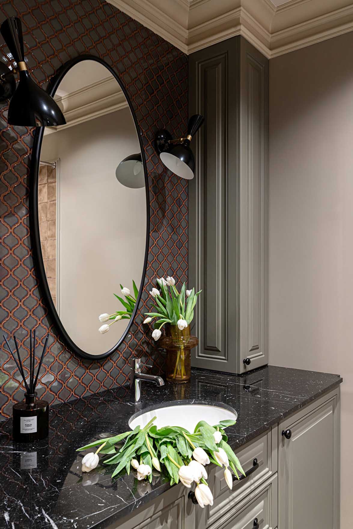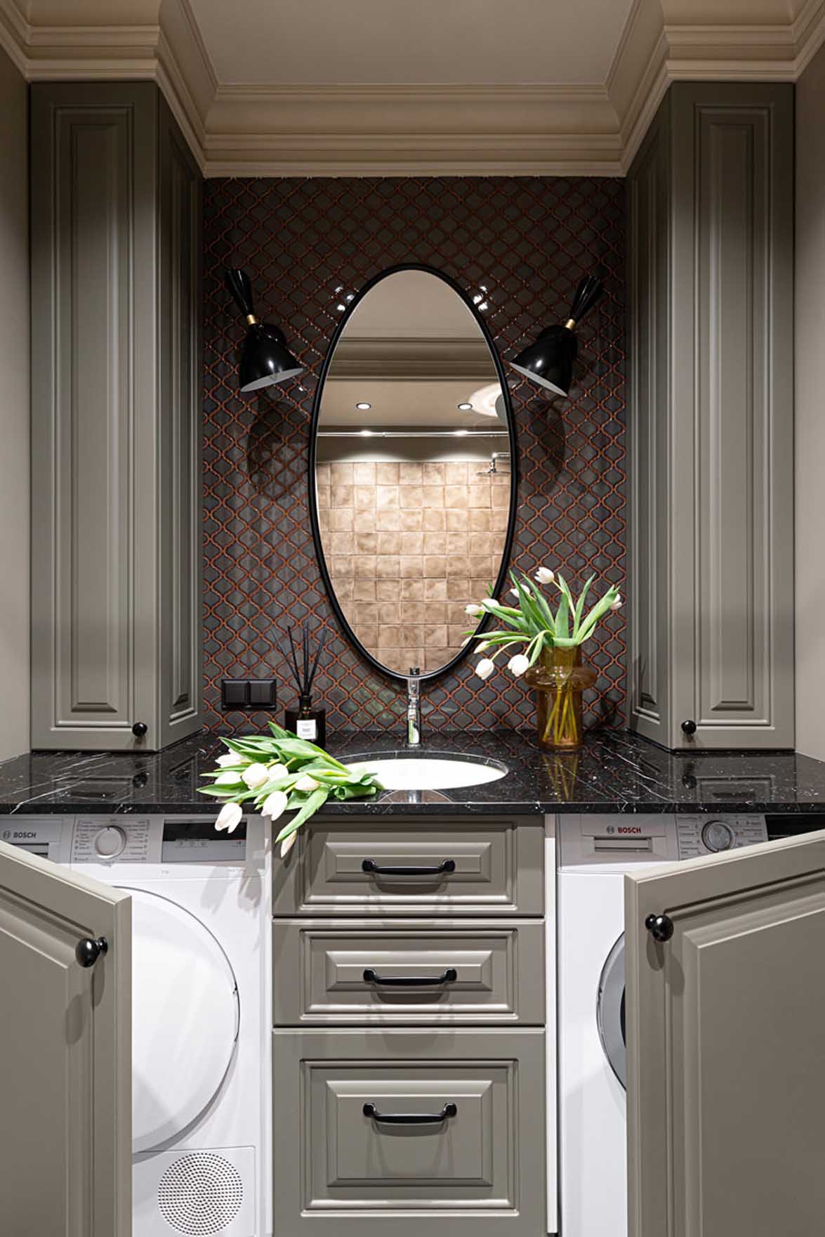 Különleges, a hazai gyakorlatban ritkább megoldásként a fürdőszobába is a Morris & Co. tapétája került. Bár elsőre nem tűnik a legpraktikusabb választásnak vizes helyiségbe, a végeredmény igazolja a bátorságot: a helyiség valódi szoba-hangulatot áraszt. A háztartási gépek elrejtése érdekében egy egységes szekrényrendszert alakítottak ki, amelyet elegáns márványpult fed, így a technikai eszközök nem törik meg az otthoni spa-élményt.