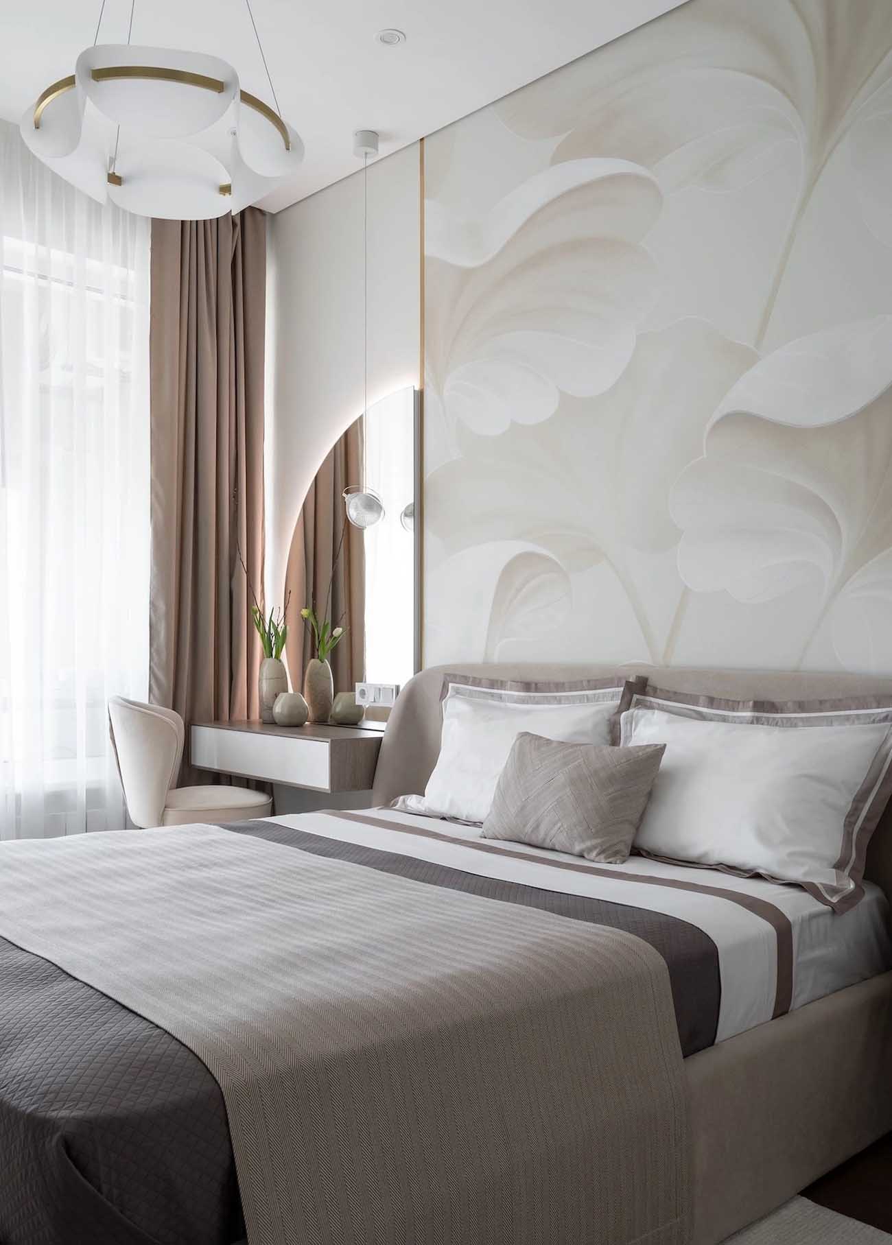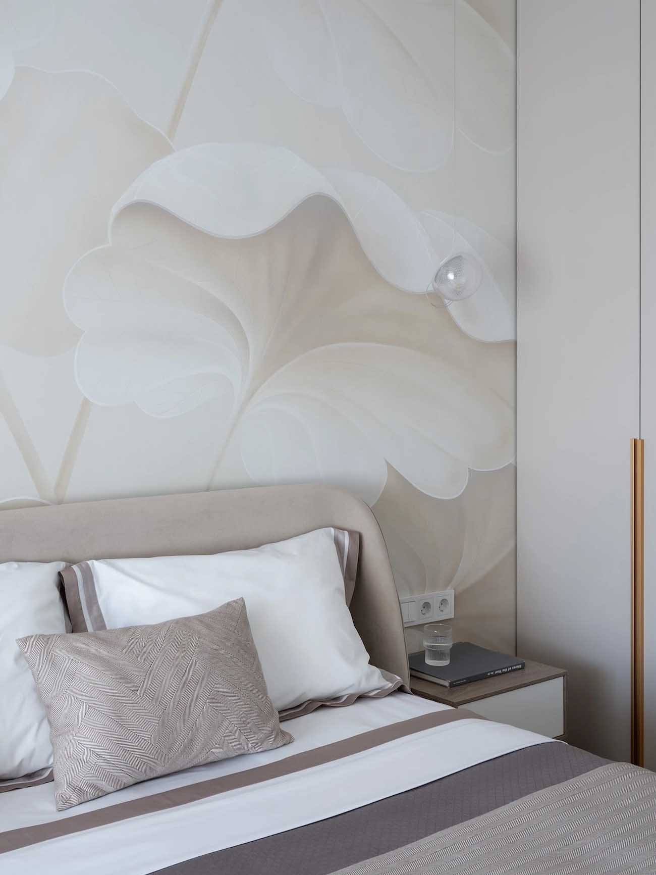A szülői hálószoba hangulatát és inspirációját a franciaágy mögötti, kézzel készített, festői tapétapanel adja. Ennek lágy, organikus formái és visszafogott színei ihlették a többi bútor és dekoráció kiválasztását is. A tárolásról egy négyszárnyú gardróbszekrény gondoskodik. Az egyik éjjeliszekrény helyett egy légies konzol került a falra, amely fésülködőasztalként is funkcionál. Az általános világítást egy központi csillár adja, míg a hangulatfényekről az ágy két oldalán lebegő függesztékek gondoskodnak.