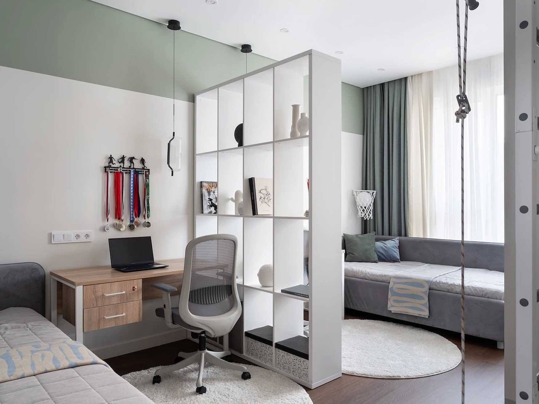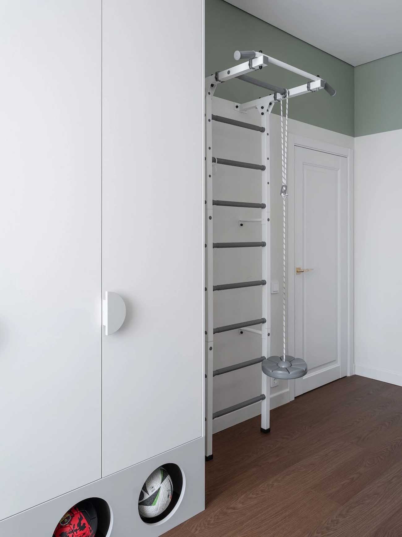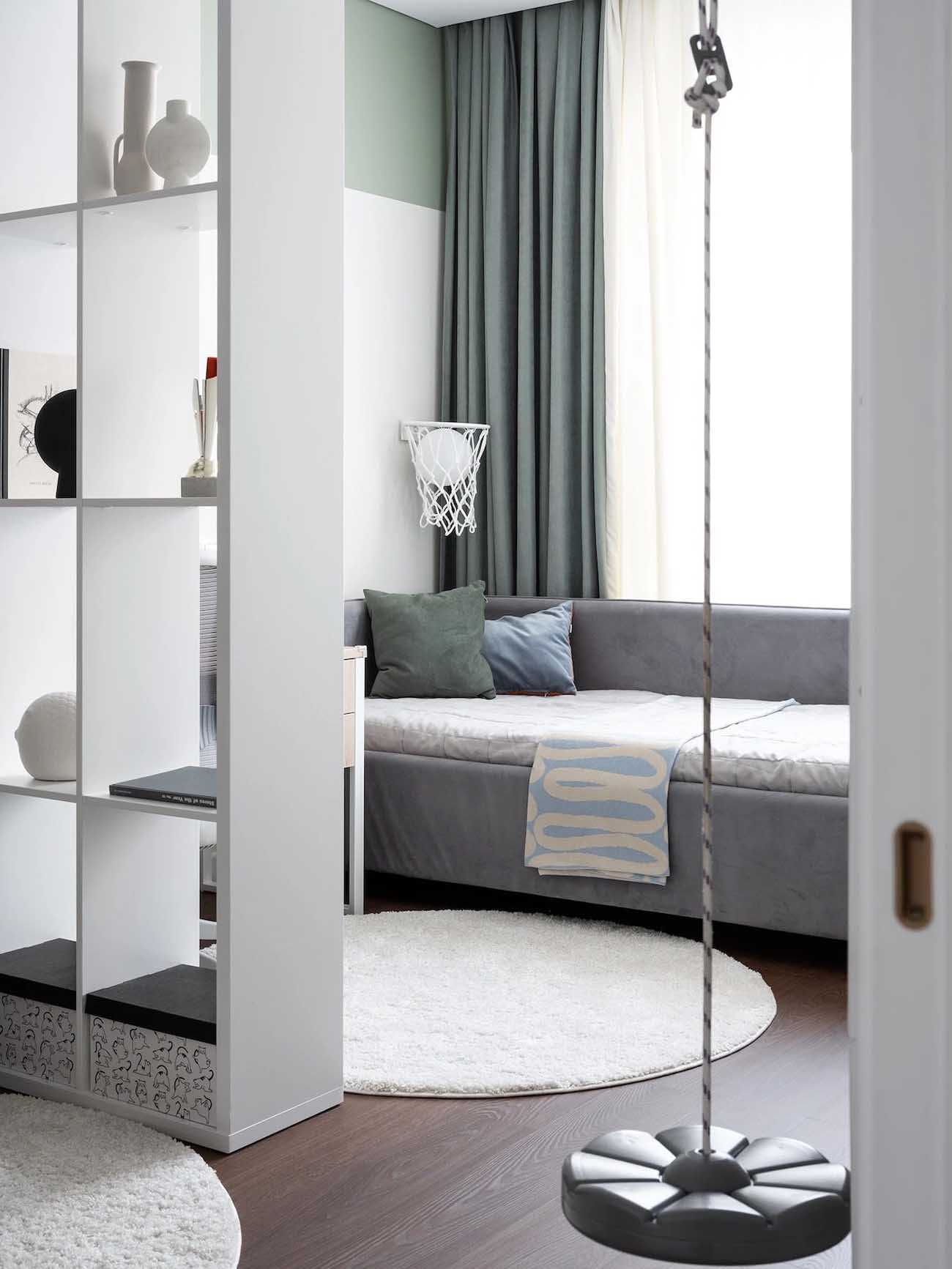 A két fiú szobájának kialakítása kiemelt fontosságú volt. A teret egy központi elemként elhelyezett, nyitott polcrendszerrel osztották ketté. Ez a térelválasztó bútor finoman jelöli ki a két fiú saját territóriumát, így mindkettőjüknek saját alvó- és tanulósarka lehetett. A ruháikat közös szekrényben tárolják, amelynek alsó részét kifejezetten a sportszerek, labdák tárolására alakították ki – ez egyszerre funkcionális és dekoratív megoldás. A szoba egyik sarkában bordásfal is helyet kapott az aktív testmozgáshoz. A falak alapszínét egy magas lábazatként felfutó, visszafogott zöld sáv, illetve az egyik ágynál egy kék akcentusfal egészíti ki. A világítás is a tematikához igazodik: az ágyak feletti falikarok kosárlabdát és palánkot formáznak.