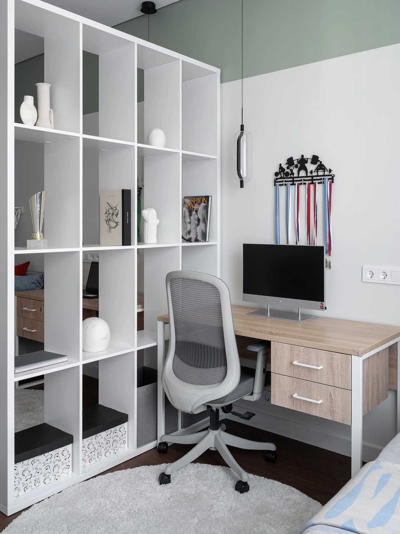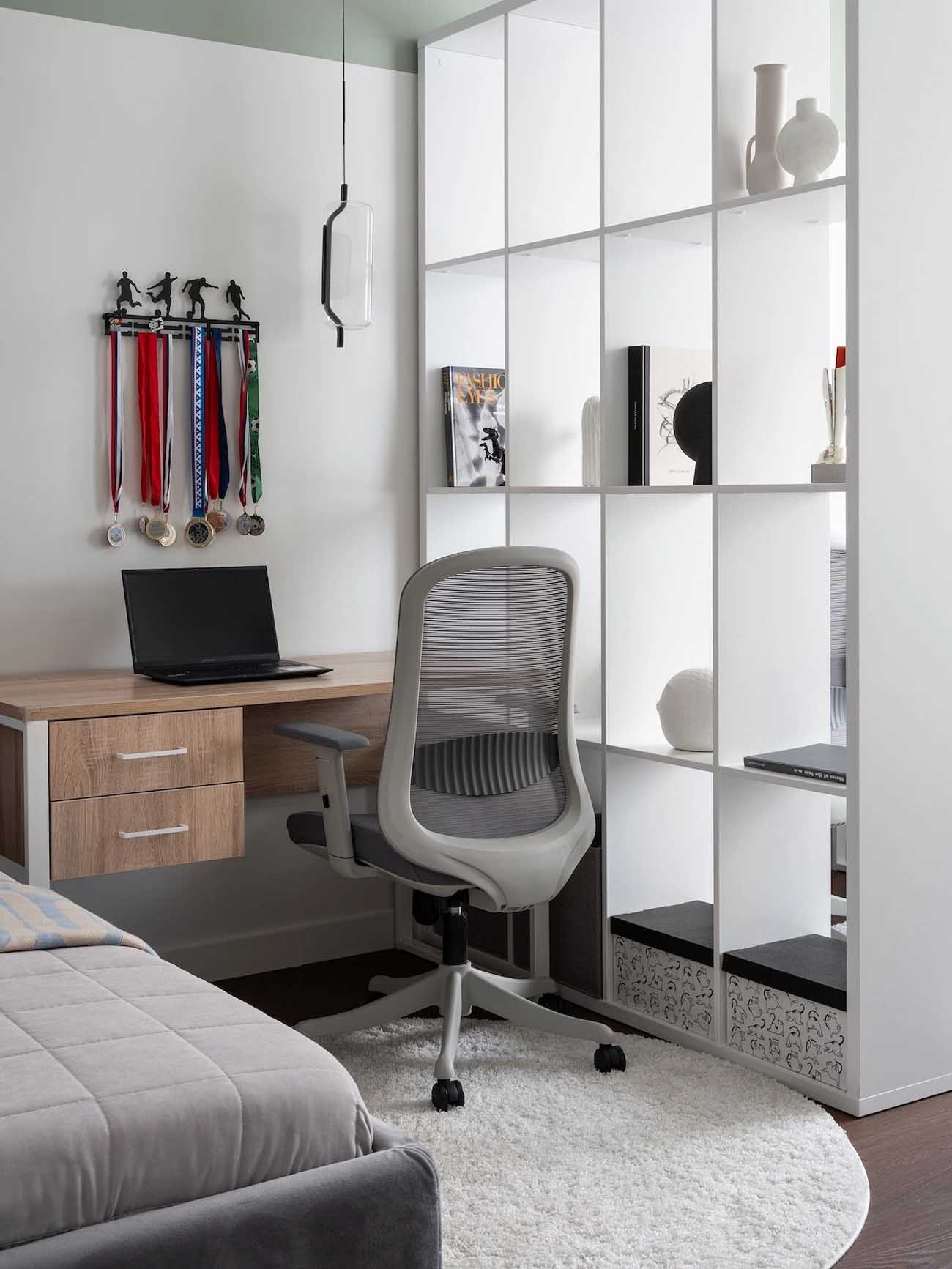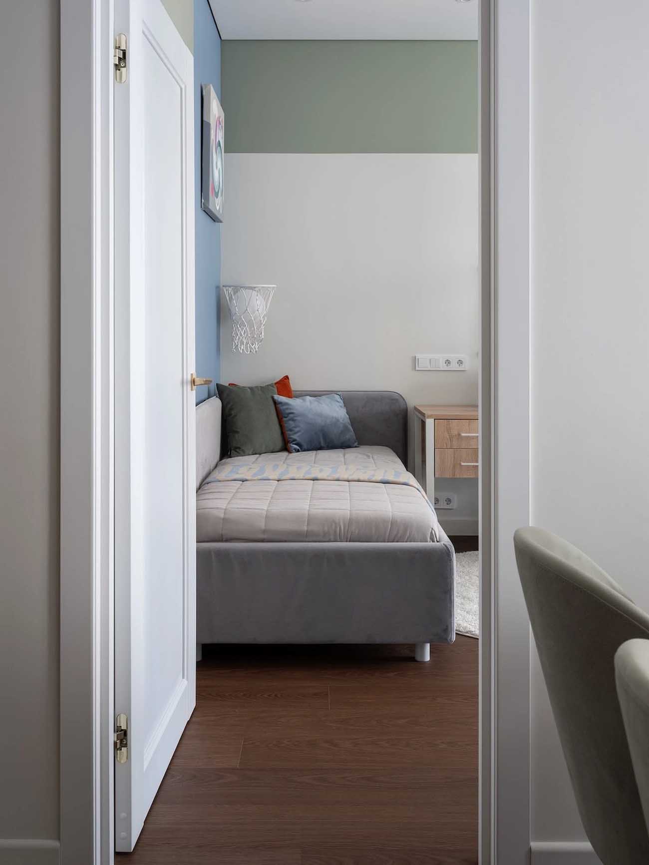 A két fiú szobájának kialakítása kiemelt fontosságú volt. A teret egy központi elemként elhelyezett, nyitott polcrendszerrel osztották ketté. Ez a térelválasztó bútor finoman jelöli ki a két fiú saját territóriumát, így mindkettőjüknek saját alvó- és tanulósarka lehetett. A ruháikat közös szekrényben tárolják, amelynek alsó részét kifejezetten a sportszerek, labdák tárolására alakították ki – ez egyszerre funkcionális és dekoratív megoldás. A szoba egyik sarkában bordásfal is helyet kapott az aktív testmozgáshoz. A falak alapszínét egy magas lábazatként felfutó, visszafogott zöld sáv, illetve az egyik ágynál egy kék akcentusfal egészíti ki. A világítás is a tematikához igazodik: az ágyak feletti falikarok kosárlabdát és palánkot formáznak.