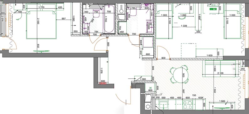 Az ingatlan eredeti alaprajza két szobát, egy konyha-nappalit, két vizes helyiséget és egy tágas előszobát foglalt magában. A tervező az elrendezésen csak minimálisan változtatott, de ezek a beavatkozások jelentős funkcionális előnyökkel jártak.