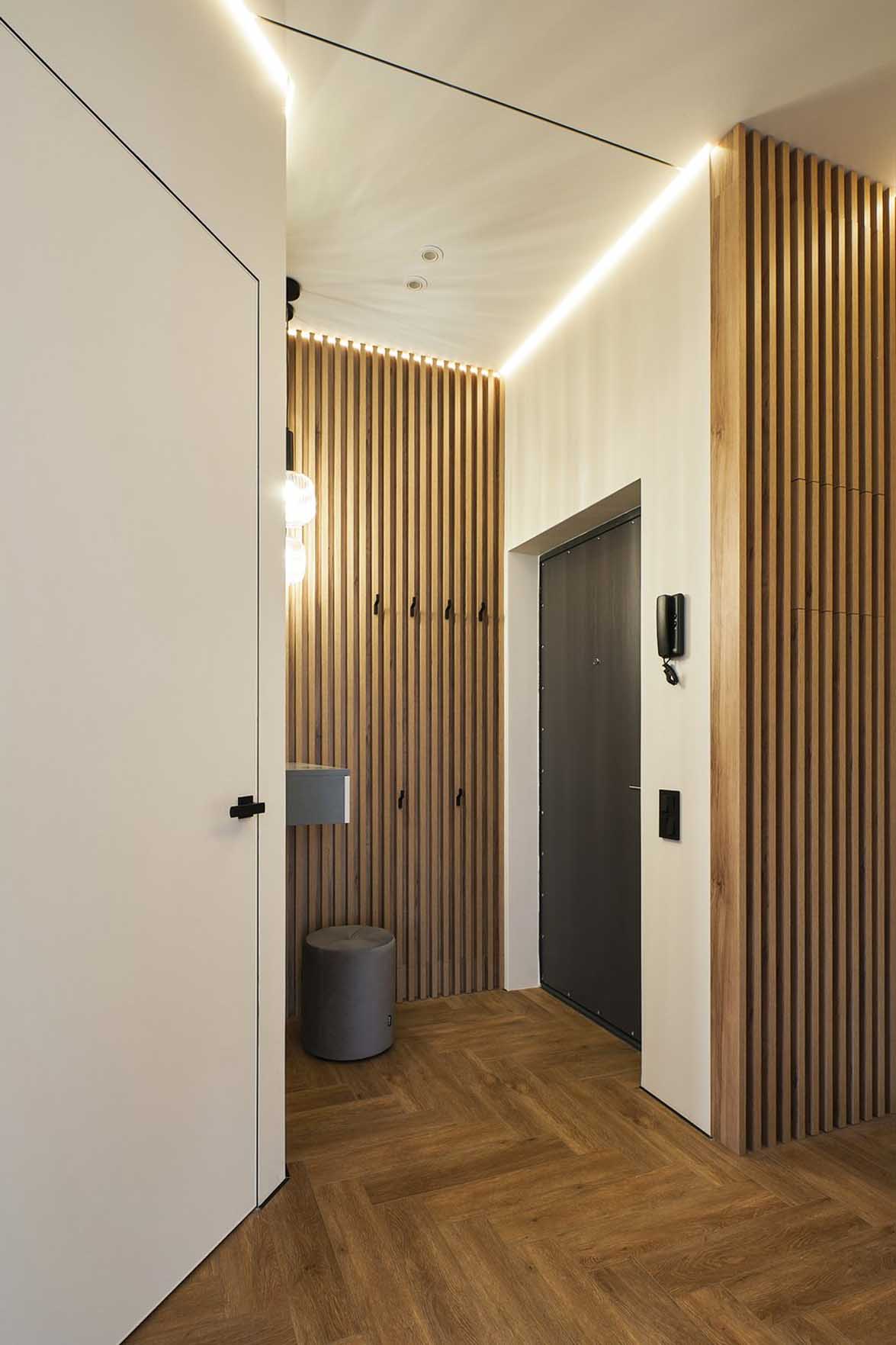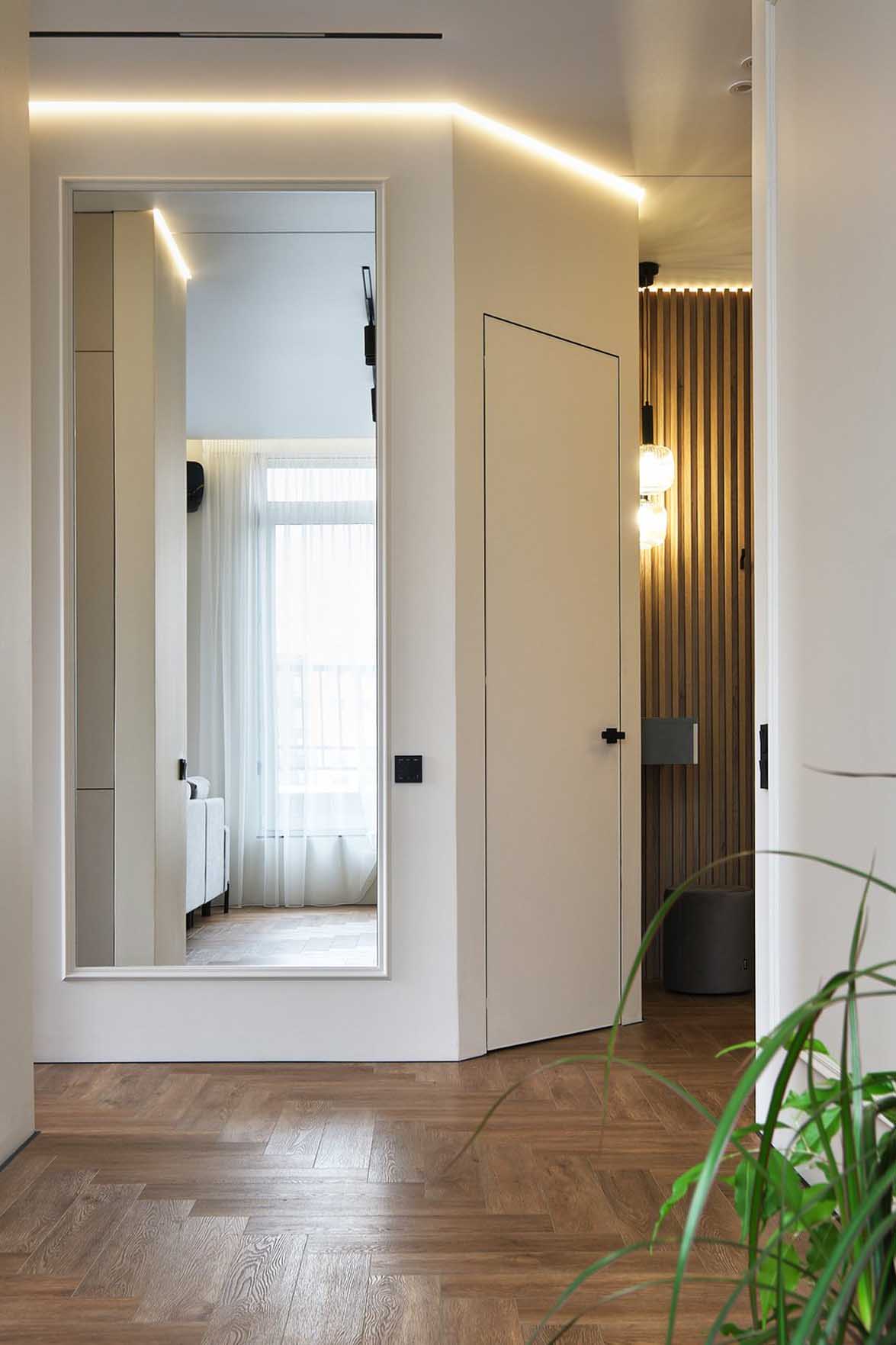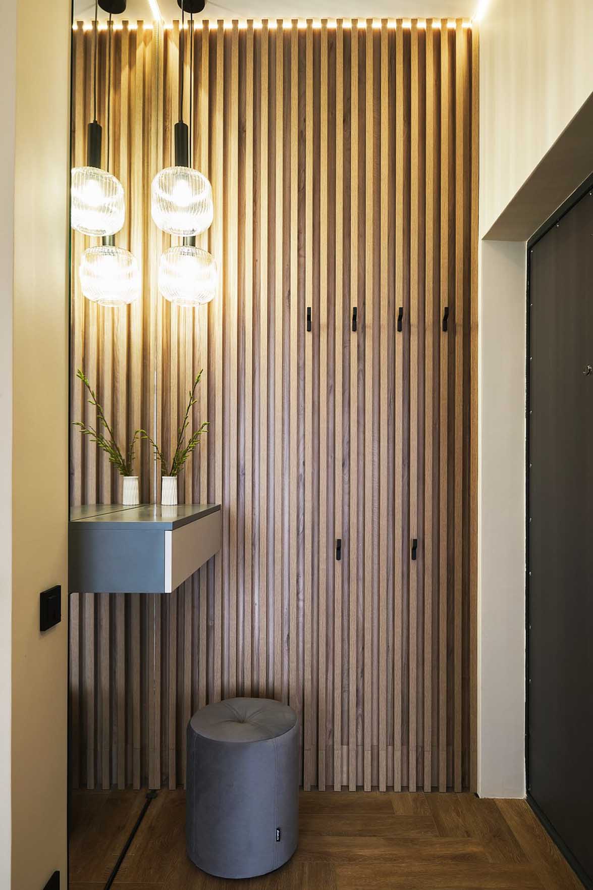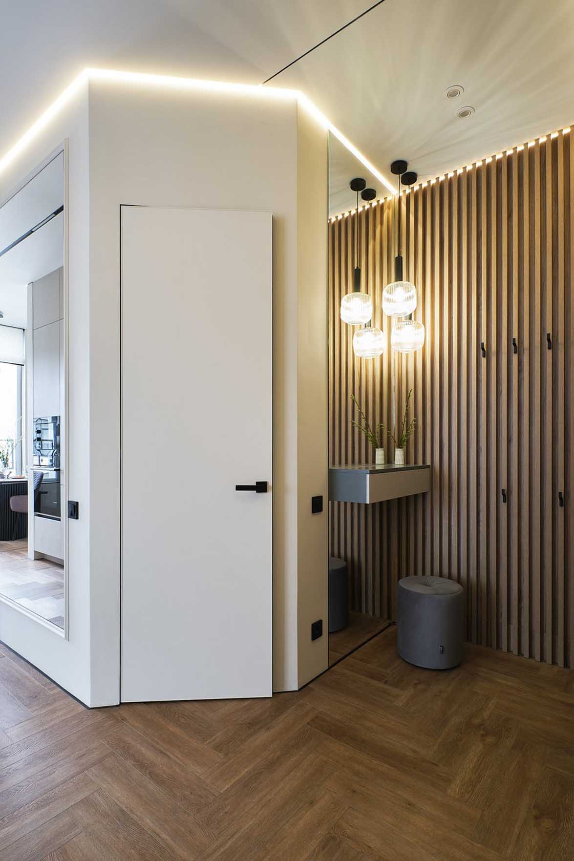 A lakásba belépve azonnal érvényesül a térnövelő design: a bejárattal szemben elhelyezett nagyméretű tükör, valamint a konyhával szemközti tükörfelület – amely a terasz ablakát tükrözi vissza – megkettőzi a teret és mélységet ad az előszobának. A tárolást rendkívül praktikusan oldották meg: egy önálló gardróbhelyiséget választottak le, amely kamraként vagy klasszikus tárolóként is funkcionálhat, így mentesítve a közlekedőt a felesleges bútoroktól.