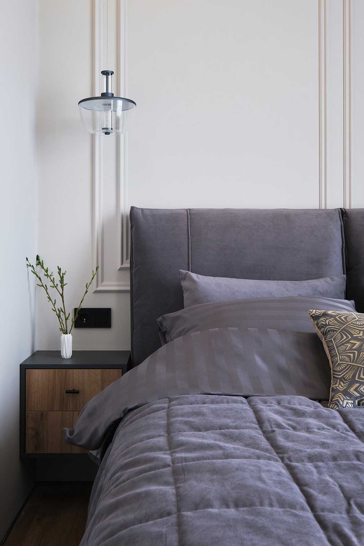 A falak mozgatásával nyert extra terület lehetővé tette, hogy a hálószoba funkcionalitását növeljék – a franciaágy mellett helyet kapott egy tágas gardróbszekrény és egy elegáns fésülködőasztal is. A dekoráció a textúrák játékára épül: az ágytámla mögötti falfelületet meleg tónusú fa panelek és klasszikus stukkók váltakozása teszi izgalmassá. A mennyezet peremén körbefutó rejtett világítás mélységet ad a szobának, míg a puha, párnázott háttámlájú ágy az olvasáshoz is maximális kényelmet biztosít.