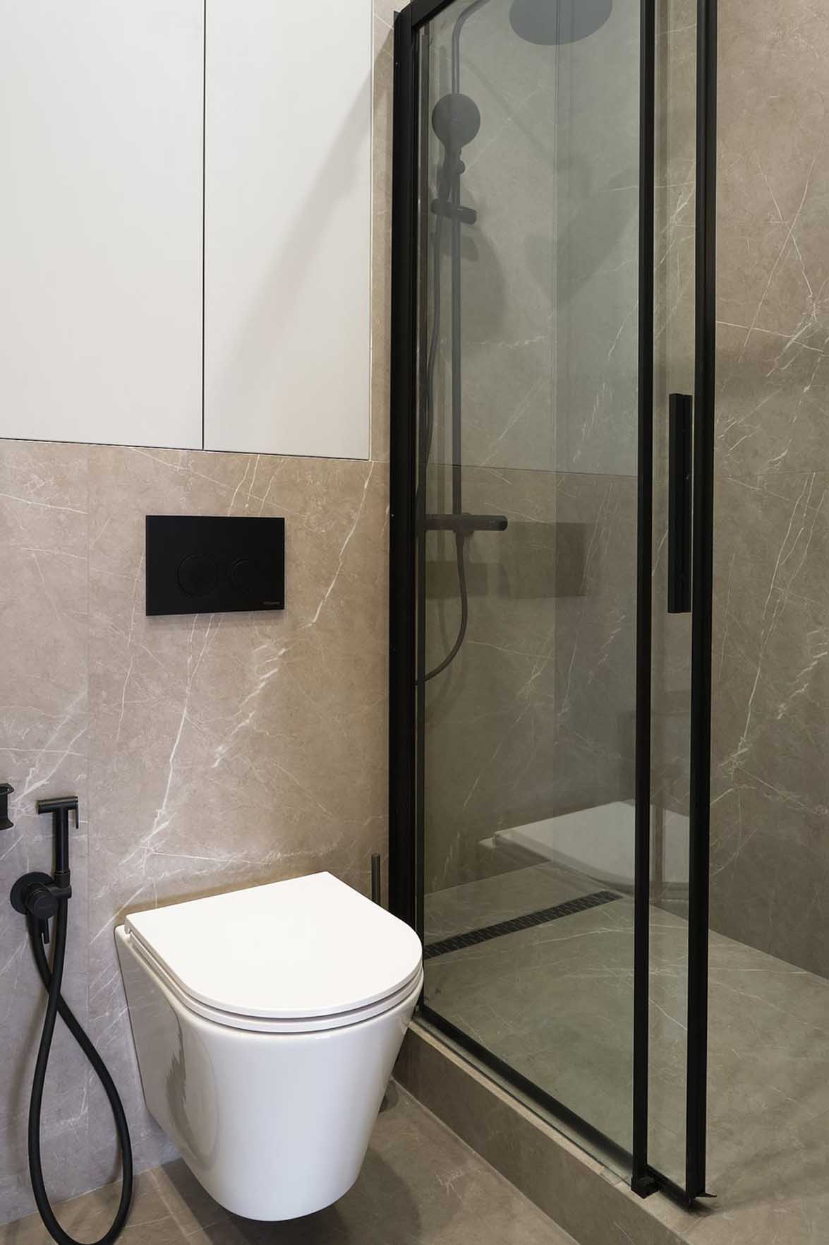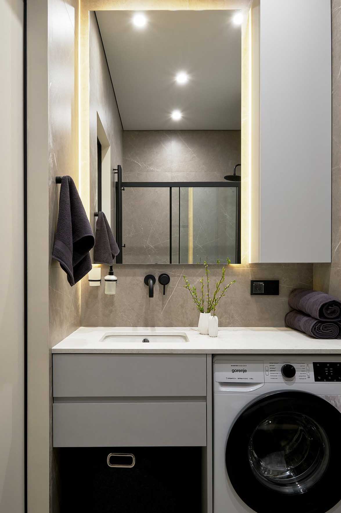A vizesblokk tervezésénél a maximális helykihasználás volt az irányadó. A tágas, épített zuhanyzó mellett számos tárolási lehetőséget alakítottak ki. A háztartási szerek a WC feletti beépített szekrényben kaptak helyet, míg a kozmetikumok számára a tükör melletti polcrendszer és a mosdó alatti fiókos elem kínál rendezett tárolást. A letisztult felületek és az átgondolt világítás itt is a tágas, modern összhatást erősítik.