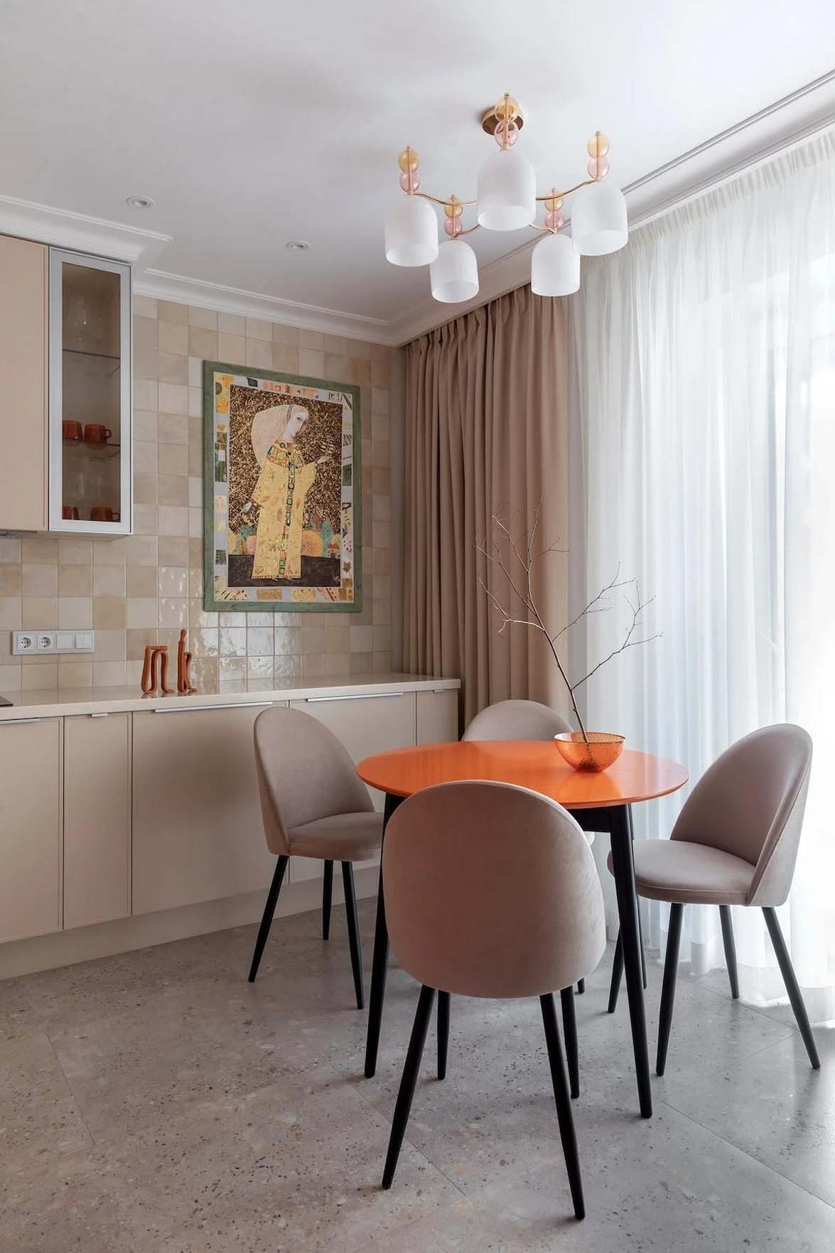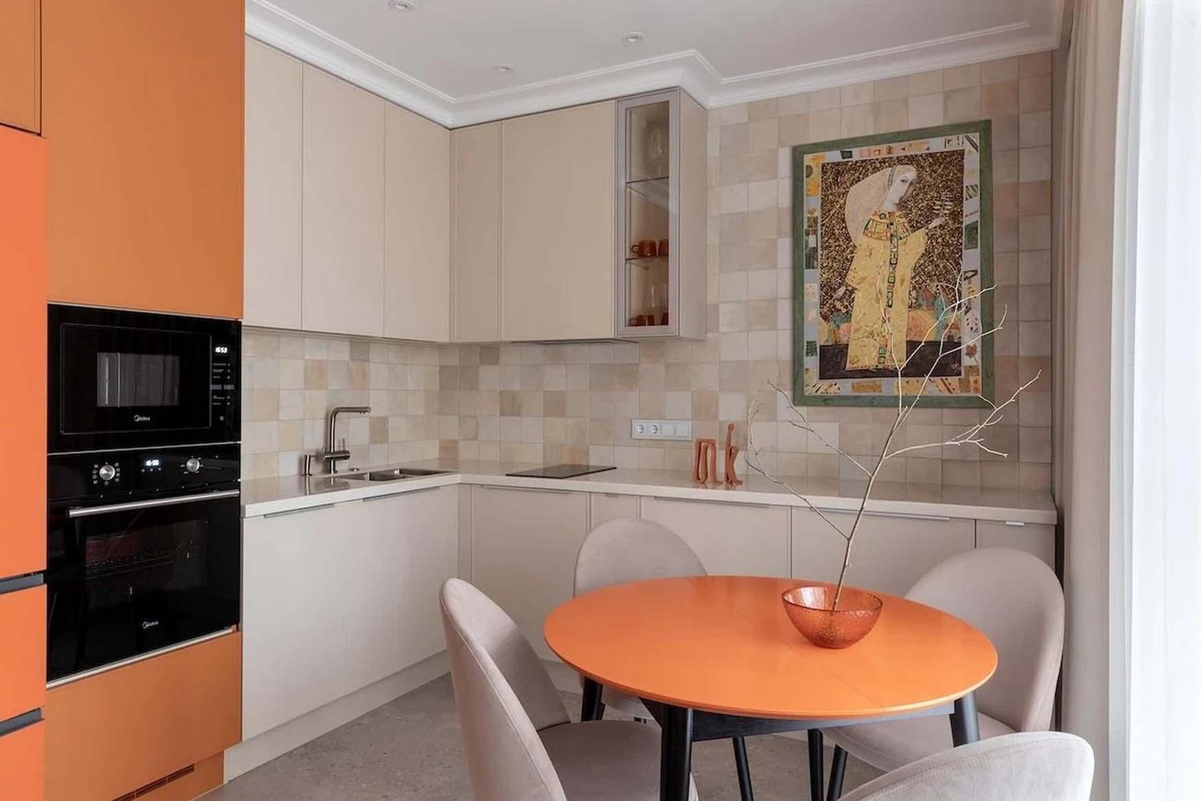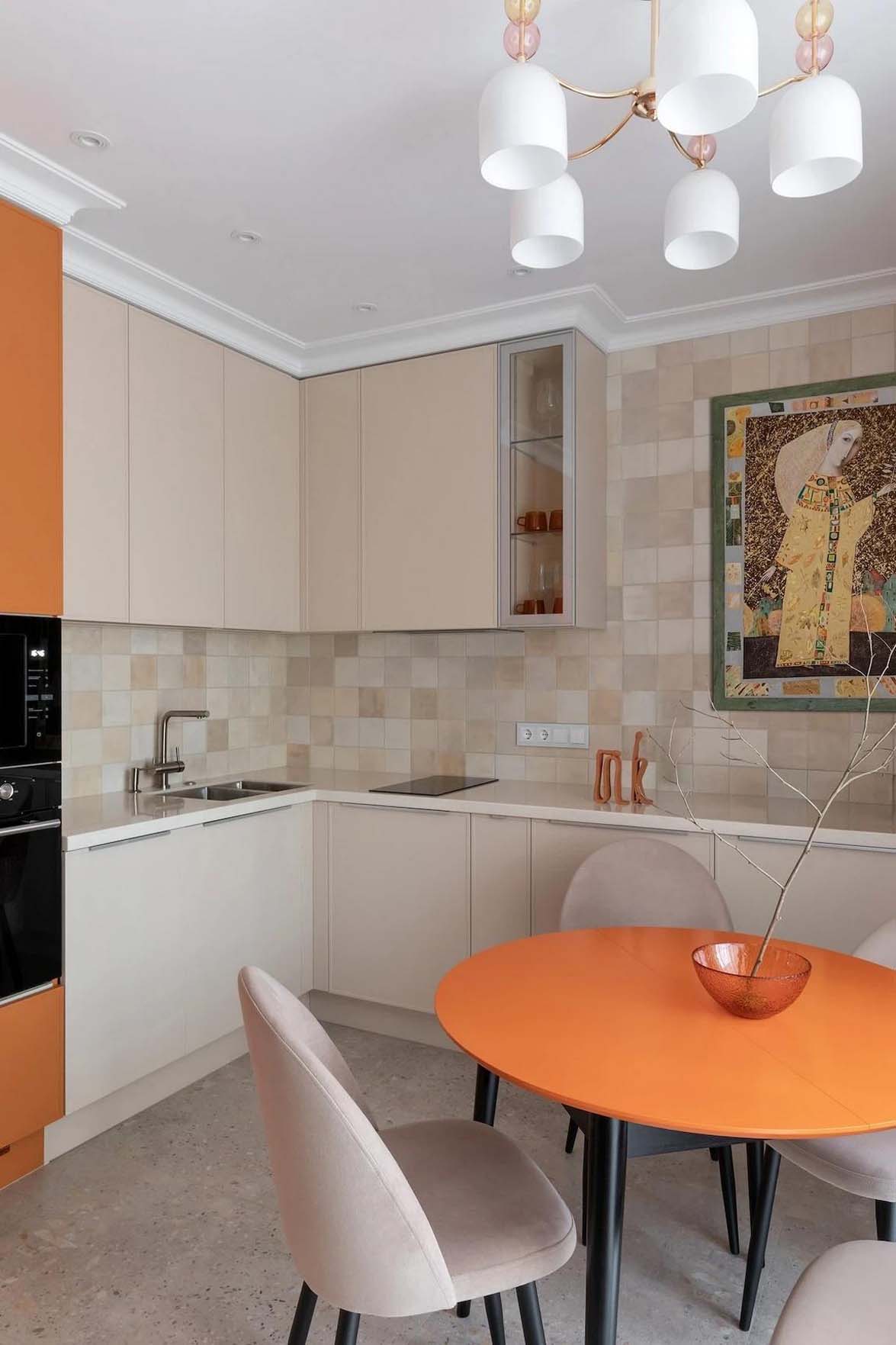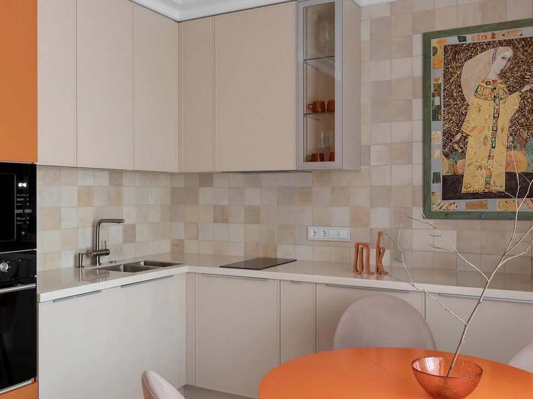 A konyha a lakás központja, amely a fő közösségi tér szerepét tölti be. A konyhabútor frontjain a bézs és a narancs színek modern és dinamikus kombinációt alkotnak, míg a falakat négyzet alakú, kézműves hatású csempe borítja. A térben a tulajdonos kérésének megfelelően egy teljes értékű, beépített gépekkel felszerelt konyhabútor, egy négyszemélyes, szintén narancsszínű étkezőasztal, egy kompakt, kihúzható kanapé, valamint egy vitrines szekrénnyel egybeépített bárpult is helyet kapott. A padlón semleges, szürkés-bézs árnyalatú, terrazzo hatású greslapot helyeztek el, amely nyugodt hátteret biztosít a színes bútoroknak és kiegészítőknek.