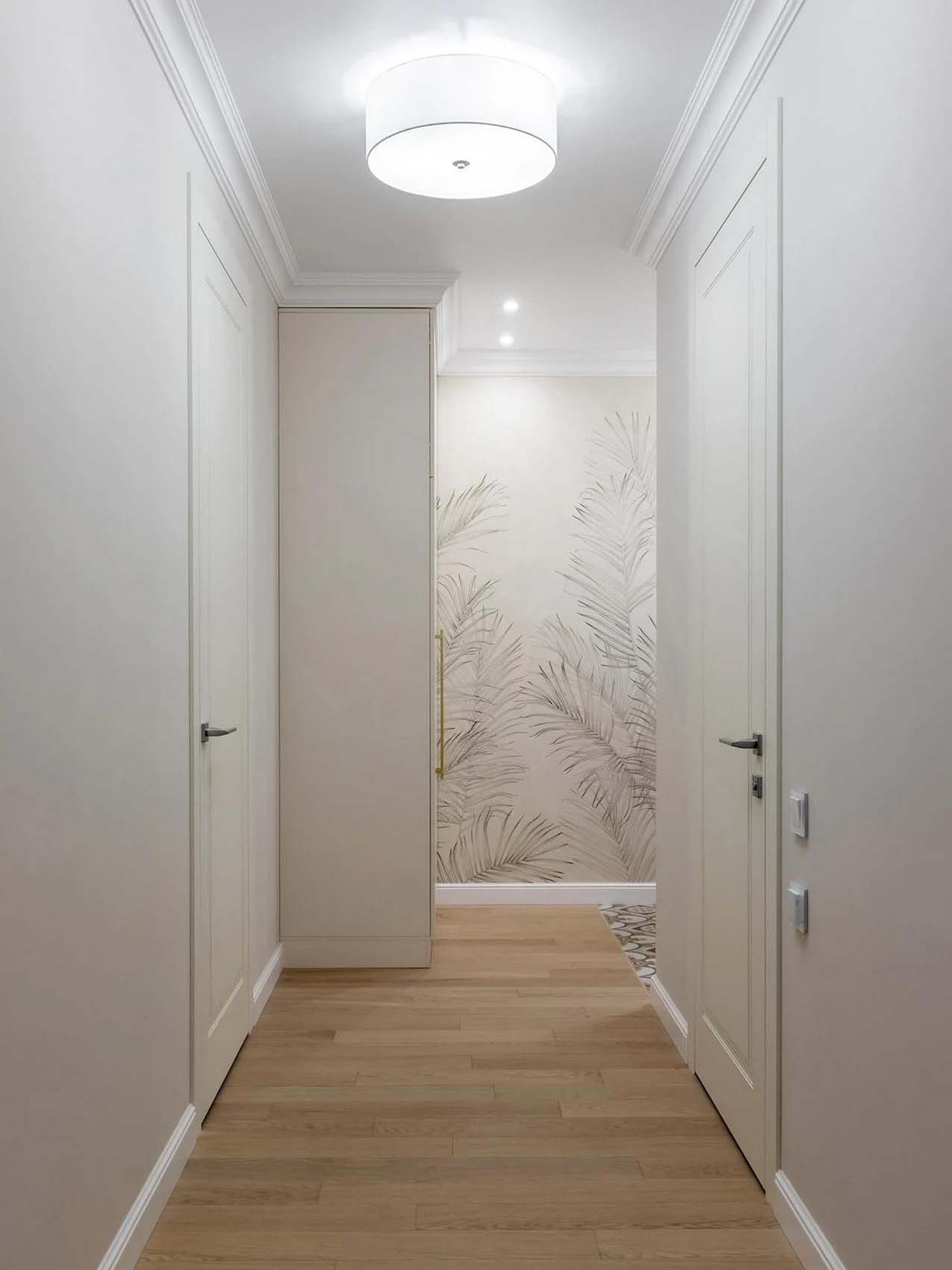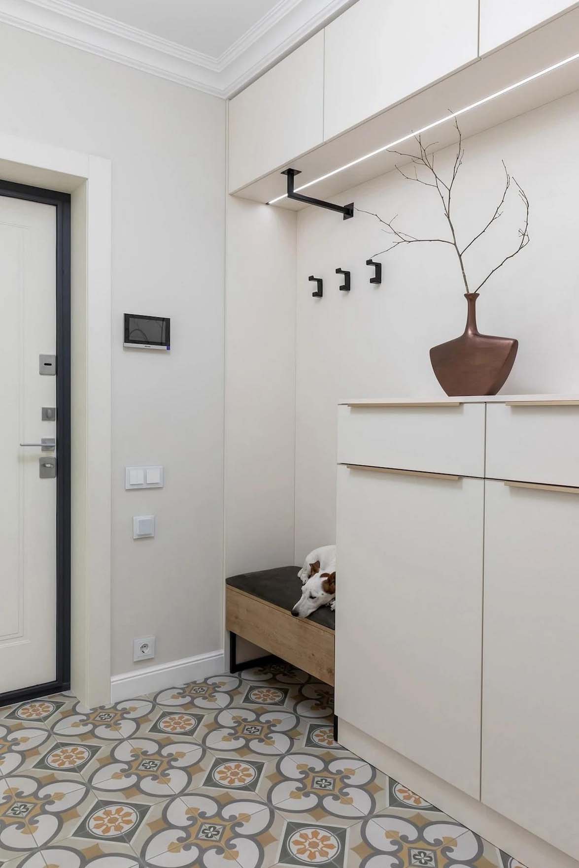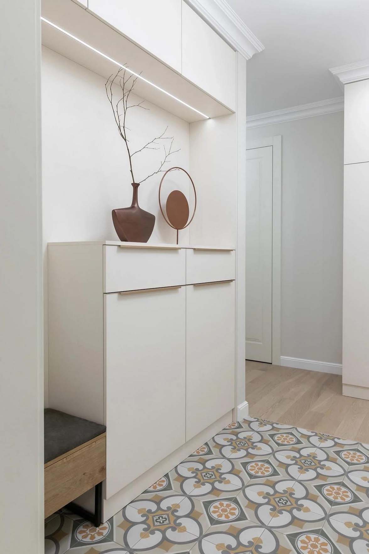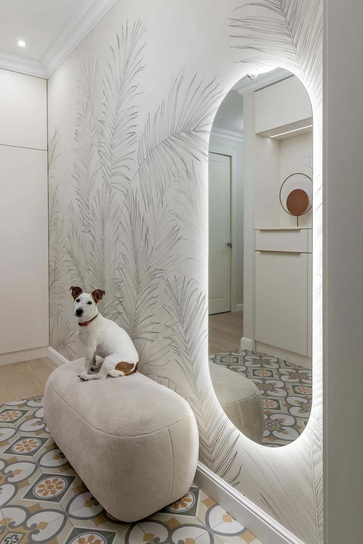 A padlón aktív, geometrikus mintázatú és cementlap hatású burkolat adja meg az alaphangulatot, és stílusosan választja el a bejárati zónát a lakás többi részétől. A tárolásról egy teljes falat elfoglaló, beépített bútoregyüttes gondoskodik, amely magában foglal egy cipőtartóval kombinált padot, felső szekrényeket, valamint akasztókat és egy sínt a kabátoknak. A falon trópusi leveleket ábrázoló tapéta fut végig, amelynek finom rajzolatát egy nagyméretű, ovális, háttérvilágítással ellátott tükör emel ki, növelve a térérzetet.