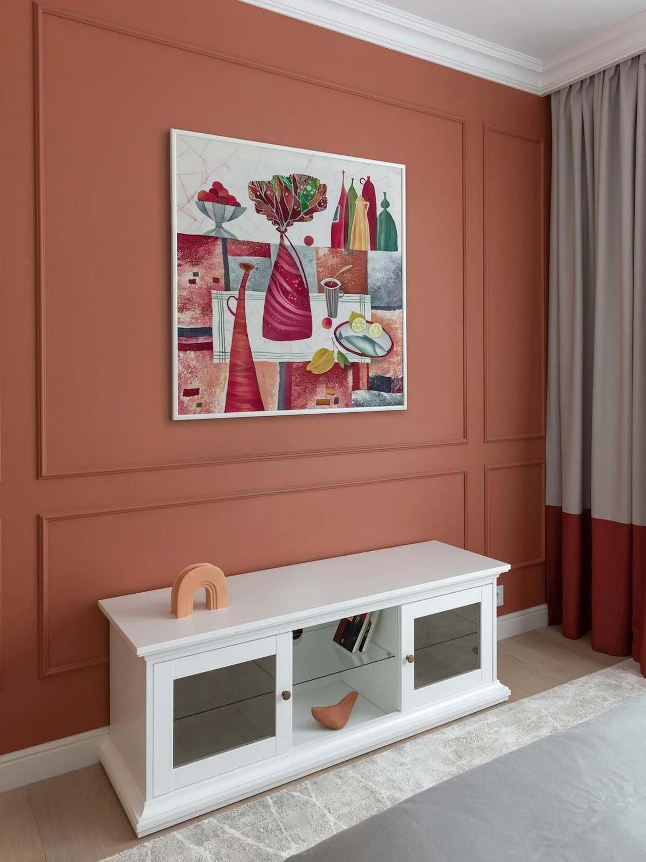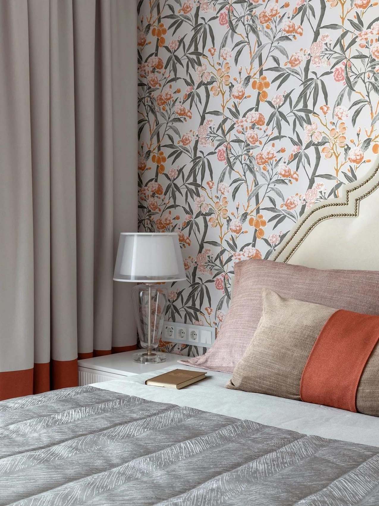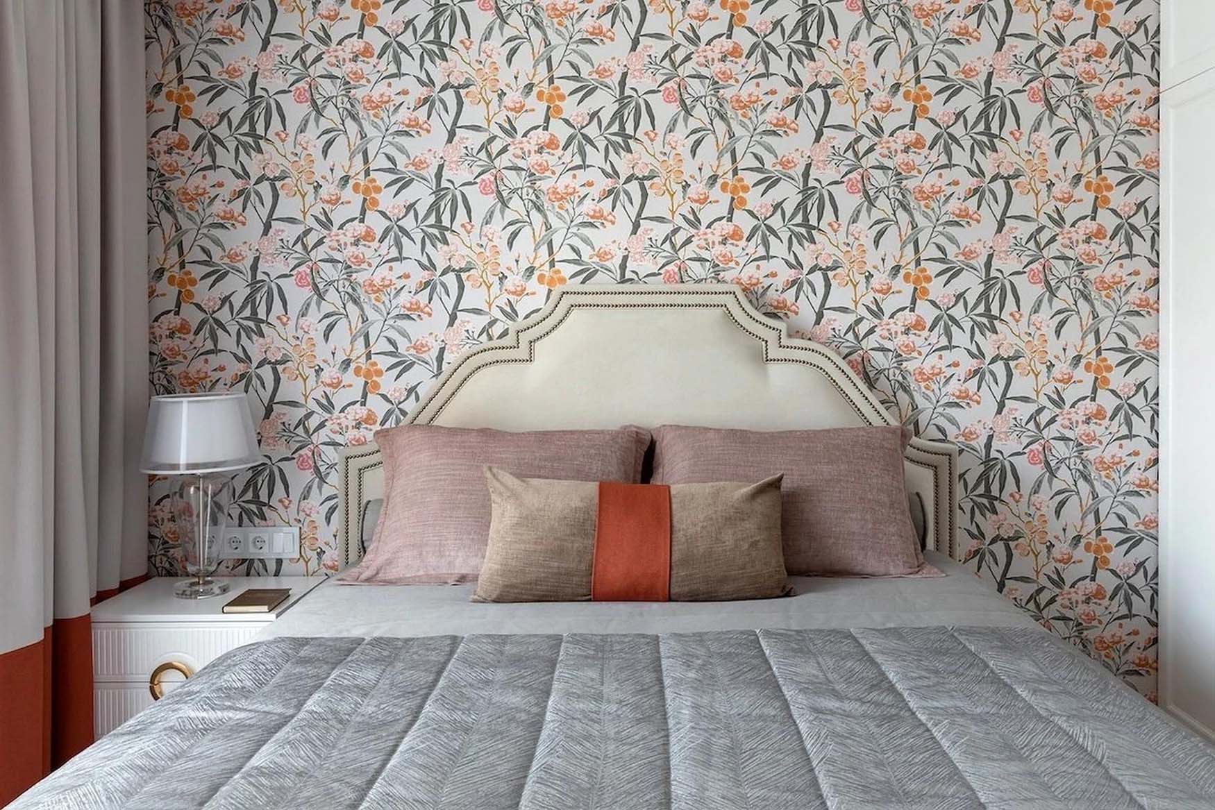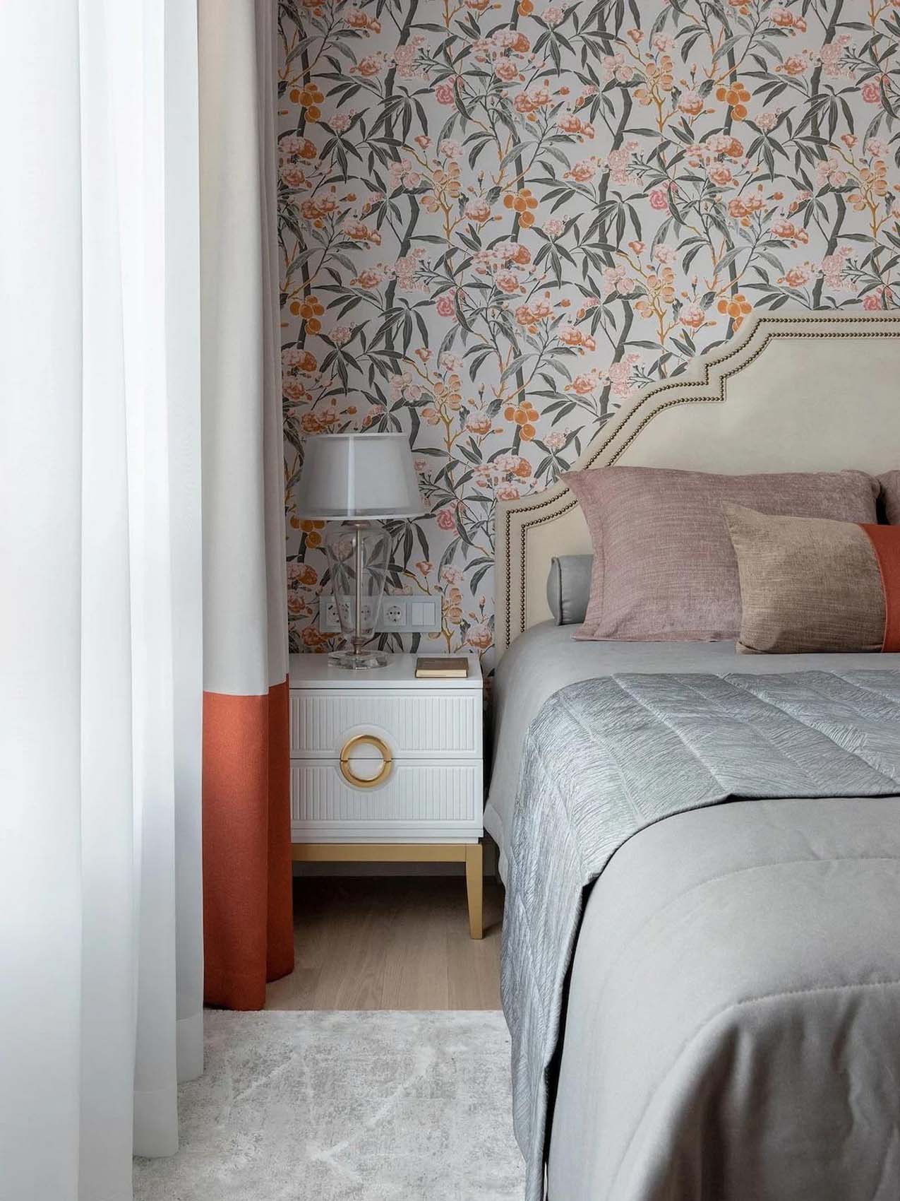 A lakás két hálószobája a lakók eltérő ízlését tükrözi, miközben a narancs és a zöld árnyalatai finoman összekapcsolják a tereket. Az anya hálószobájában a meleg tónusok uralkodnak. Az ágy mögötti falat egy apró narancs és rózsaszín virágokkal díszített, botanikus mintájú tapéta borítja, amelyhez egy elegáns, szegecsekkel díszített, kárpitozott ágytámla csatlakozik. A szoba többi falát élénk terrakotta és bézs színekre festették, a klasszikus hangulatot pedig diszkrét díszlécek és magas mennyezeti szegélyek erősítik. A gardrób mellett egy tágas, beépített szekrény is helyet kapott, amely nyitott polcos résszel kínál helyet a könyveknek és a dekorációnak.
