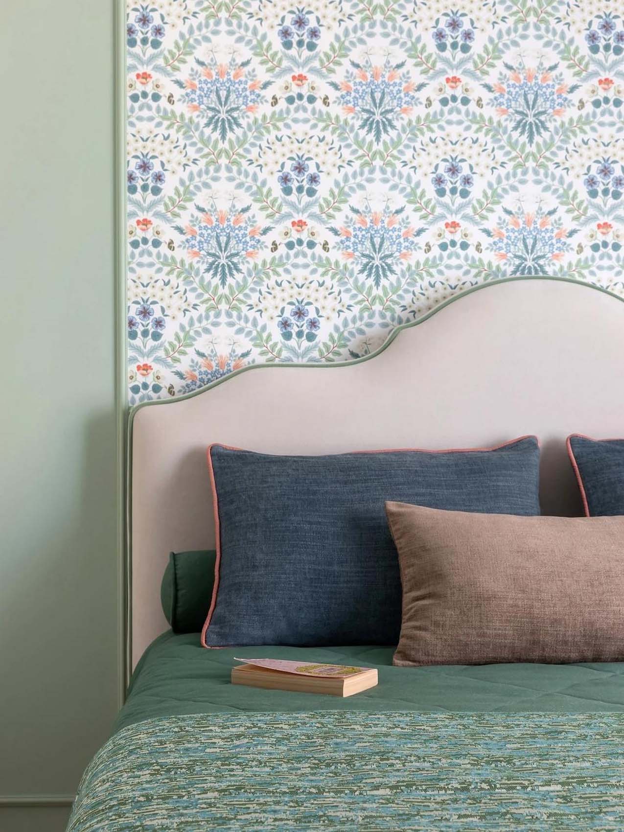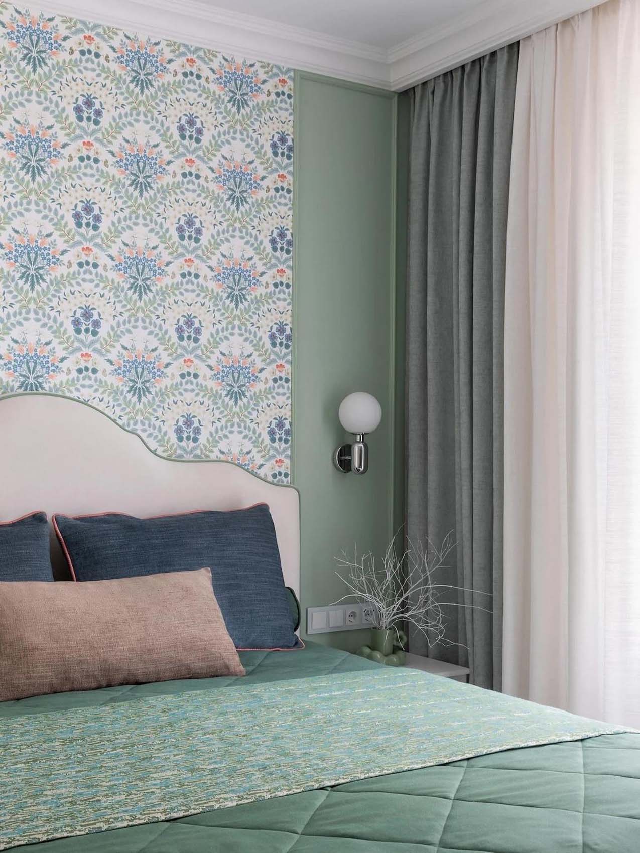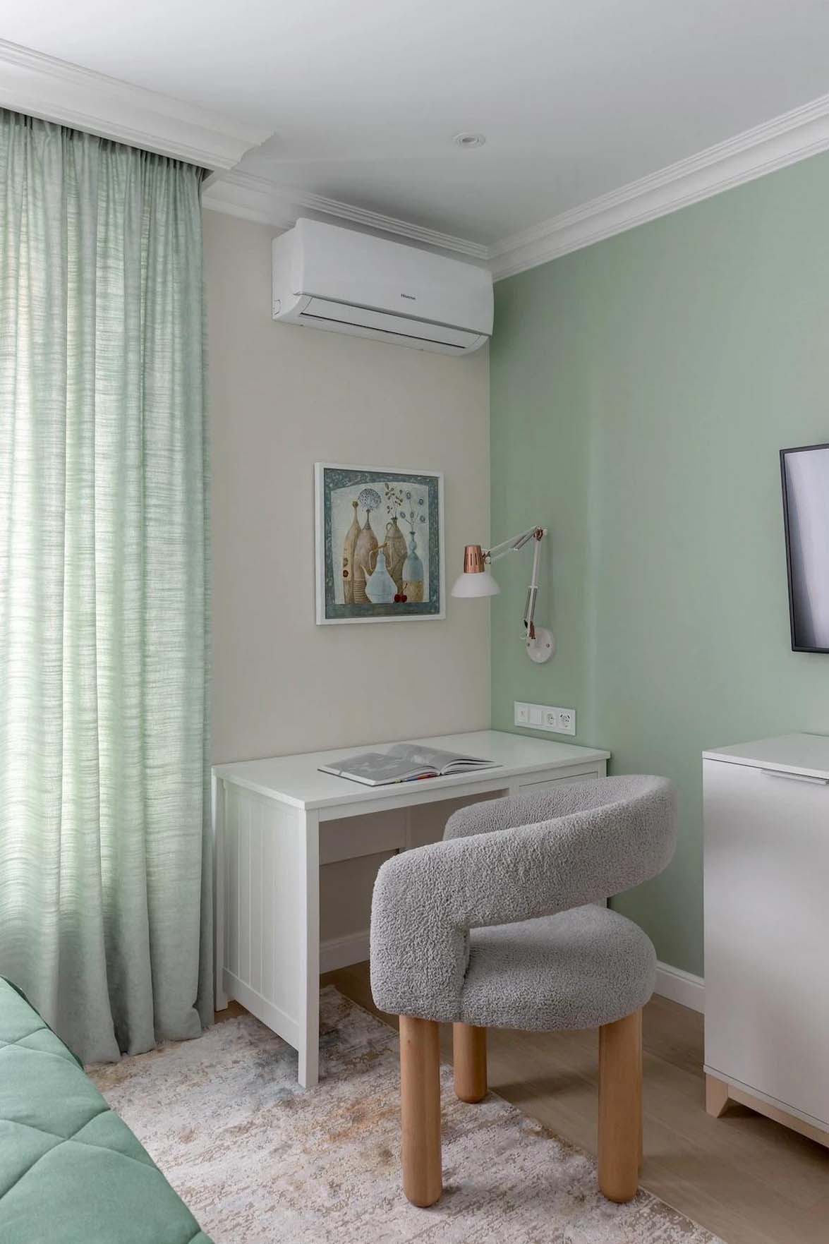 A lány hálószobájának fő színe a zöld, amelynek különböző árnyalatai harmonizálnak a kiegészítőkön megjelenő kék tónusokkal. Az ágy mögötti falon itt is egyedi tapéta látható, amelynek sűrű, szimmetrikus mintázatában a zöldek és kékek mellett diszkréten megjelennek a narancs árnyalatai is, finom kapcsolatot teremtve a lakás többi helyiségével. A tárolást az ajtó két oldalán elhelyezett két beépített szekrény oldja meg, amelyek közül az egyik szintén rendelkezik nyitott polcos elemmel. A szobában egy kompakt dolgozósarkot is kialakítottak.