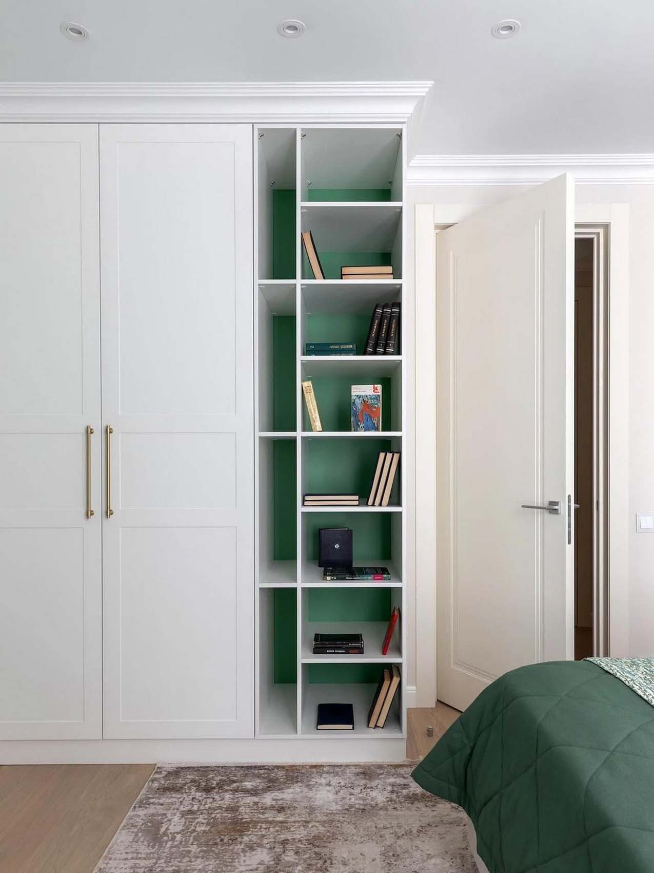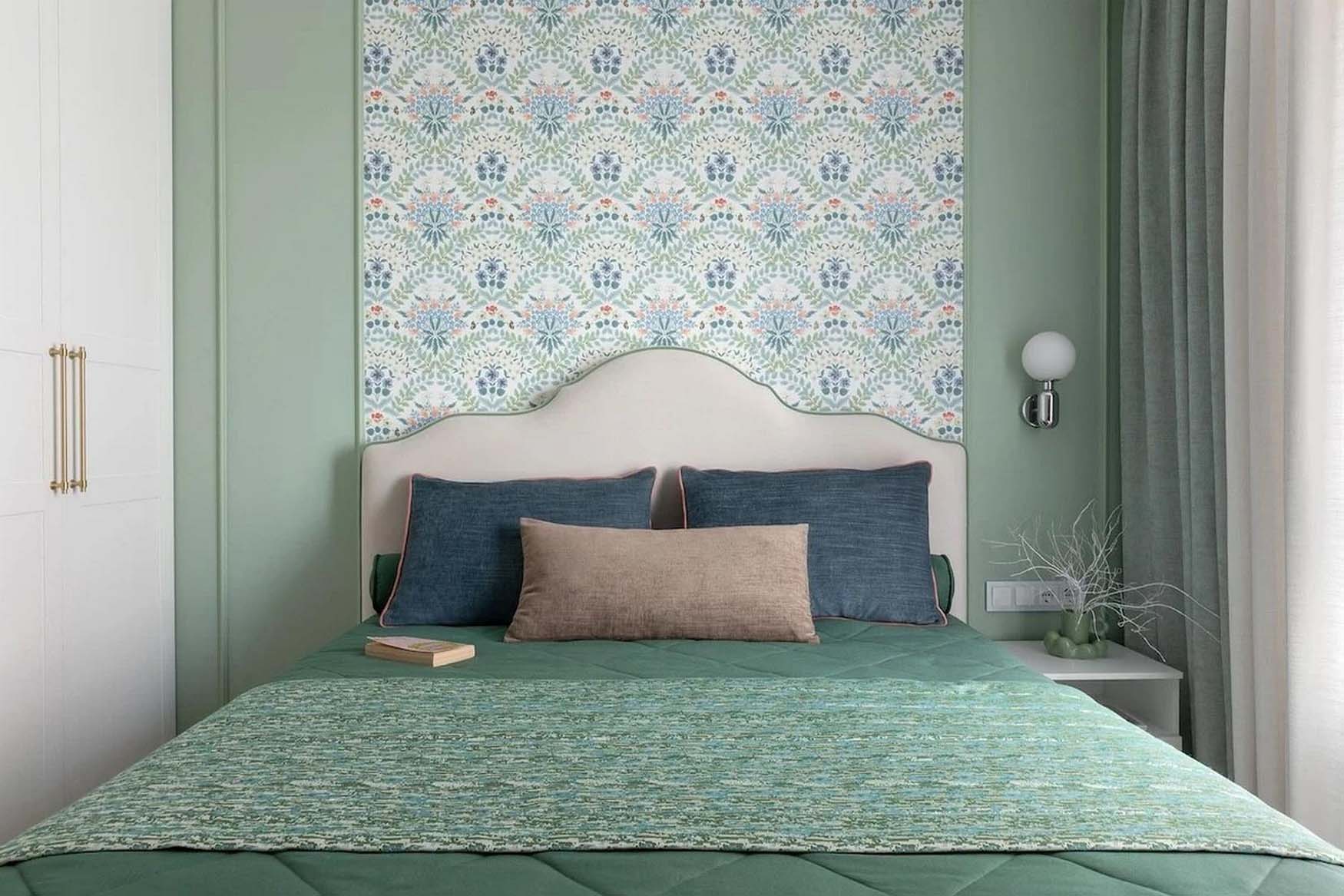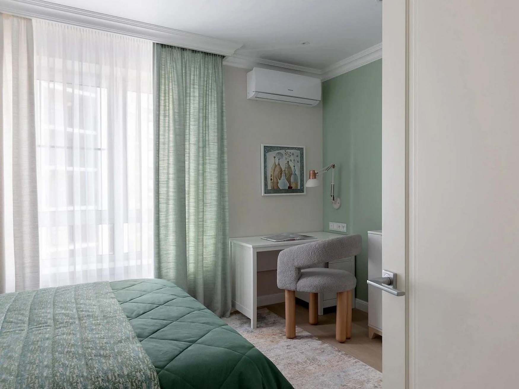 A lány hálószobájának fő színe a zöld, amelynek különböző árnyalatai harmonizálnak a kiegészítőkön megjelenő kék tónusokkal. Az ágy mögötti falon itt is egyedi tapéta látható, amelynek sűrű, szimmetrikus mintázatában a zöldek és kékek mellett diszkréten megjelennek a narancs árnyalatai is, finom kapcsolatot teremtve a lakás többi helyiségével. A tárolást az ajtó két oldalán elhelyezett két beépített szekrény oldja meg, amelyek közül az egyik szintén rendelkezik nyitott polcos elemmel. A szobában egy kompakt dolgozósarkot is kialakítottak.