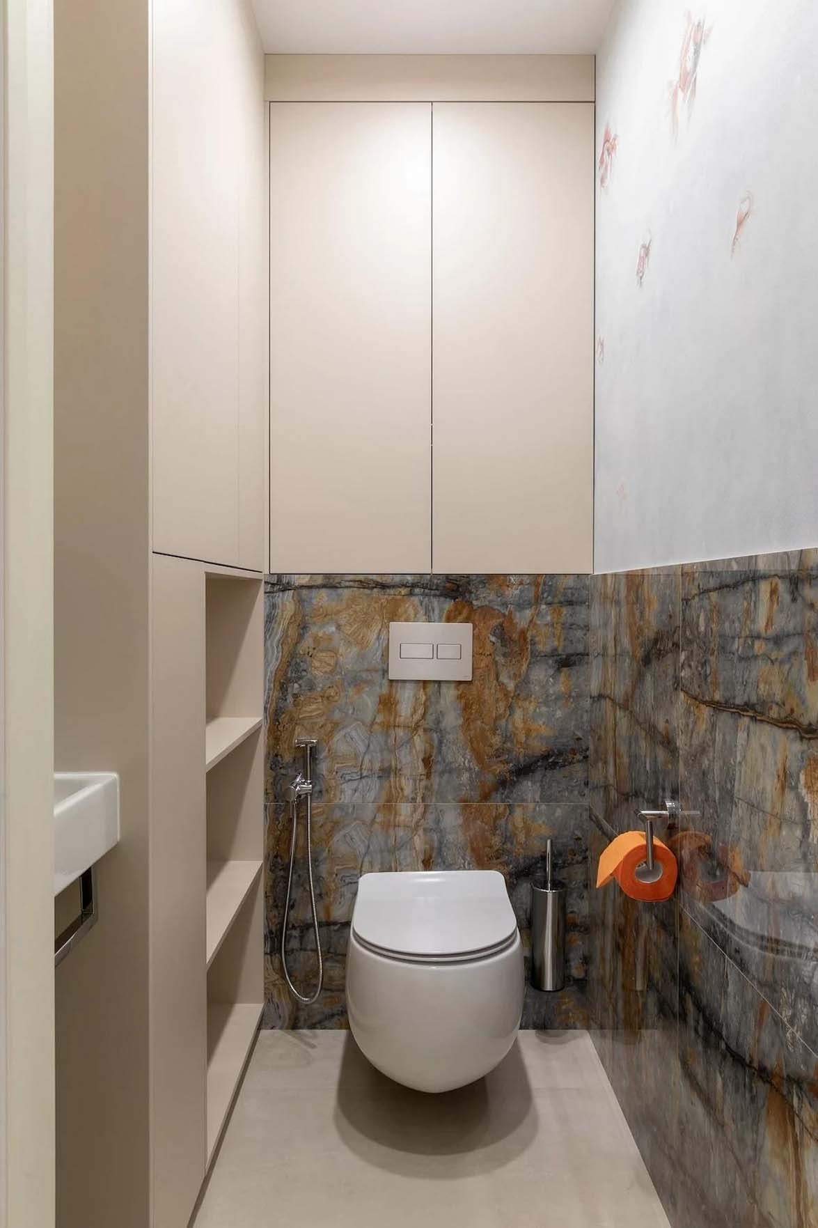 A különálló mellékhelyiség drámaibb hangulatú. Az alsó falszakaszt egy karakteres, narancsos-rozsdás erezettel átszőtt, sötét márványhatású greslappal burkolták, amely izgalmas kontrasztot alkot a felső, világosabb tapétával. A tárolásról itt is egyedi beépített szekrény gondoskodik a WC felett és a kis kézmosó mellett.