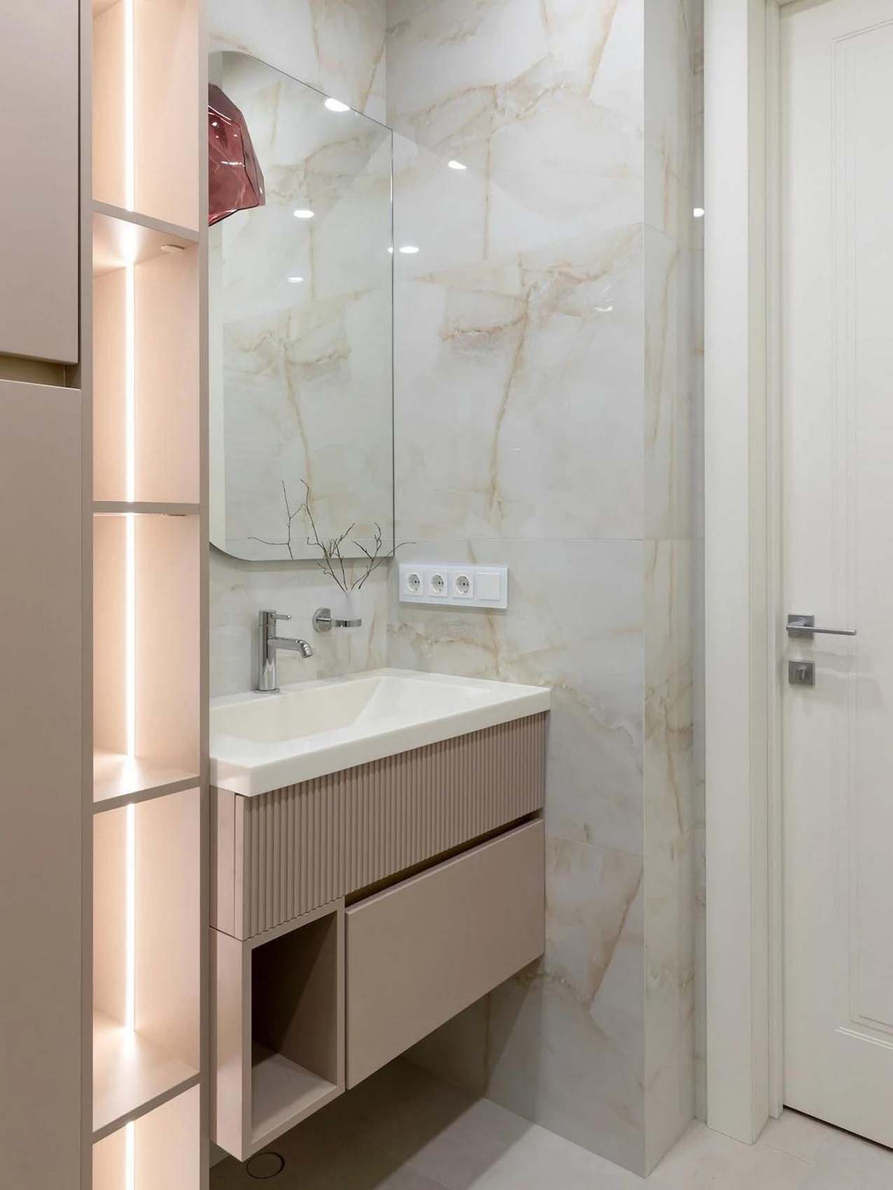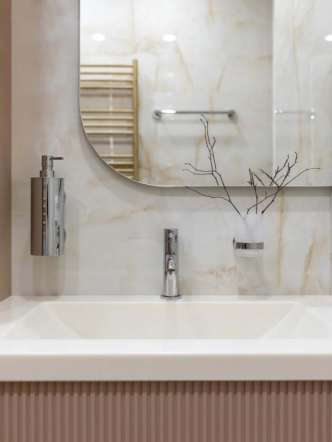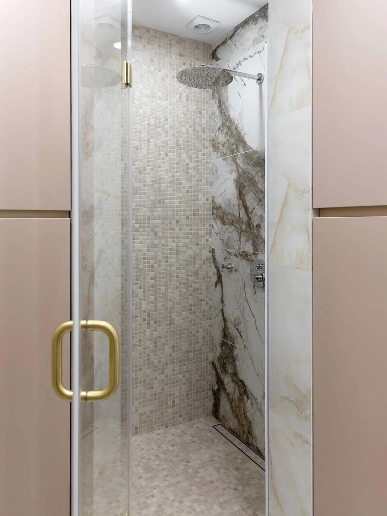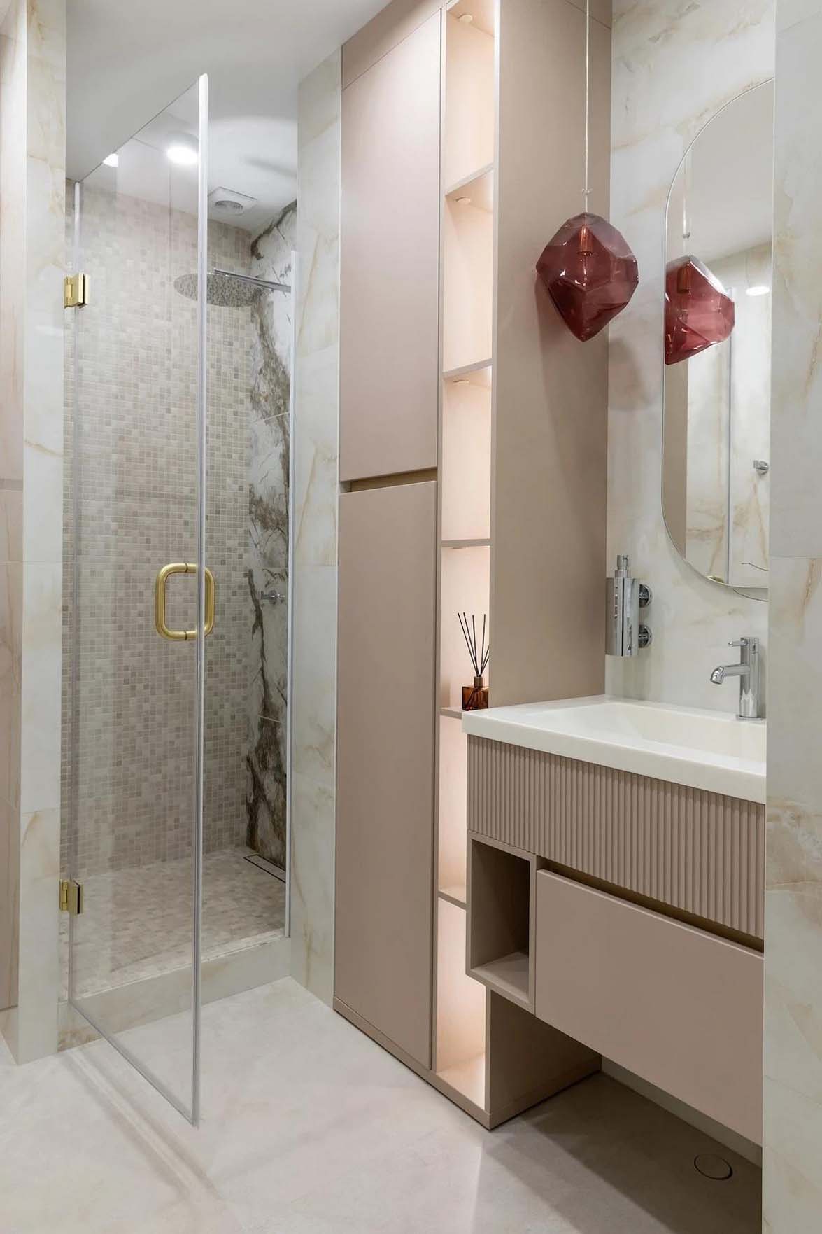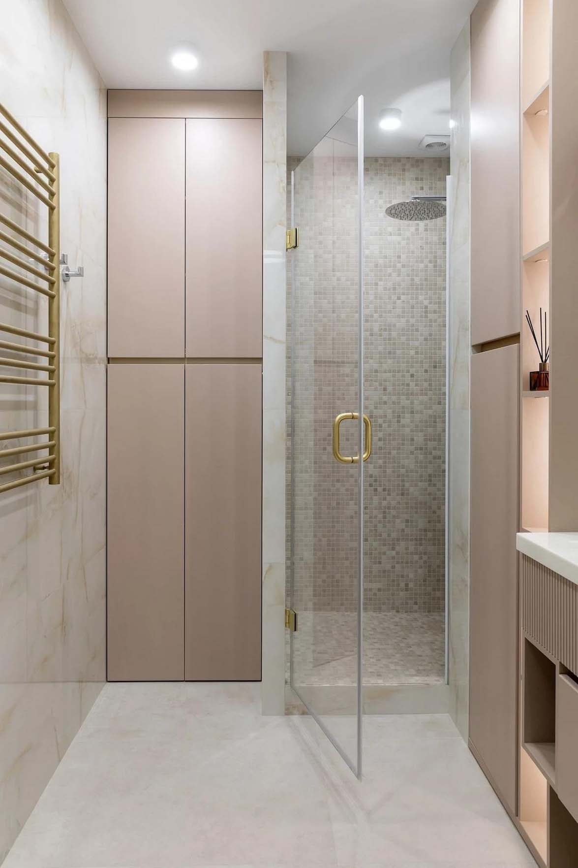 A fürdőszobában a bézs és a krém színek nyugodt és elegáns légkört teremtenek. A falakat nagyméretű, márványhatású greslapokkal burkolták, a zuhanyzó területét pedig finom mozaikkal emelték ki. A tér praktikumát egyedi tervezésű, bőséges tárolóhelyet kínáló bútorok biztosítják: a mosdó alatti, bordázott frontú szekrény, valamint egy teljes magasságú beépített szekrény, amely a mosógépet is elrejti, és nyitott, belső világítással ellátott polcokkal rendelkezik. A modern eleganciát arany és sárgaréz részletek – csaptelepek, zuhanykabin-fogantyúk és törölközőszárító – hangsúlyozzák.