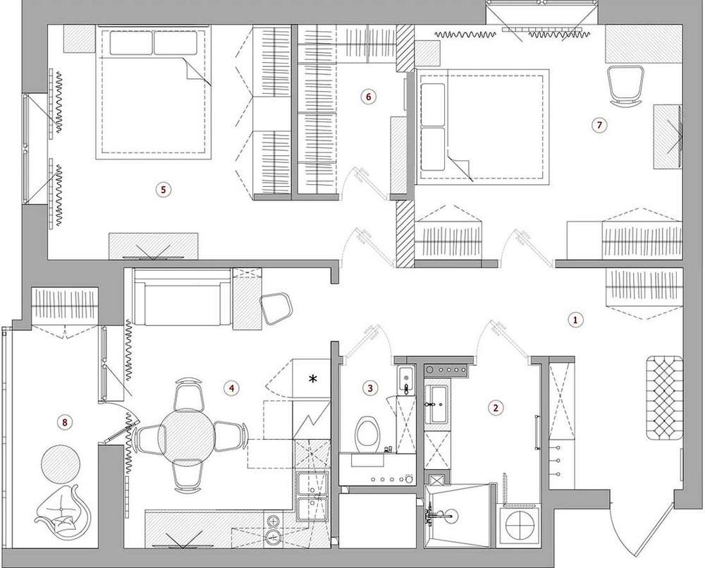 A lakás eredeti alaprajza funkcionálisnak bizonyult, így a lakberendező csupán finom, ám annál hatásosabb változtatásokat javasolt a térérzet és a kényelem növelése érdekében. A nagyobbik hálószobából egy praktikus gardróbhelyiséget választottak le. A lakás egészében a szabványos méretű ajtónyílásokat 2,3 méter magasra emelték, ami szellősebbé és nagyvonalúbbá tette a tereket, a konyha bejáratát pedig teljesen szabaddá tették. A lodzsára nyíló hagyományos ablakot egy modern, helytakarékos tolóajtós szerkezetre cserélték, ami javítja a természetes fény áramlását.