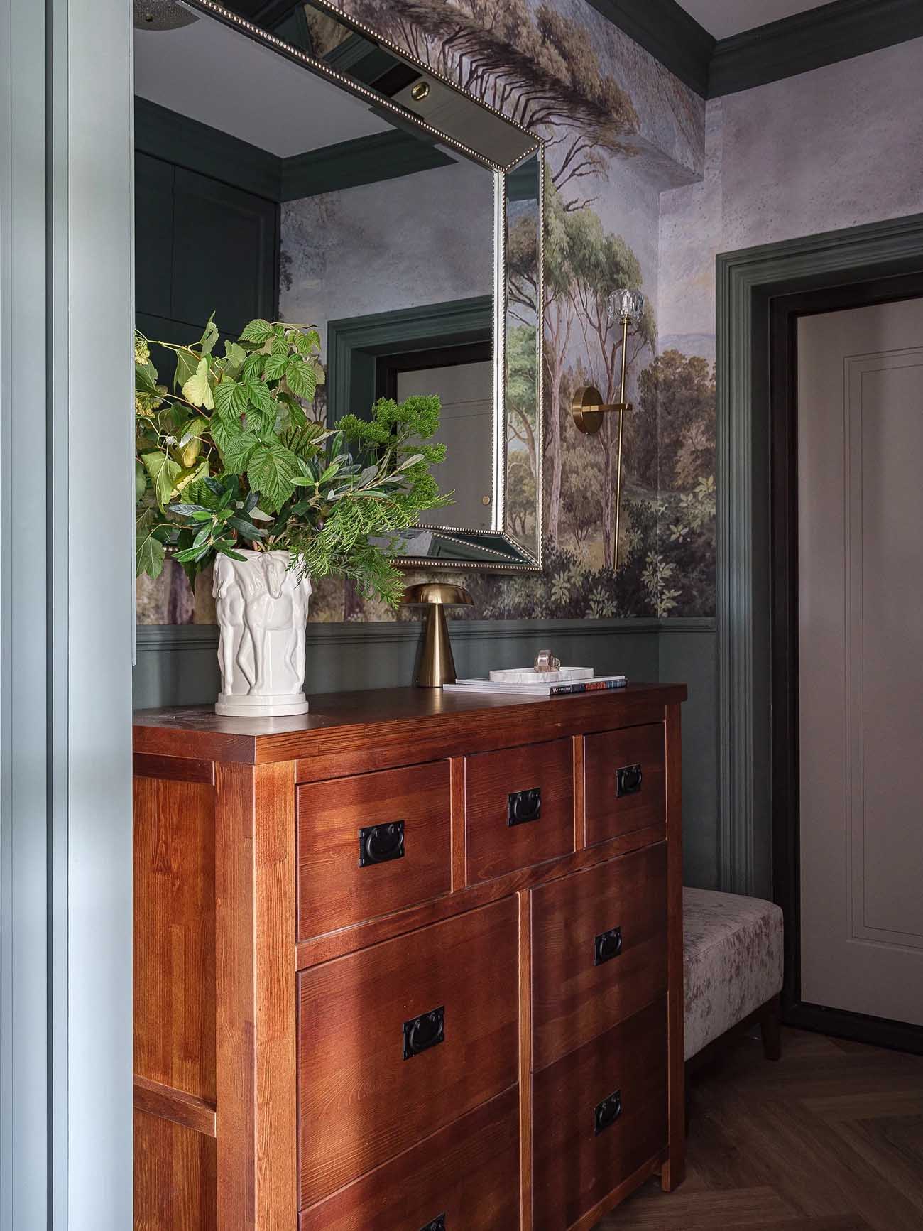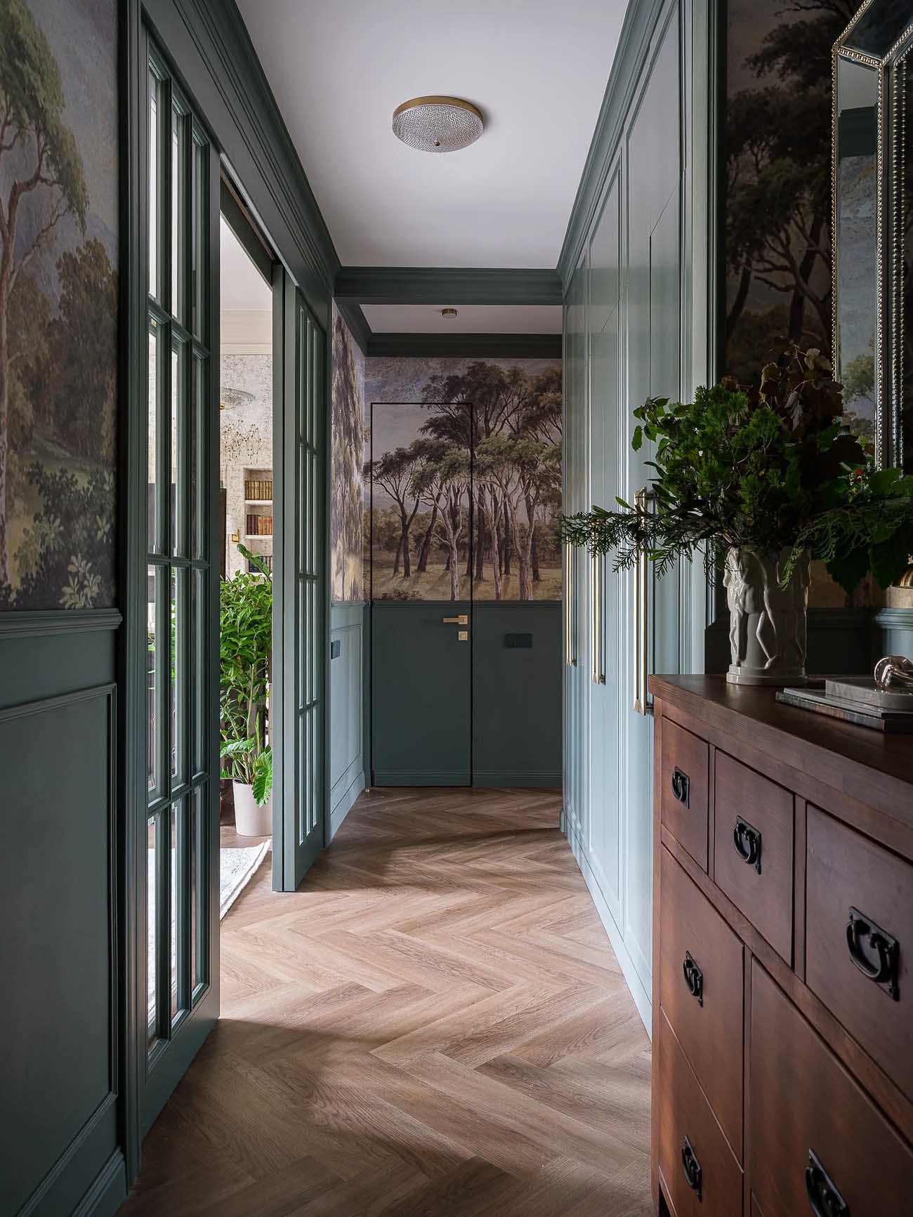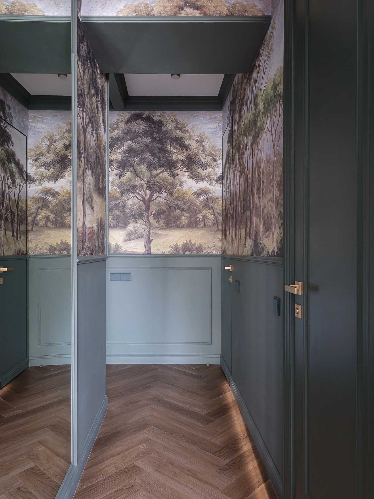 A lakásba lépve azonnal érzékelhető a természetközeli koncepció. A falak alsó harmadát sötétzöldre festették és díszlécekkel keretezték, ami klasszikus hatást kelt, míg a felső részeken egy részletgazdag, erdőt ábrázoló tapéta fut végig. A tárolást egy diszkréten a fal színébe olvadó, mélyzöld beépített szekrény, valamint egy antik komód oldja meg, megadva az alaphangot a lakás kissé eklektikus stílusához. Érdekes részlet a fal színére festett karnisok és lábazatok alkalmazása, amely egységesíti a teret.