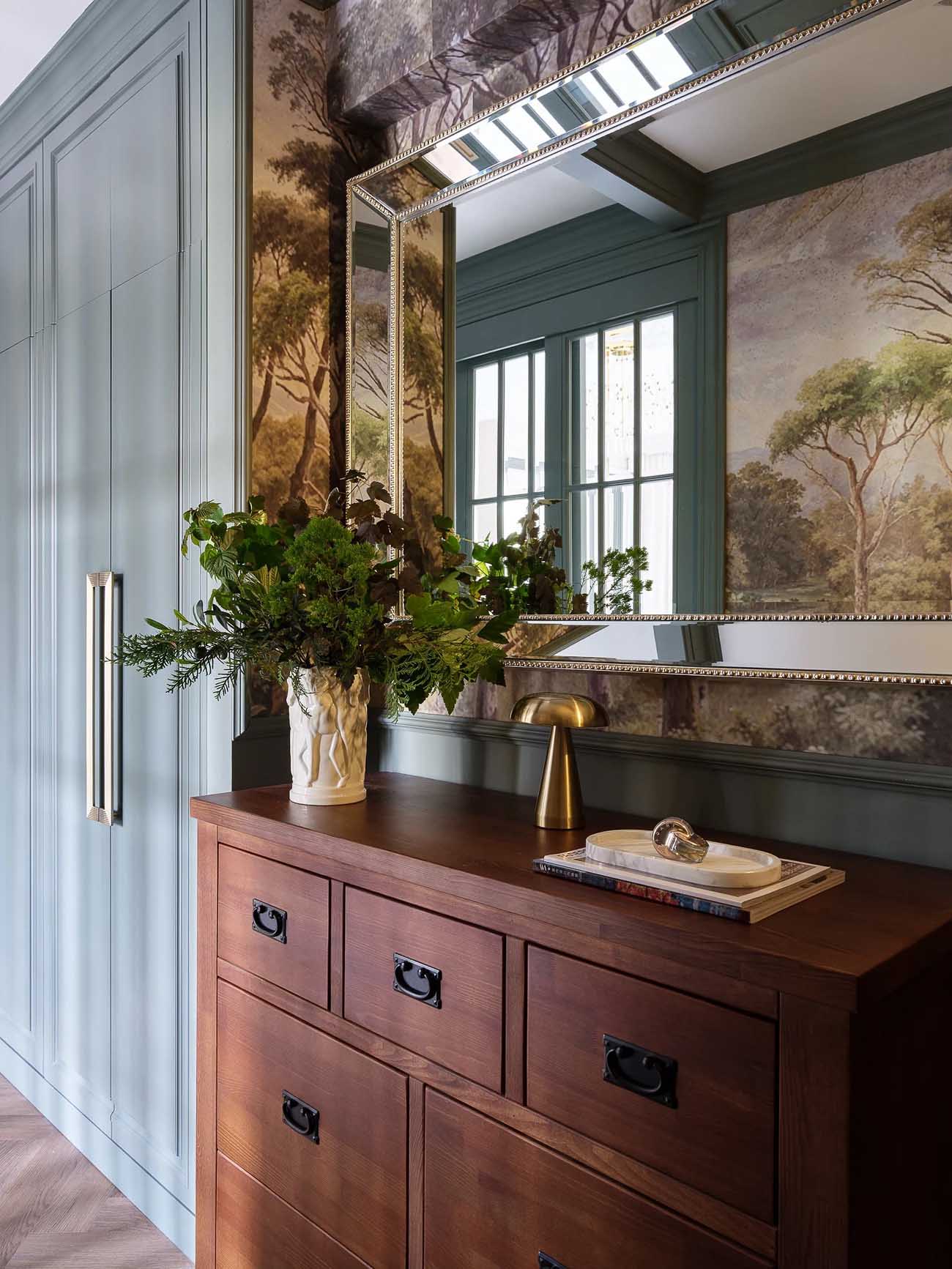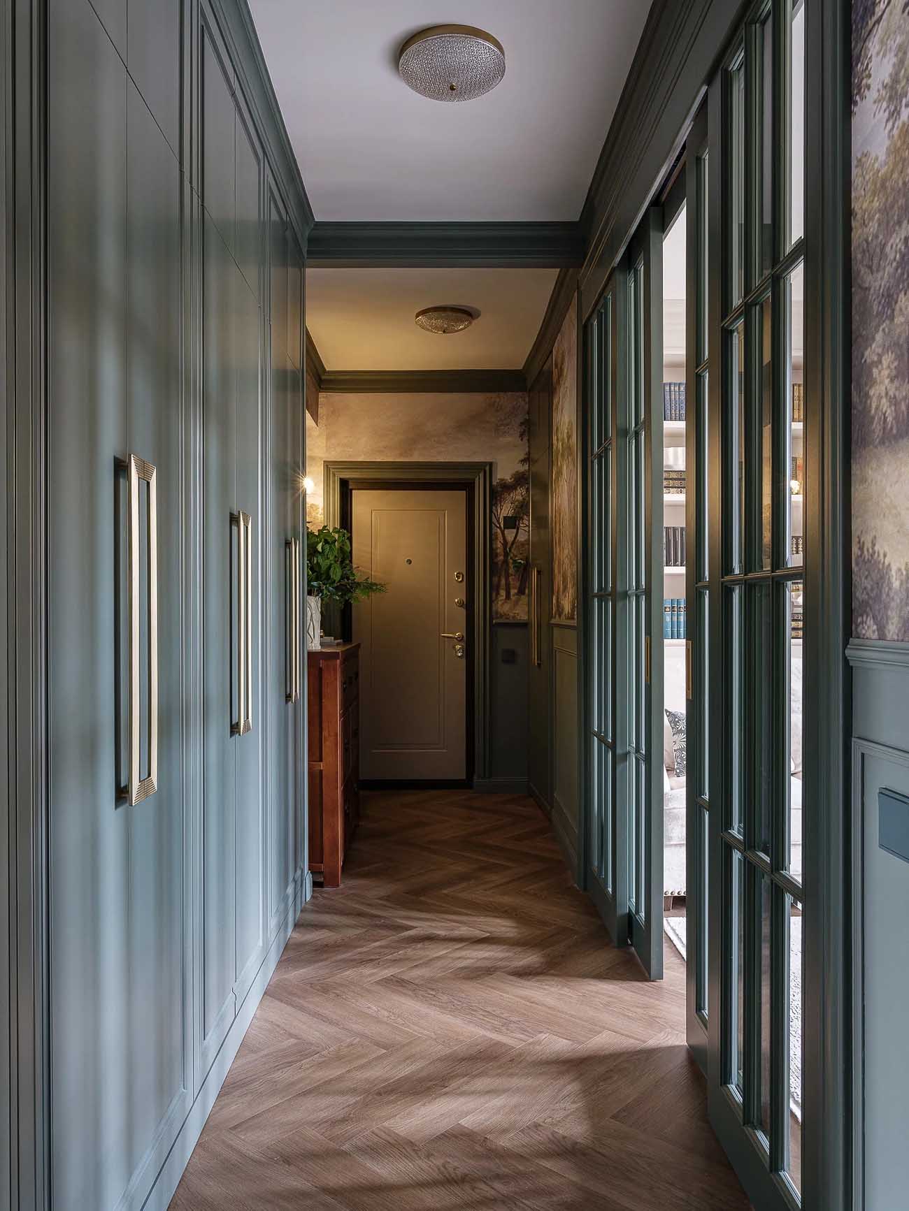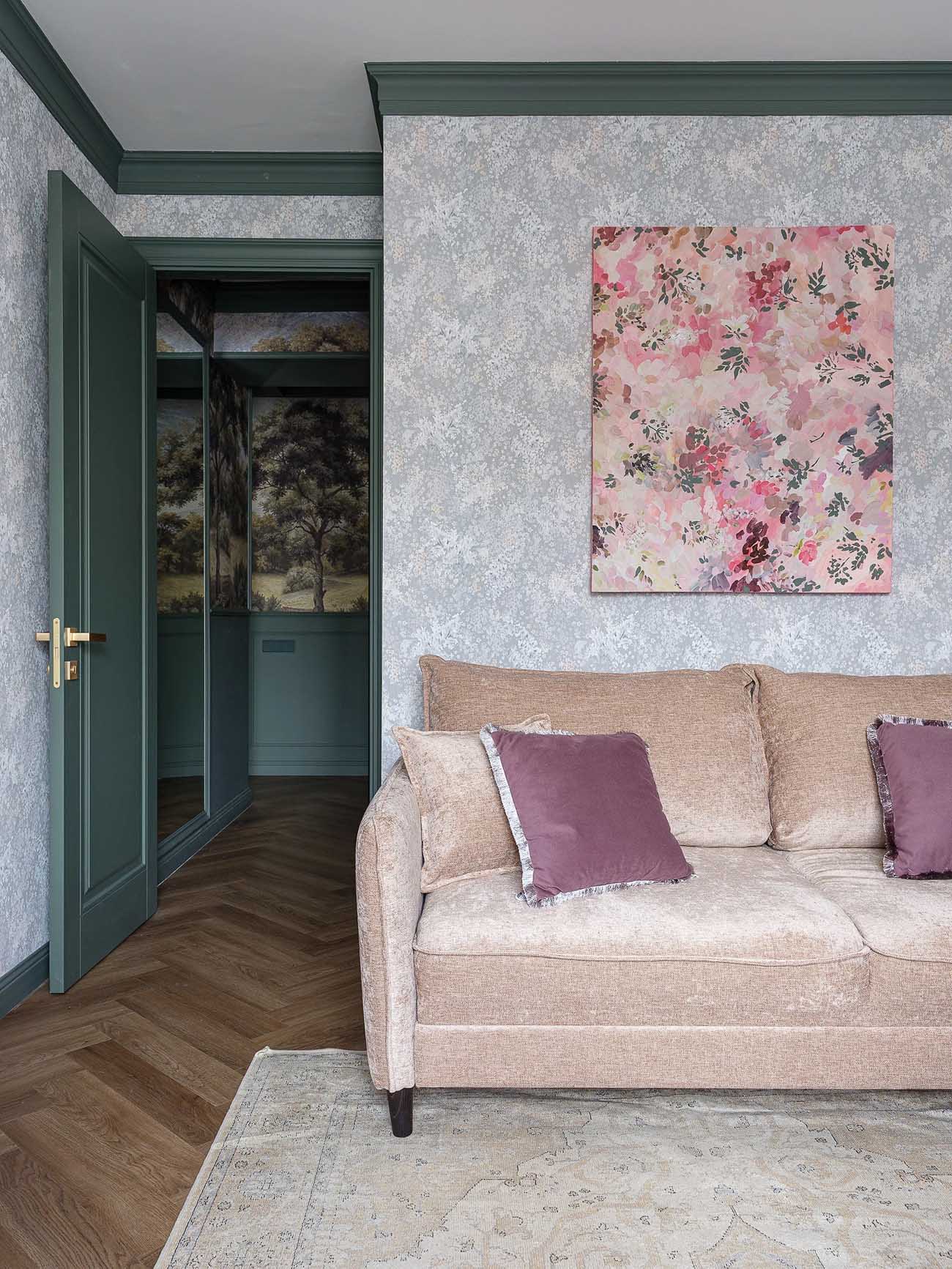 A lakásba lépve azonnal érzékelhető a természetközeli koncepció. A falak alsó harmadát sötétzöldre festették és díszlécekkel keretezték, ami klasszikus hatást kelt, míg a felső részeken egy részletgazdag, erdőt ábrázoló tapéta fut végig. A tárolást egy diszkréten a fal színébe olvadó, mélyzöld beépített szekrény, valamint egy antik komód oldja meg, megadva az alaphangot a lakás kissé eklektikus stílusához. Érdekes részlet a fal színére festett karnisok és lábazatok alkalmazása, amely egységesíti a teret.