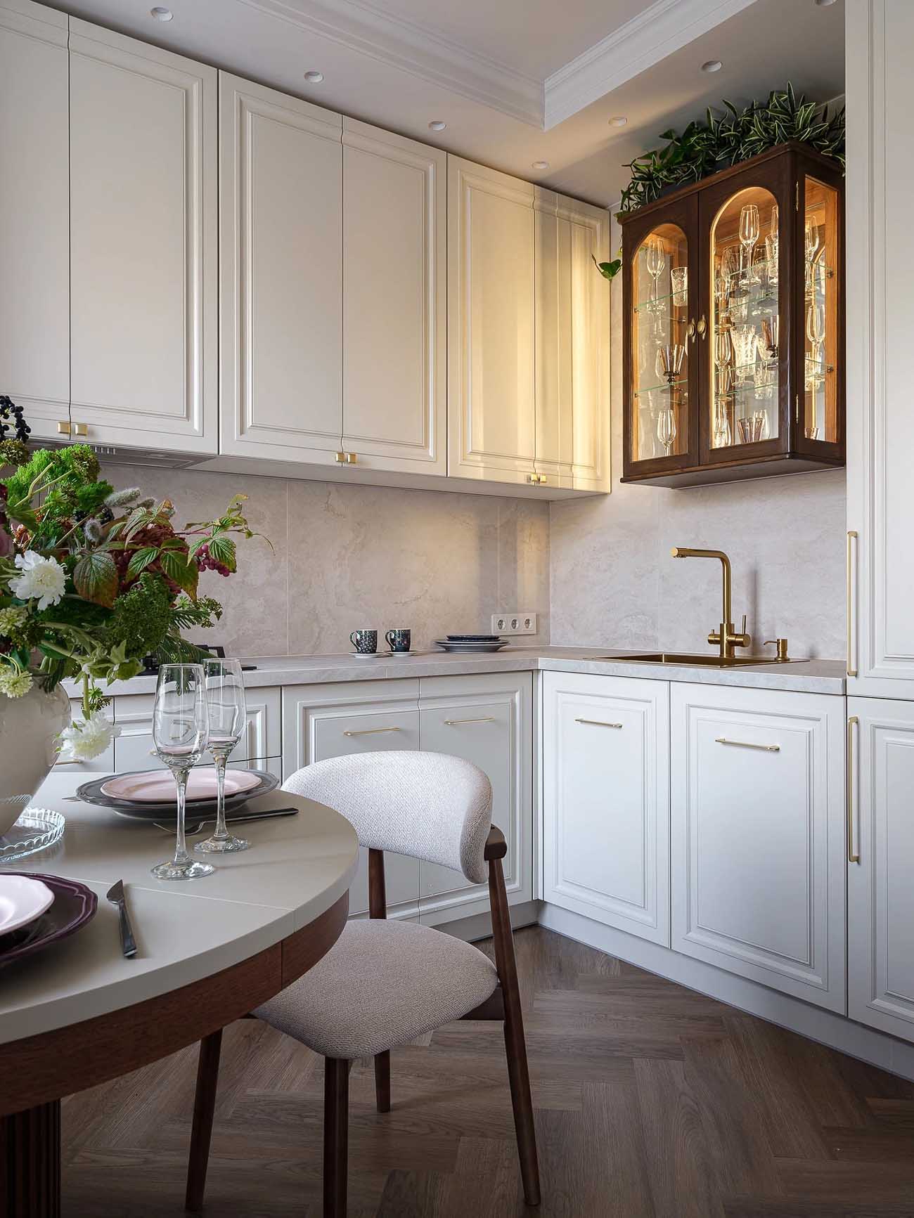 A konyhában az “L” alakú elrendezés biztosítja az ergonómiát. A modern technológia – a hűtő, a sütő és a mikrohullámú sütő – magas szekrényoszlopokba rejtve simul a fal síkjába, míg a mosogatógép az alsó elemsorban kapott helyet. A felső szekrénysor elhagyása szellősebbé teszi a teret; helyette a mosogató felett egy restaurált, antik tálalószekrény vonzza a tekintetet, bájos kontrasztot alkotva a modern funkciókkal.