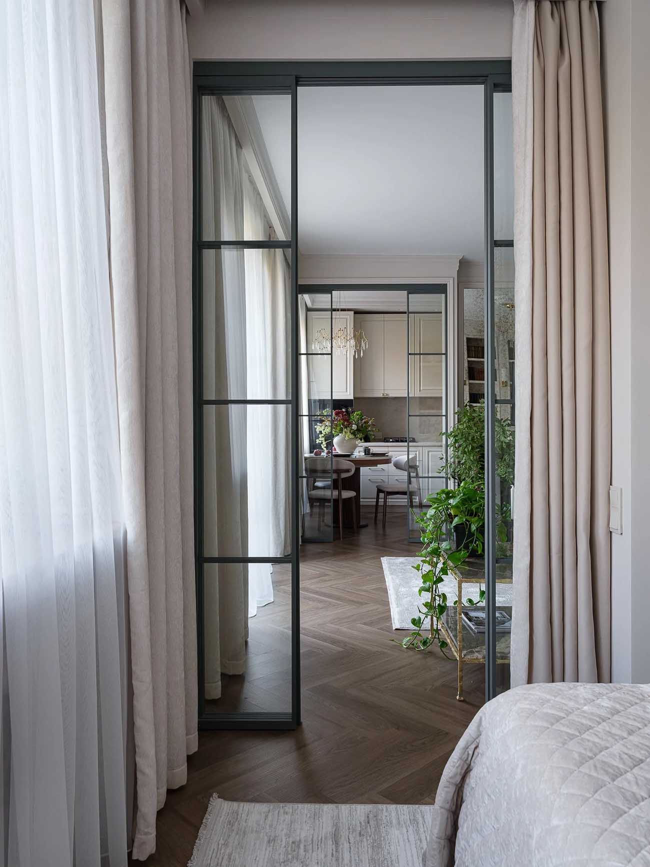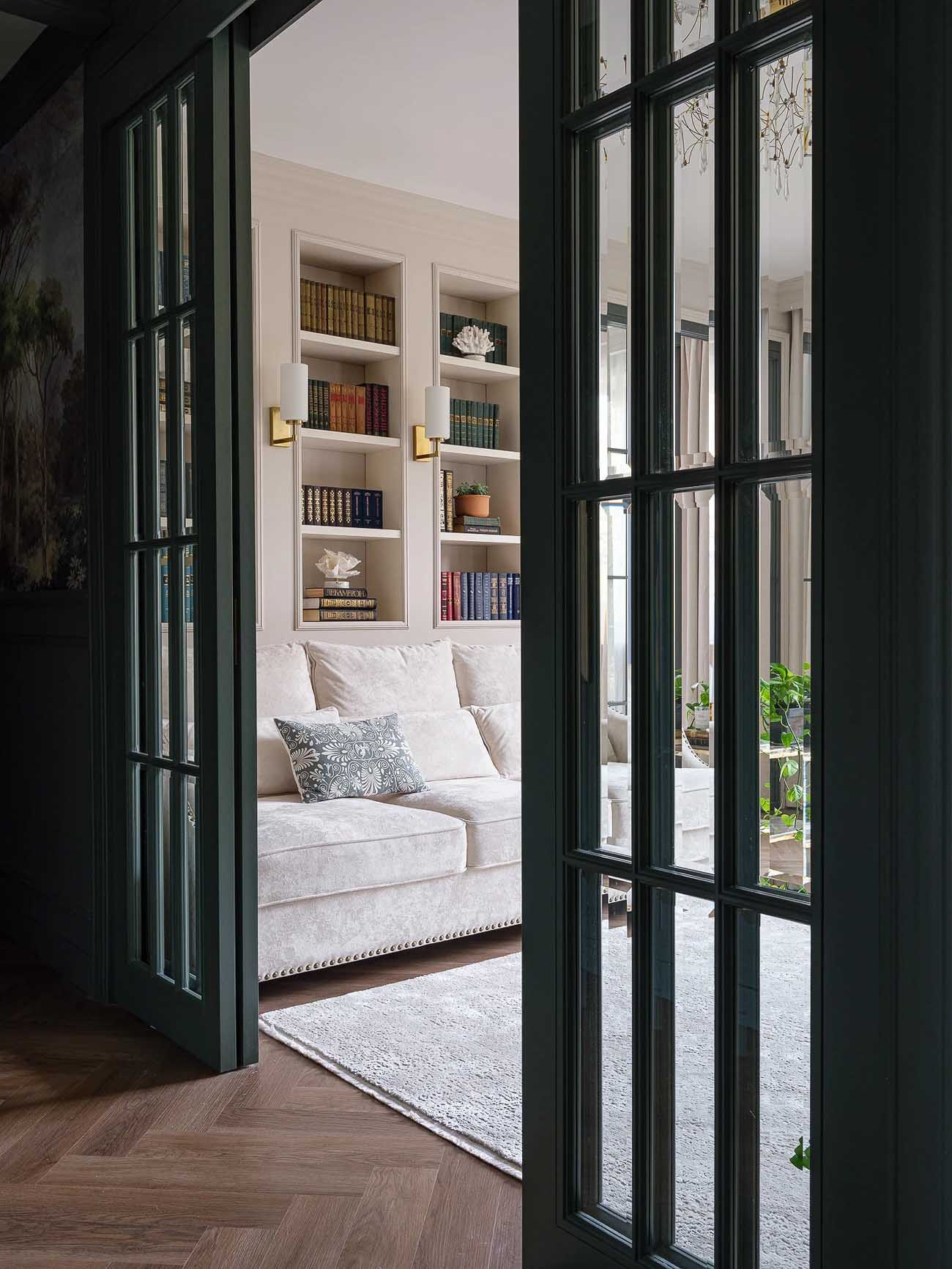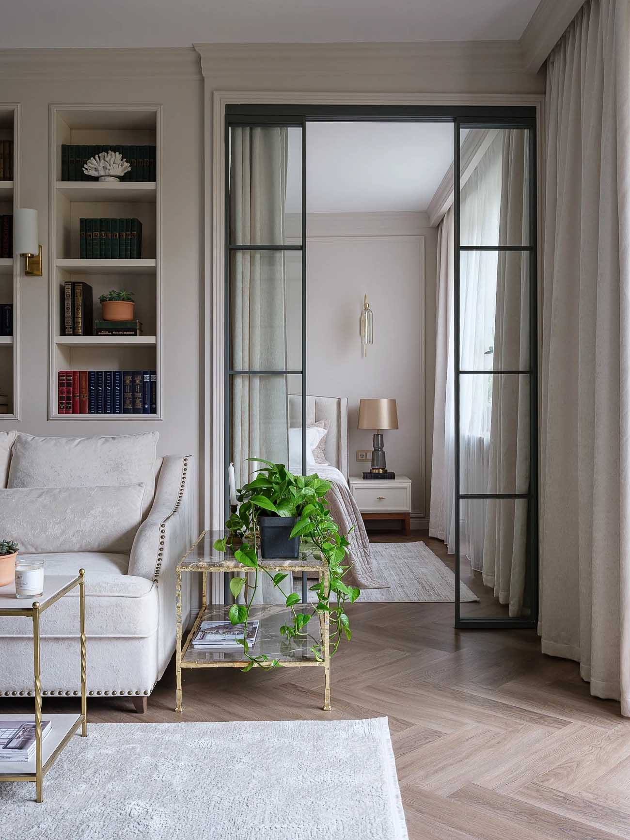 Az eredeti alaprajzot a mai igényekhez igazítva jelentősen átformálták. A leglátványosabb beavatkozás a nappali és a háló közötti kapcsolat újragondolása volt: a válaszfalat átépítették, így helyet kapott egy beépített könyvespolc-rendszer, a két helyiség közé pedig elegáns, magasított, üvegezett kétszárnyú ajtó került.