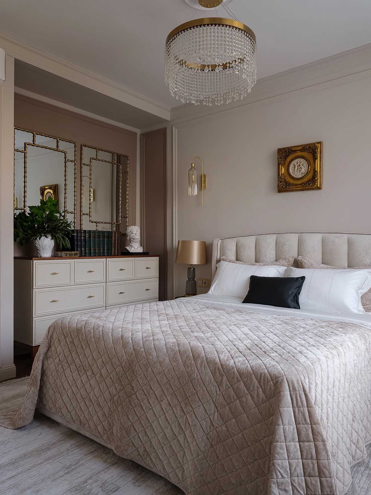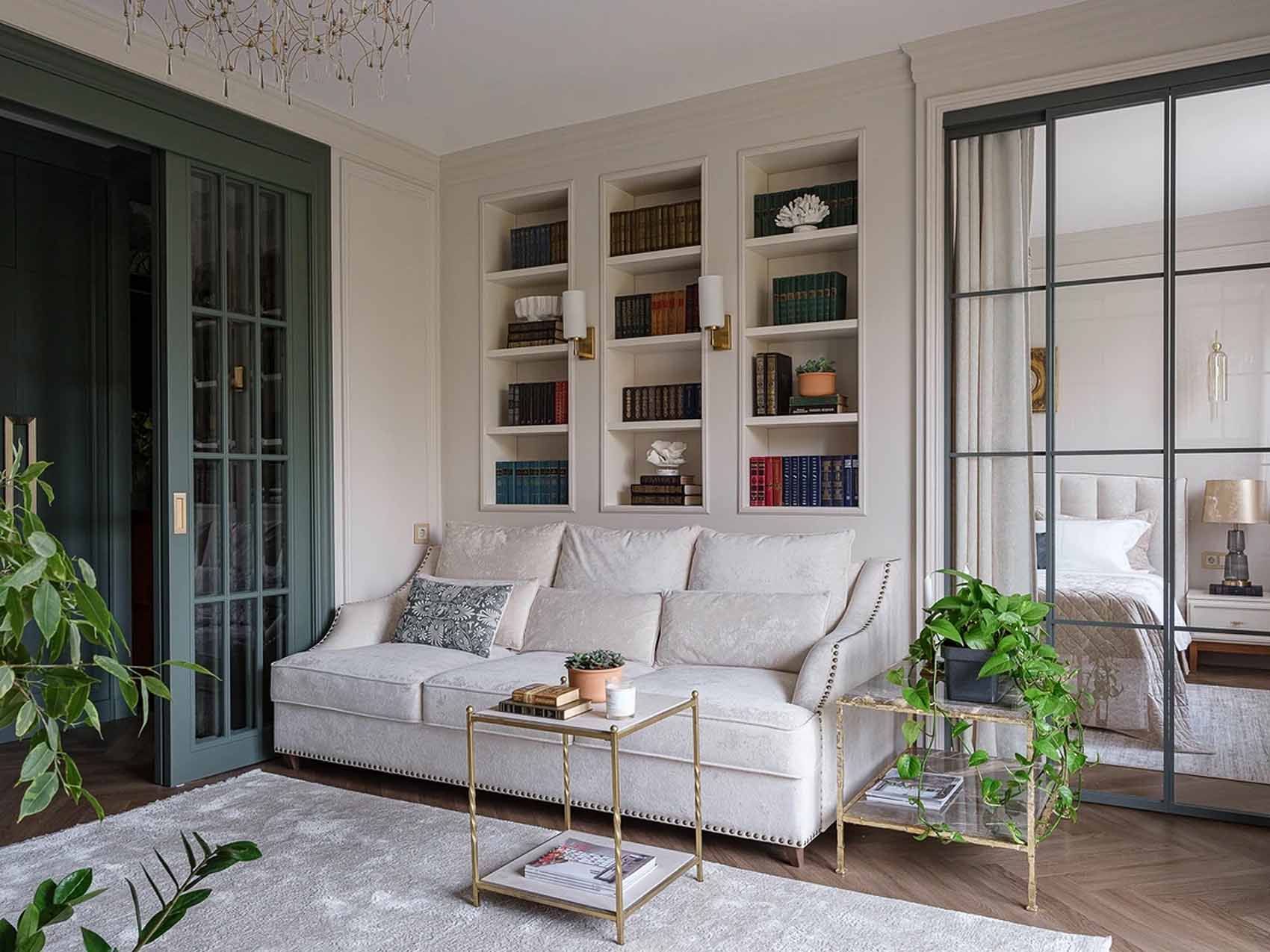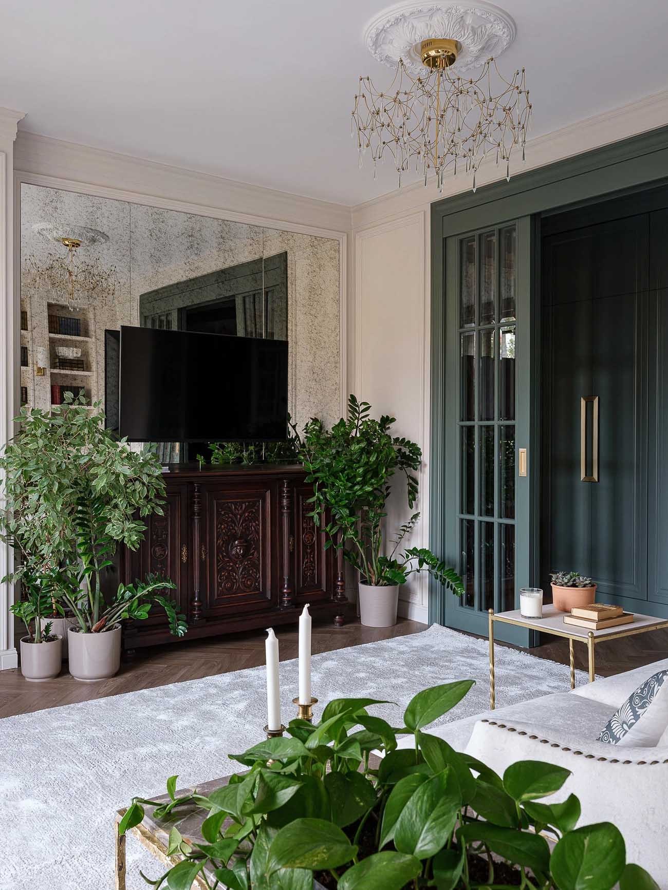 A társasági zóna a lakás szíve, ahol a régi és az új harmonikusan keveredik. A televízió alatt nem modern médiaállvány, hanem egy karakteres antik komód áll, a kompozíció héttere egy antikolt tükörfelület. A világítás terén a tervező bátran ötvözte a stílusokat: a mennyezeti süllyesztett spotlámpák technikai fényét klasszikus csillárok, falikarok és asztali lámpák meleg fénye egészíti ki, otthonos atmoszférát teremtve.