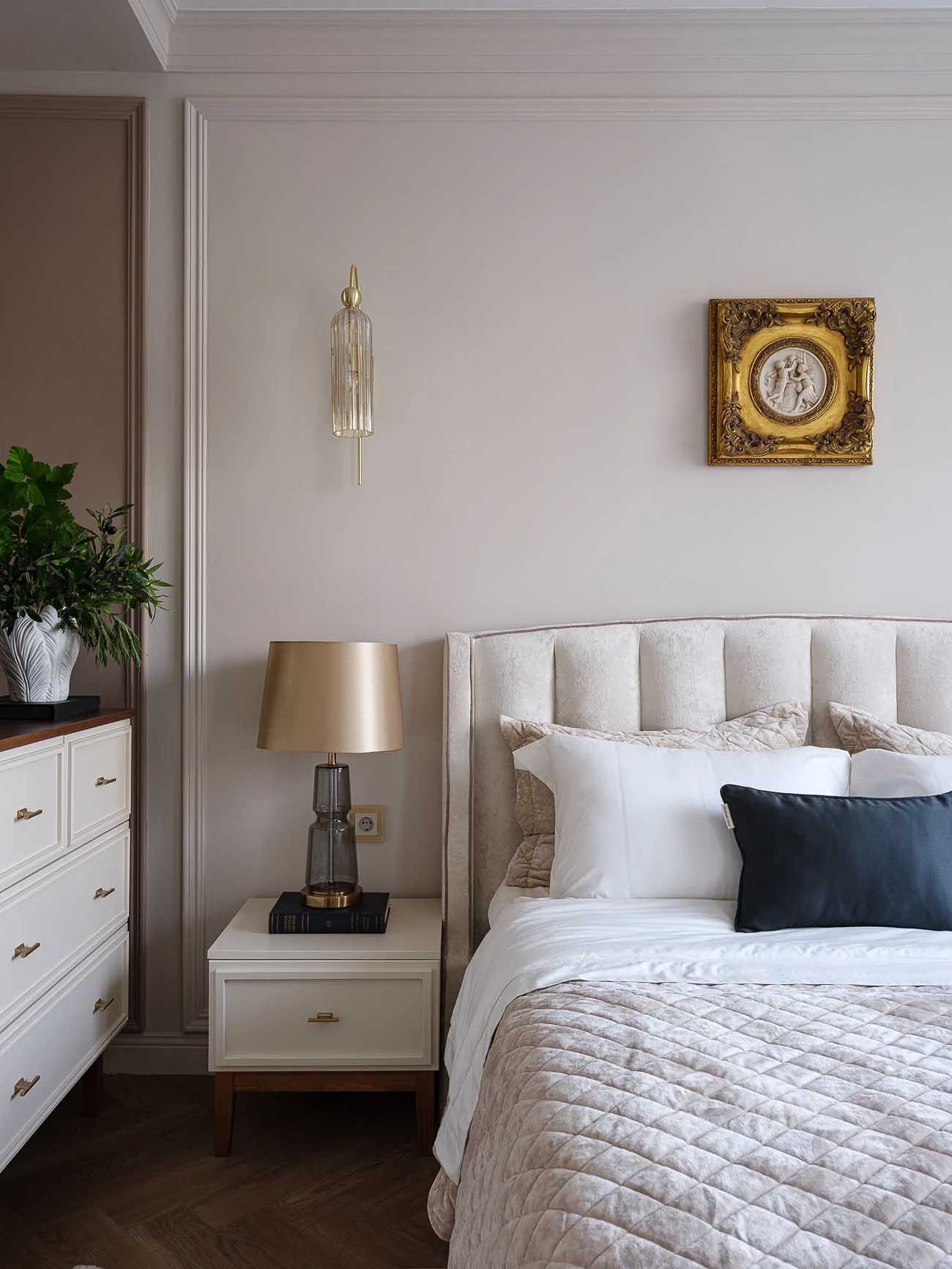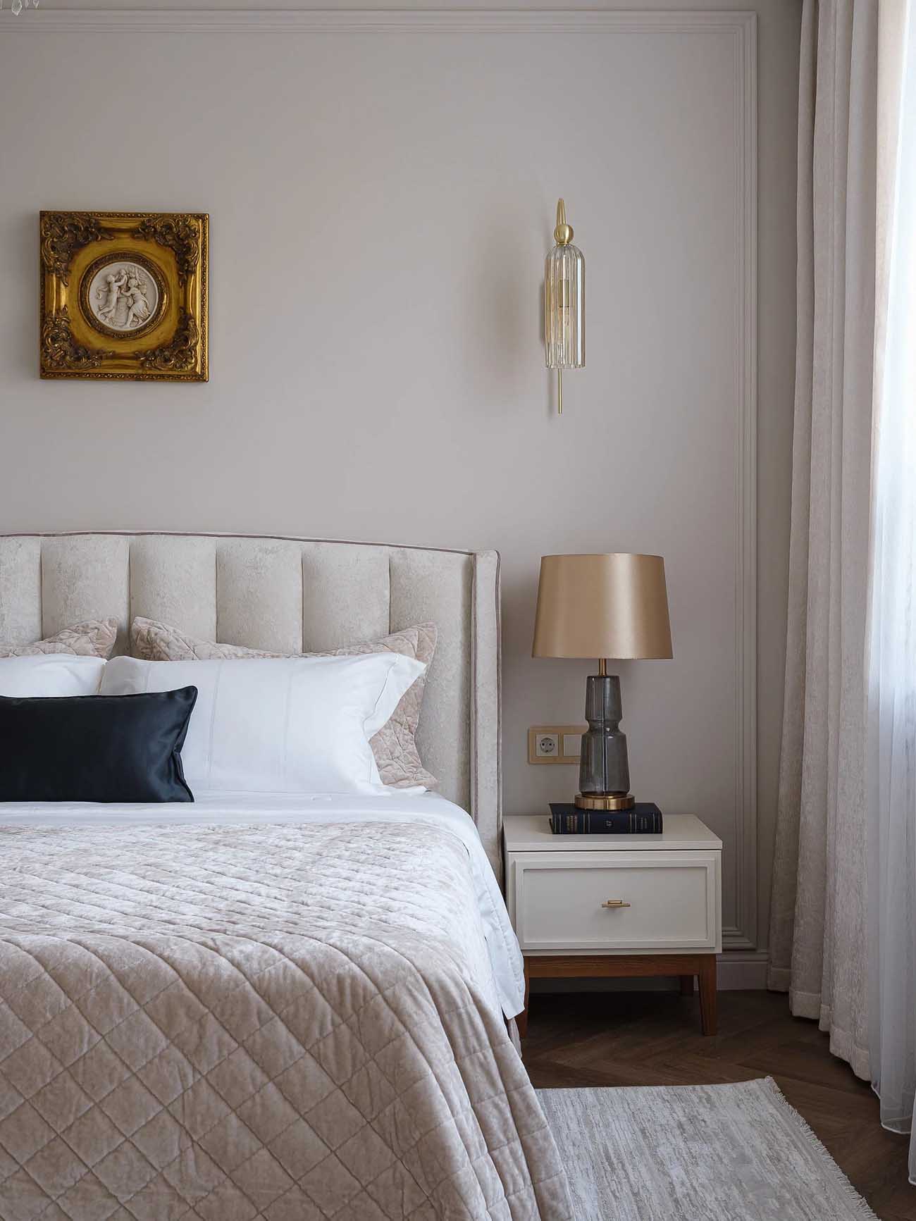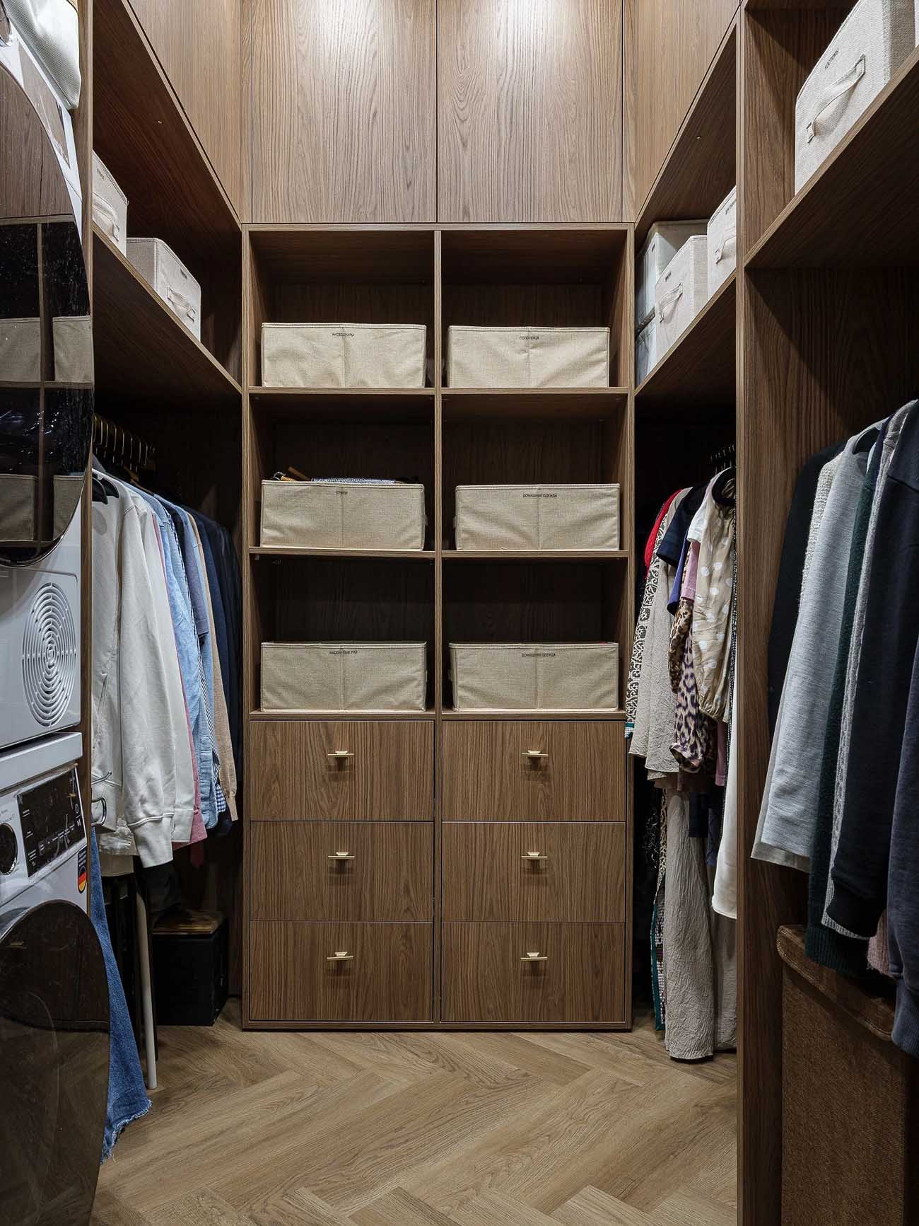 A hálóban a nyugalom dominál. Itt tudatosan nem helyeztek el nagyméretű ruhásszekrényeket; a tárolás funkcióját teljes egészében a leválasztott, professzionálisan rendszerezett gardróbszoba vette át. A hálóban így csupán egy komód és a teret optikailag tágító fali tükrök kaptak helyet. A gardrób kialakítása során a maximális helykihasználásra és a rendszerezhetőségre helyezték a hangsúlyt, ami megkönnyíti a mindennapi rend fenntartását.
