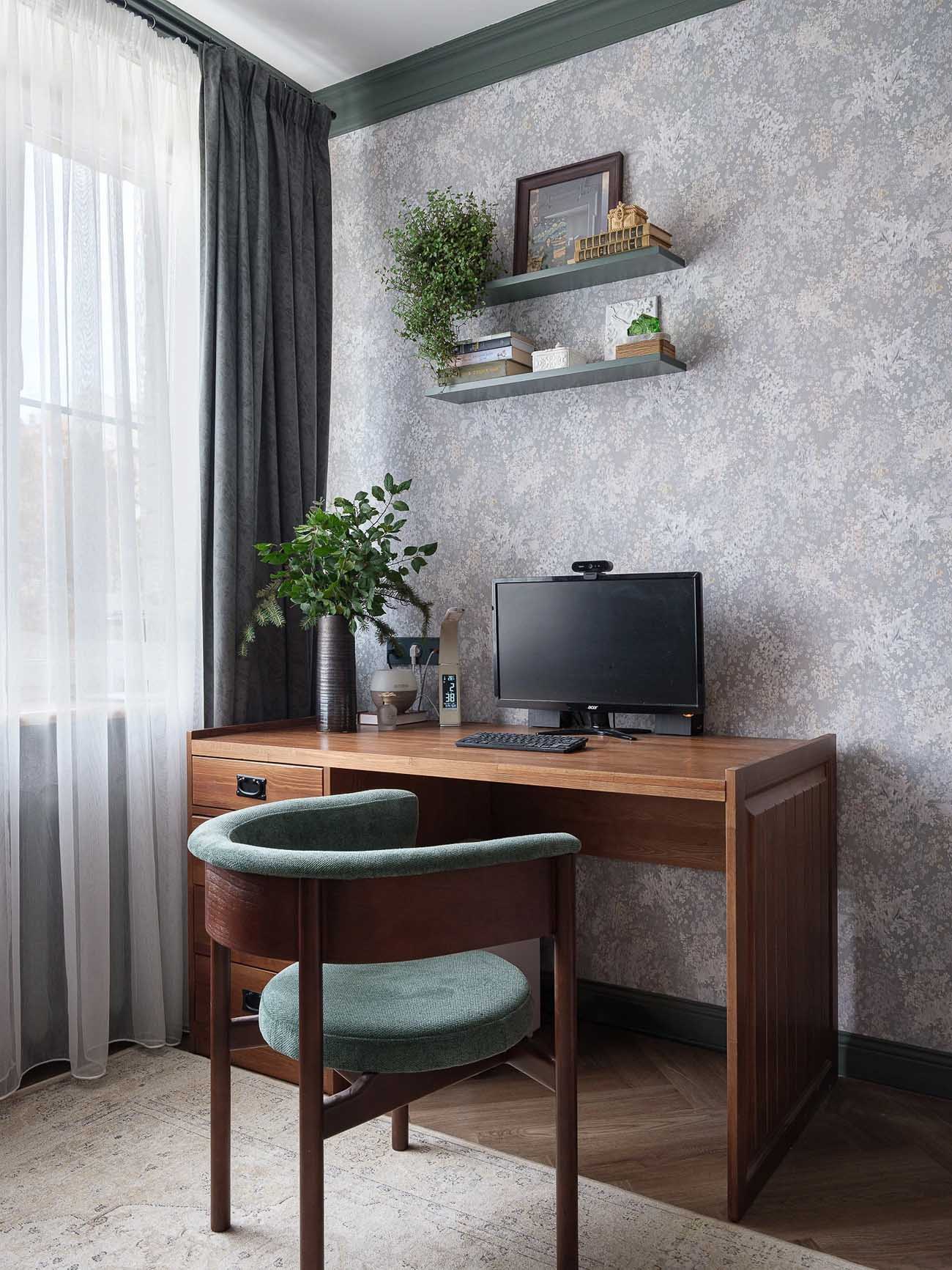 A dolgozószoba a visszavonulás szigete, ahol a falakat apró virágmintás tapéta díszíti. Itt is visszaköszön a lakás egészére jellemző színvilág: a díszlécek és a lábazat a tapéta zöldjével harmonizáló, az előszobai árnyalatra rímelő festést kaptak, vizuális keretet adva a térnek.