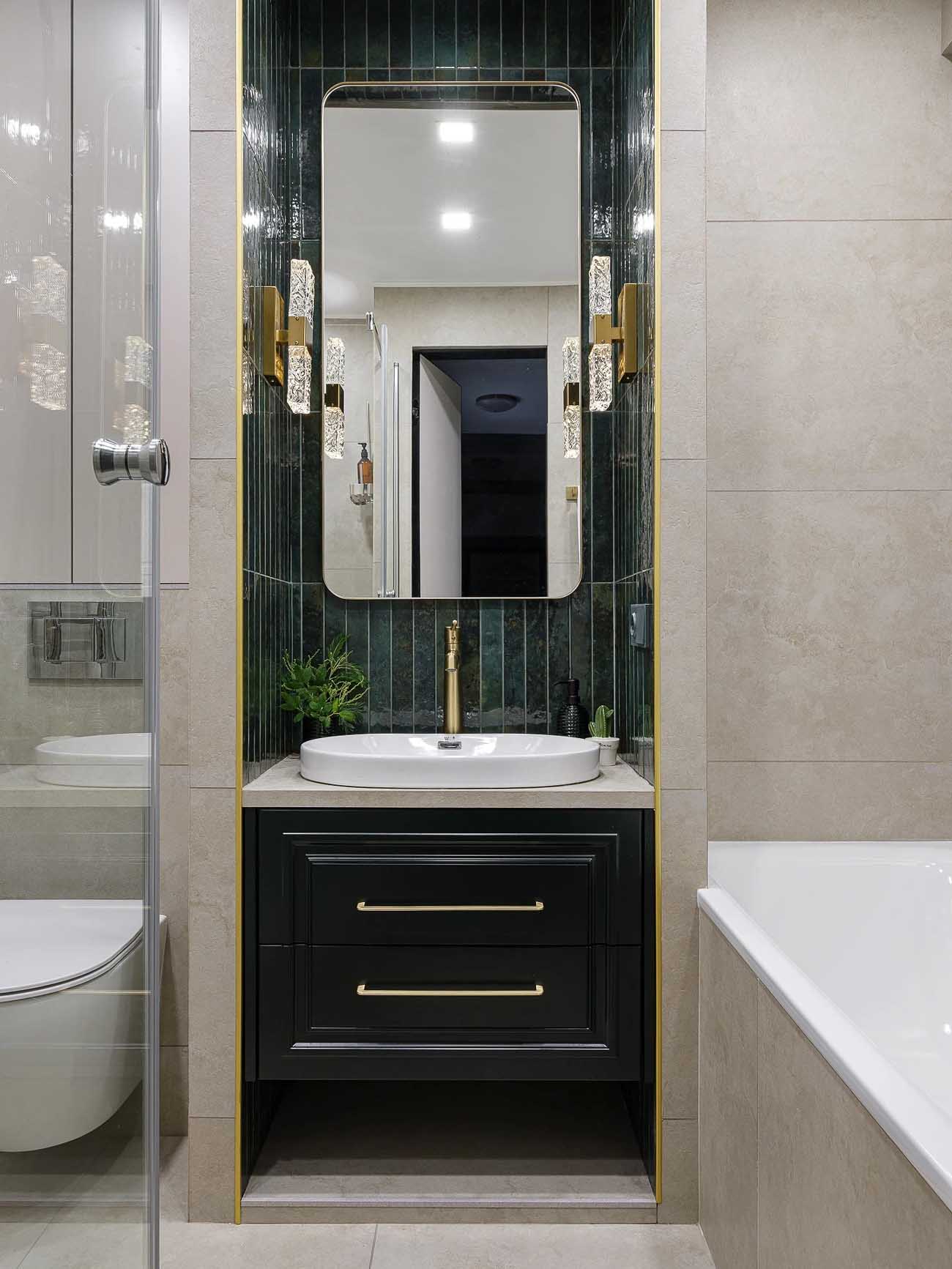 A vizesblokkban a semleges alapok és az élénk akcentusok játéka érvényesül. A tervező homokszínű, kőhatású greslapokat választott alapburkolatként, amely költséghatékony, mégis elegáns hátteret biztosít. A luxusérzetet a mosdó kiemelése adja: itt mély tónusú, smaragd színű, texturált csempék és épített elemek teszik fókuszponttá a zónát.
