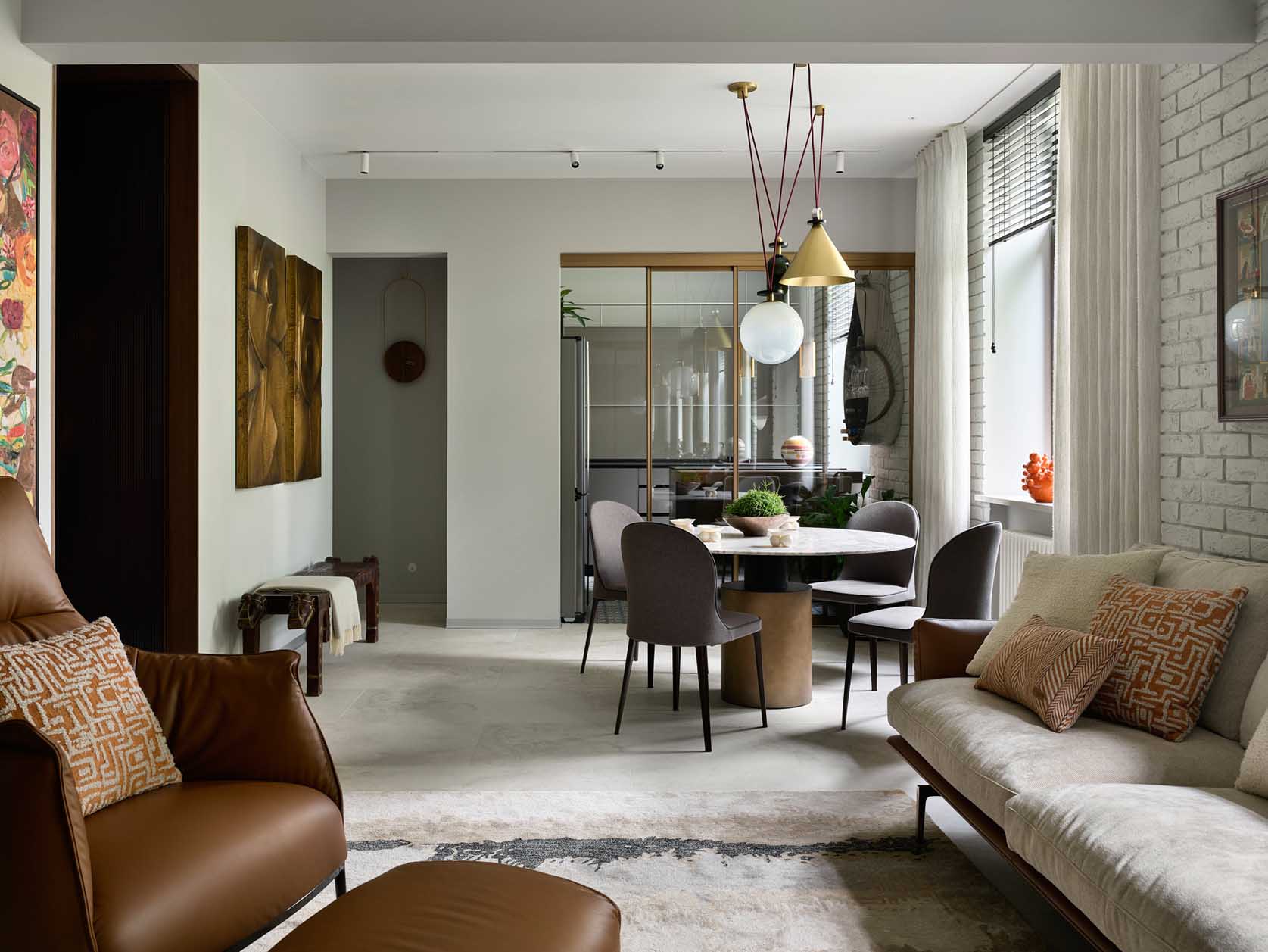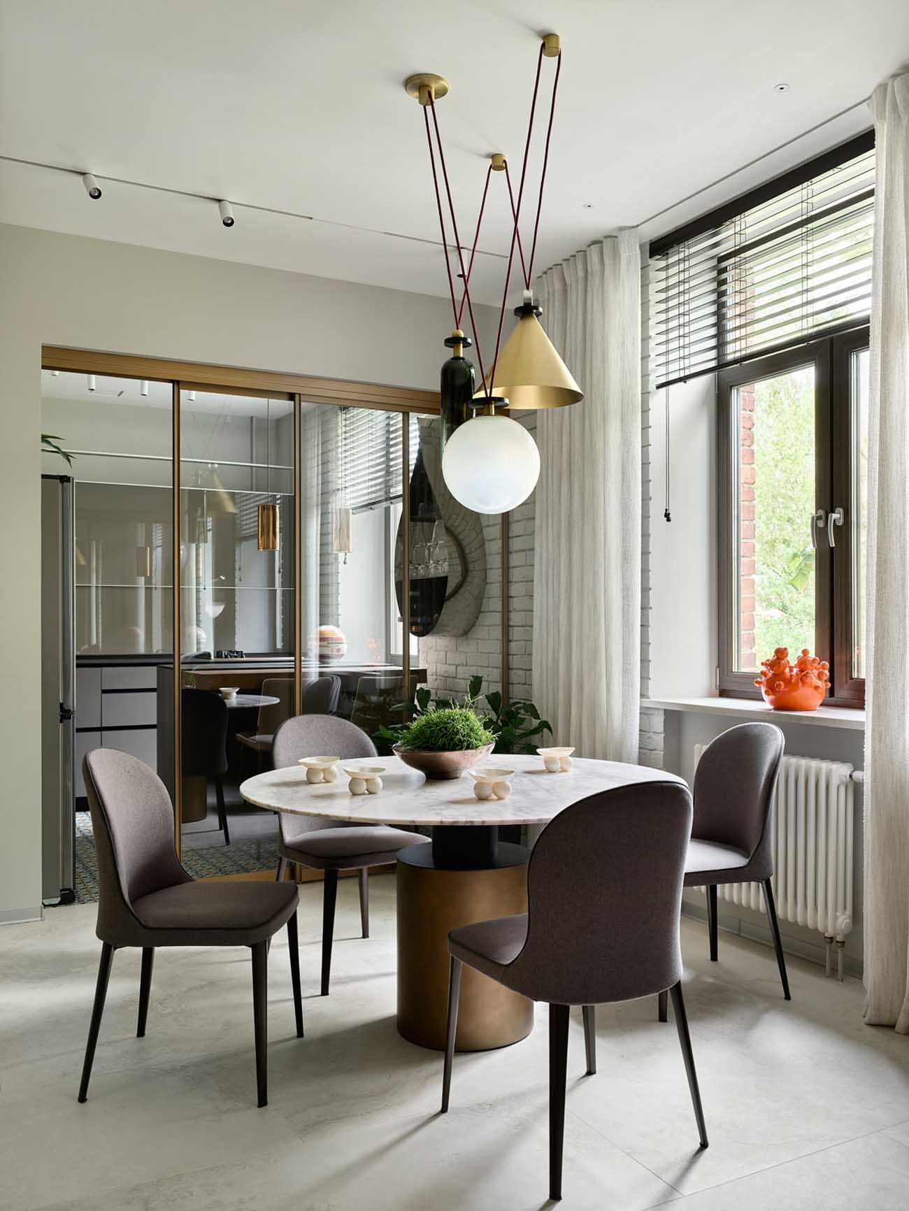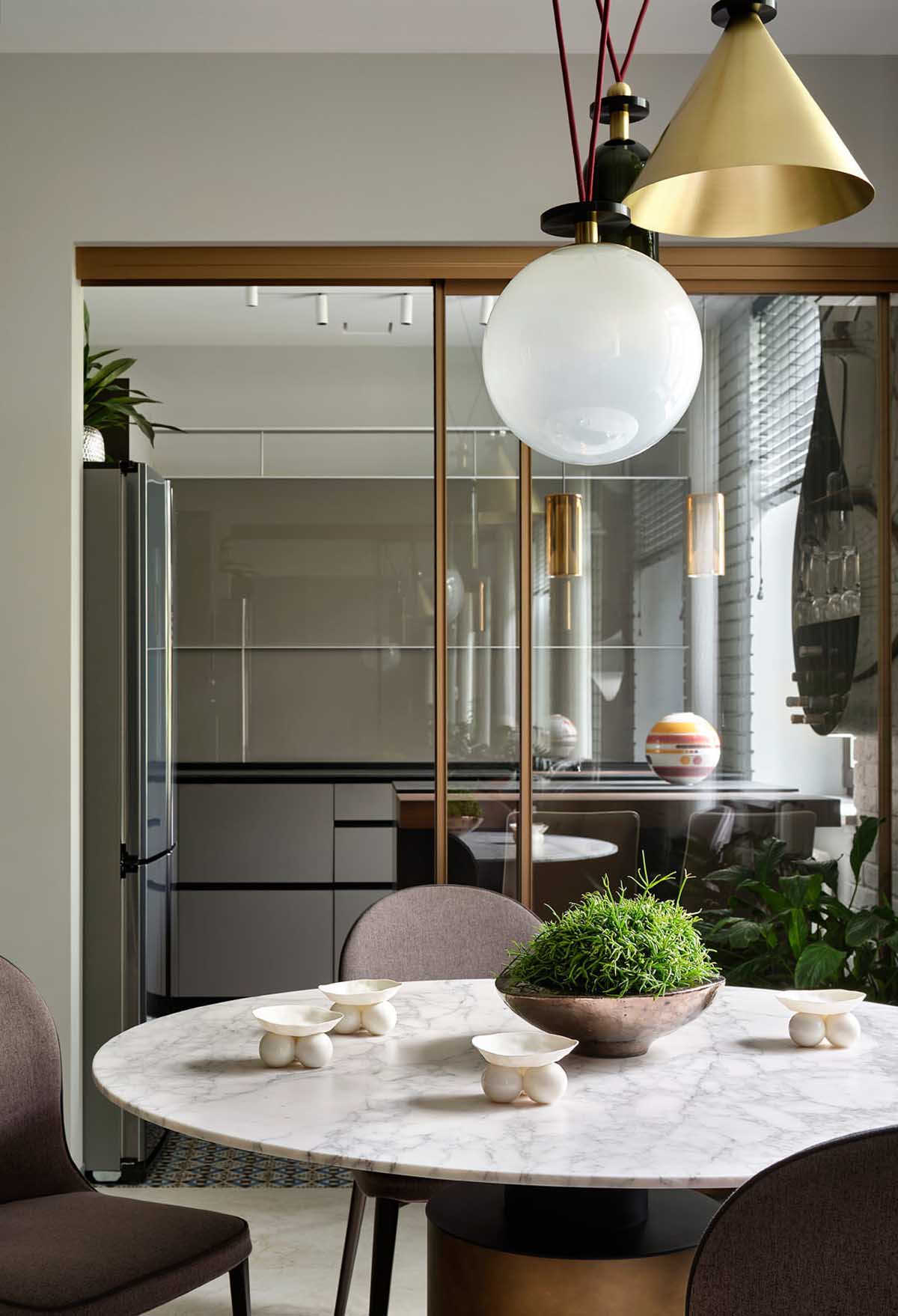 Az étkezőben a Acerbis Creso asztala dominál, amelynek szoborszerű megjelenését a Roll & Hill Shape Up függesztéke koronázza meg. A tér eleganciáját a kézzel készített sárgaréz falpanelek teszik teljessé, meleg fényt és textúrát csempészve a modern környezetbe.