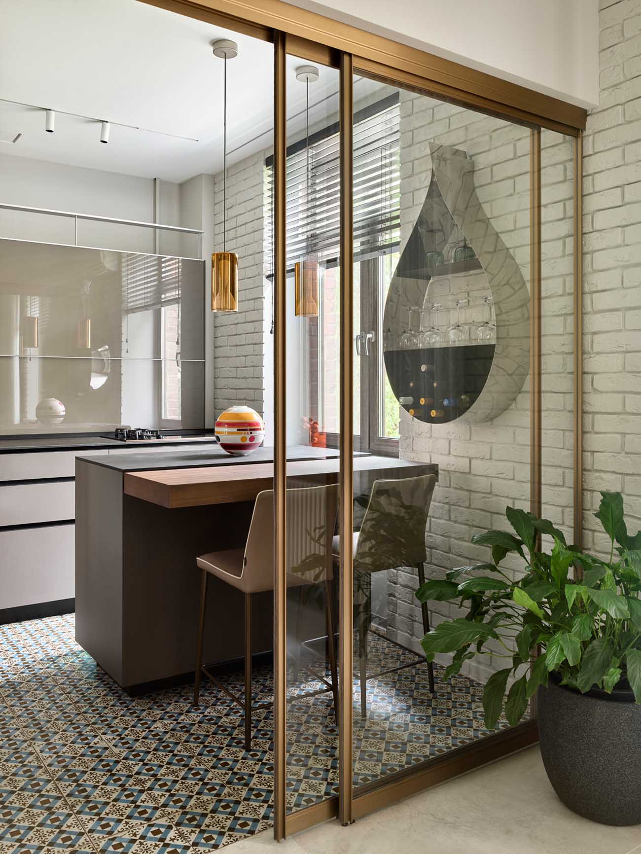 A konyha kialakítását a gázszolgáltatás határozta meg: a teret egy elegáns, átlátható üveg válaszfal szeparálja el a nappalitól, biztosítva a fény áramlását, de megfelelve a biztonsági előírásoknak is. A háziasszony választása egy modern, technikailag minden igényt kielégítő Valcucine New Logica konyhabútorra esett, amelyben a Smeg és Neff beépített gépei kaptak helyet. Különlegesség a kombinált főzési lehetőség (gáz és indukció), valamint a térbe állított konyhasziget, amely a család egyik kedvenc találkozóhelyévé vált. A falon a Cattelan Italia Drop fém bortartó polca látható.