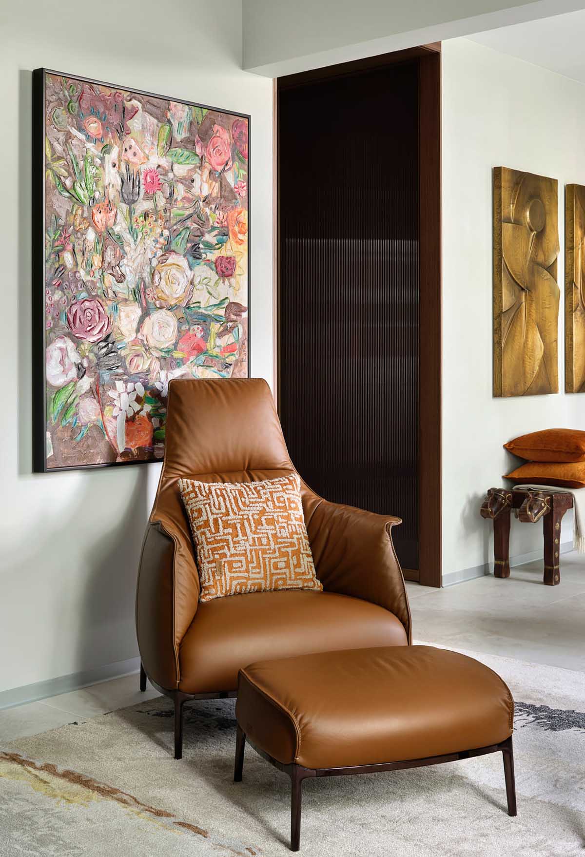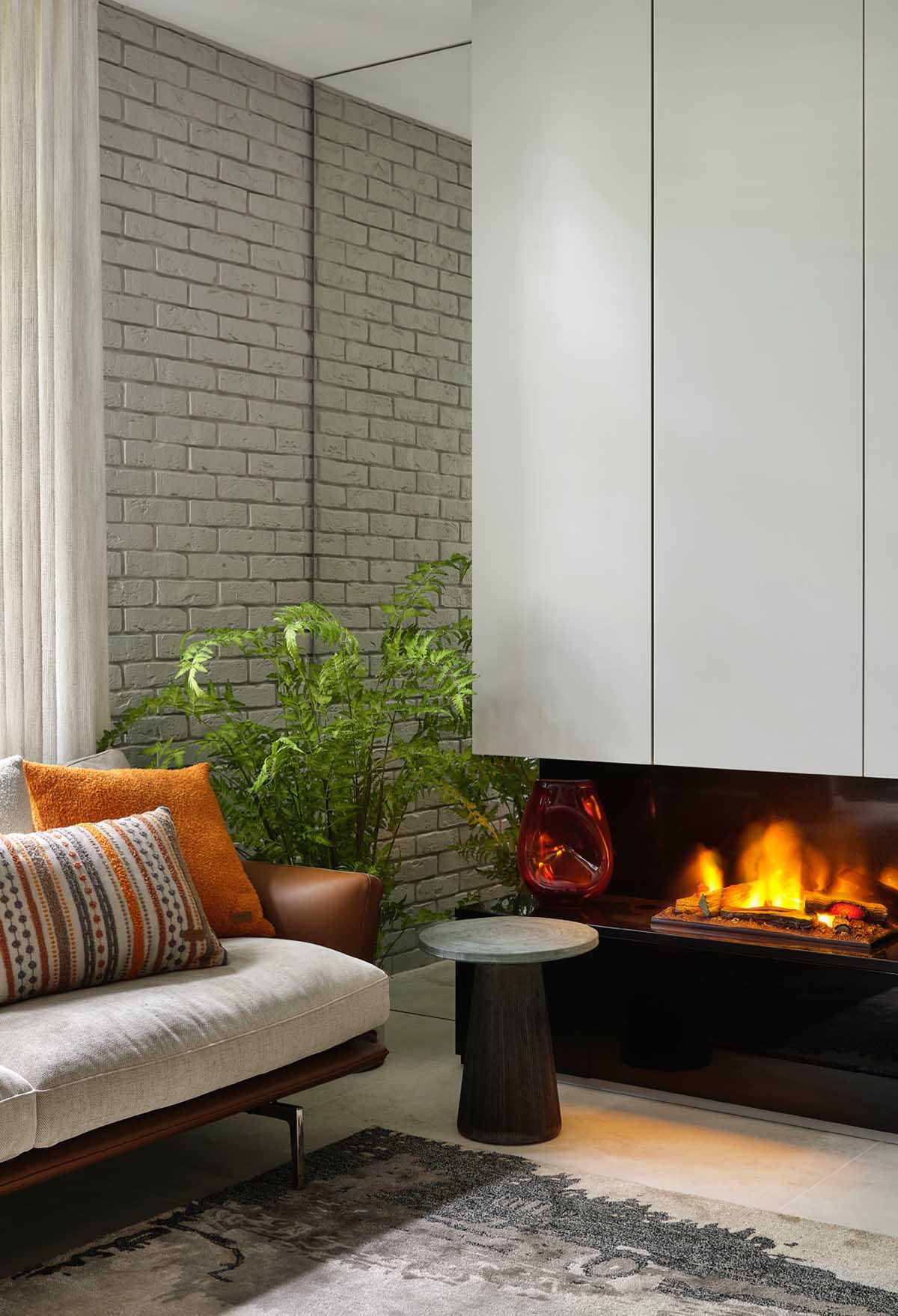 A kibővített nappali az otthon szíve, ahol a berendezés a kényelem és a design ikonok párbeszédére épül. A pihenőzóna központi eleme a Poltrona Frau Get Back kanapéja, amelyet a szintén a márkához tartozó, Jean-Marie Massaud által tervezett ikonikus Archibald fotel egészít ki. A hangulatról a Dimplex Optimyst rendszerű biokandallója gondoskodikt.