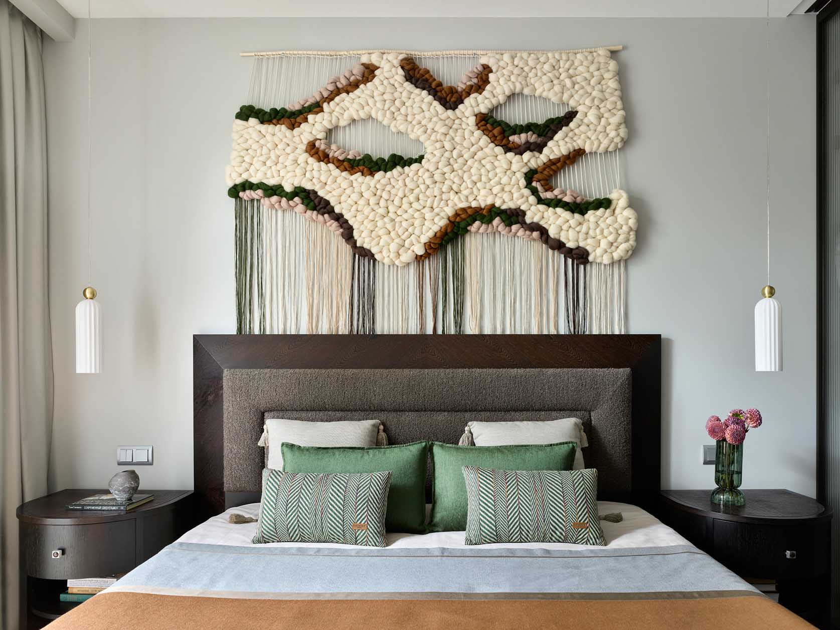 A privát szféra kialakításánál a meglévő, minőségi darabok megőrzése és felújítása volt a cél. A tulajdonosok ragaszkodtak a Smania ágyhoz és a hozzá tartozó éjjeliszekrényekhez, valamint a komódhoz. Ezek a darabok szakértő restaurálás és kárpitozás után kerültek vissza a térbe, bizonyítva, hogy a minőségi design időtálló. A hálószoba textíliái és a gondosan megválasztott kiegészítők – mint például a Woon Stories lámpái – teszik teljessé a pihentető atmoszférát.