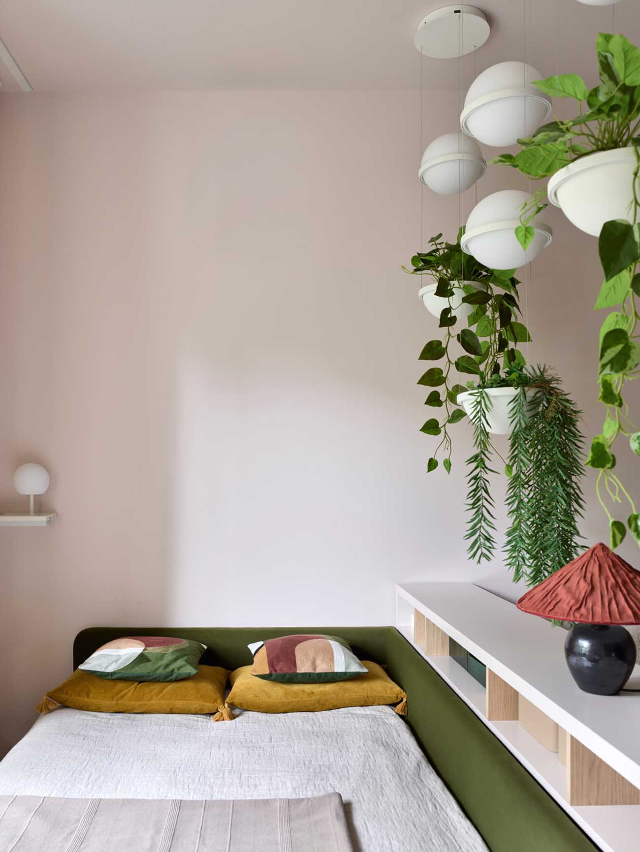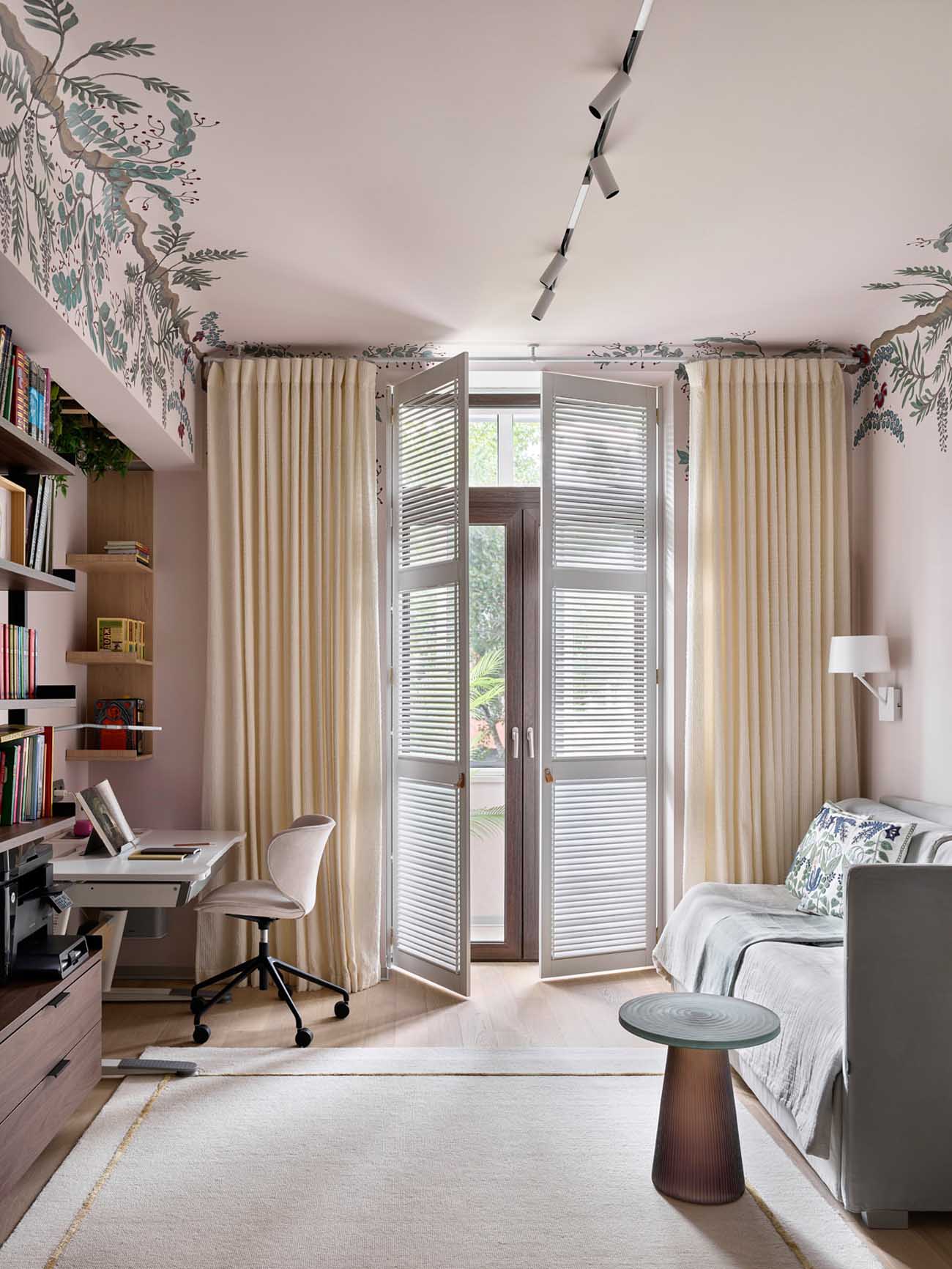 A két lánygyermek birodalma eltérő karaktert kapott. Az egyik szobában a mennyezet vált a művészet vásznává: egy egyedi, kézzel festett, virágos-mesés freskó díszíti, amely varázslatos hangulatot teremt. A berendezést itt a Twils ágya és a BoConcept Hamilton széke egészíti ki.