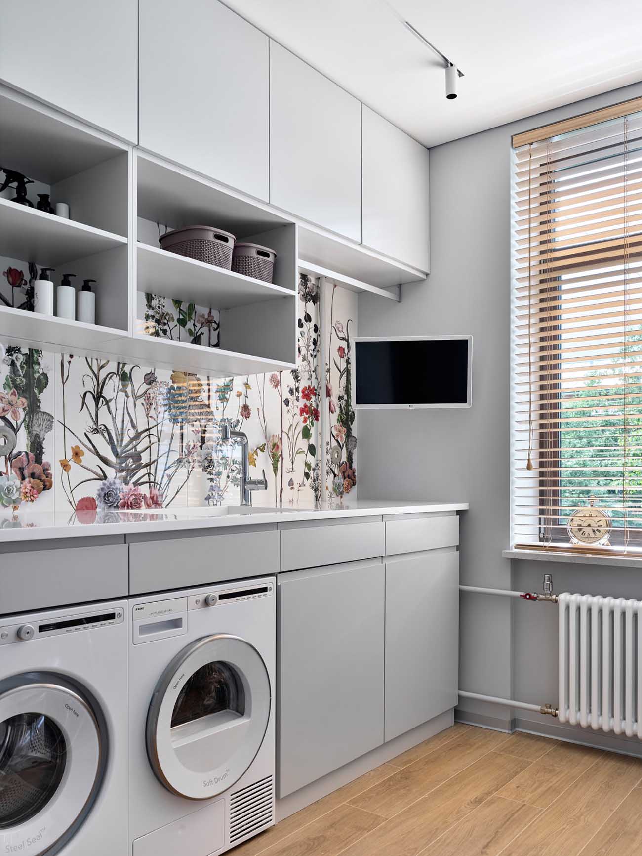 A tervezők a terek szellőssé tételére helyezték a hangsúlyt. A nappali területét a korábbi gyerekszoba hozzácsatolásával növelték meg, egy nagyvonalú társasági teret létrehozva. A két ingatlan gépészeti adottságait kihasználva az egyik konyhát megtartották eredeti funkciójában, míg a másik lakás konyhájának helyén egy tágas, minden igényt kielégítő háztartási helyiséget és mosókonyhát alakítottak ki – ez a megoldás különösen praktikusnak bizonyult a nagycsaládos életvitel szempontjából.