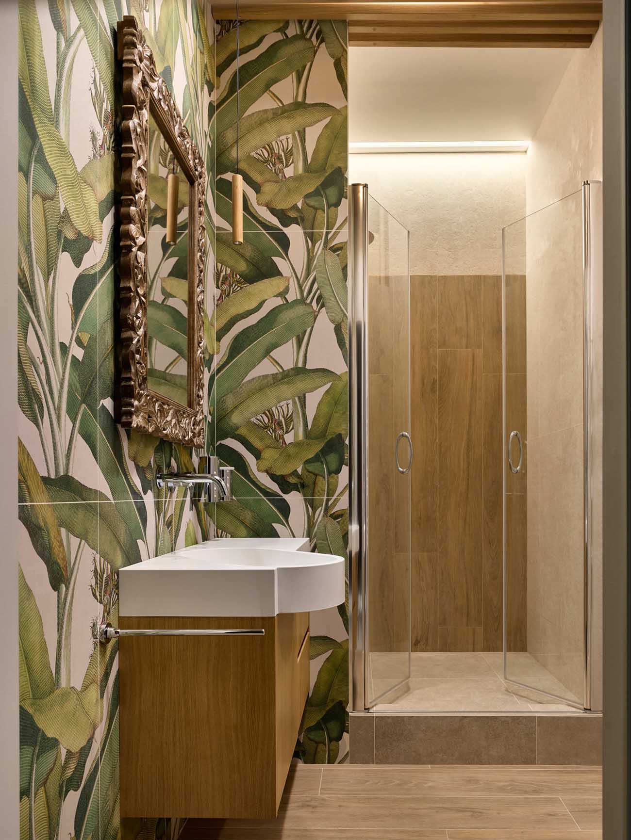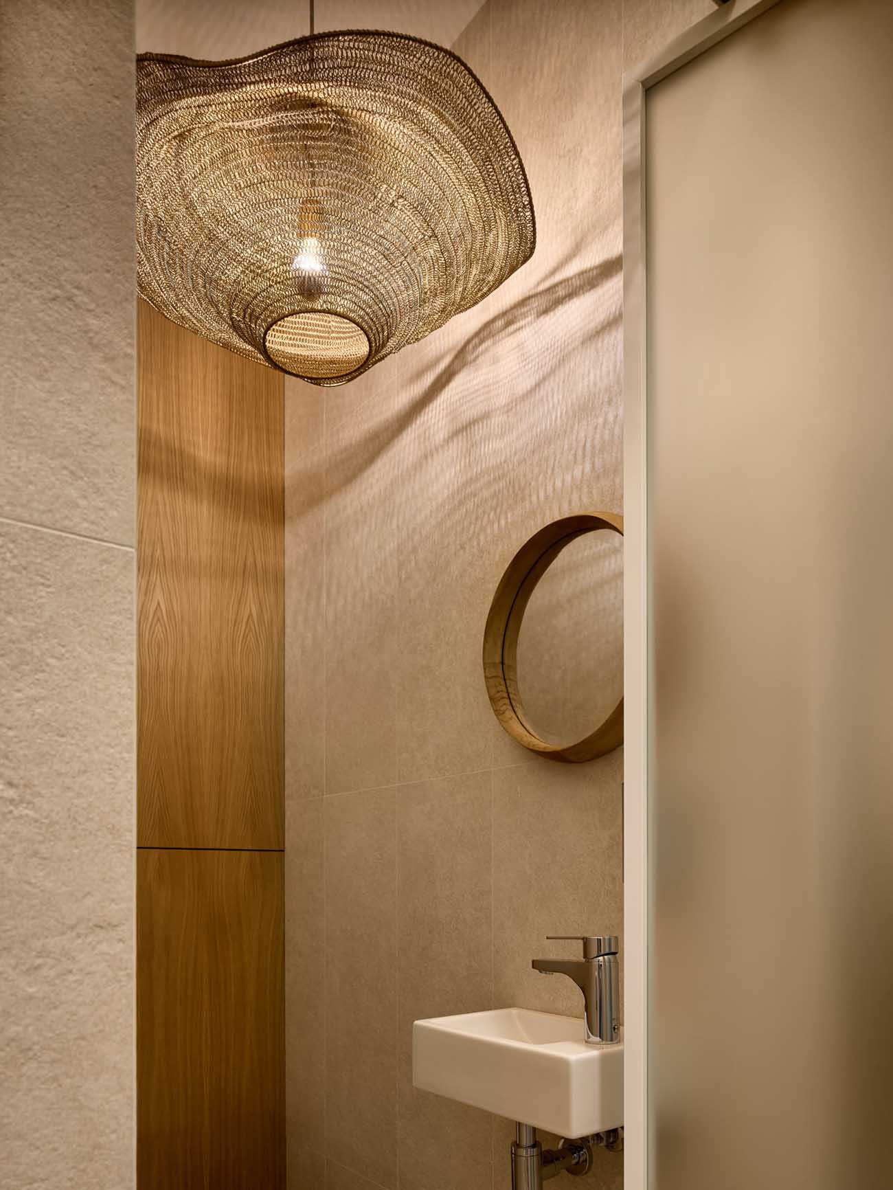 A fürdőszobákban a tartósság és az esztétikum találkozik, burkolatok terén a Peronda és a 41zero42 kollekciói dominálnak, míg a szaniterek között a Villeroy & Boch darabjai tűnnek fel. A csaptelepek a Ramon Soler kínálatából származnak, elegáns keretet adva a vizes zónáknak.