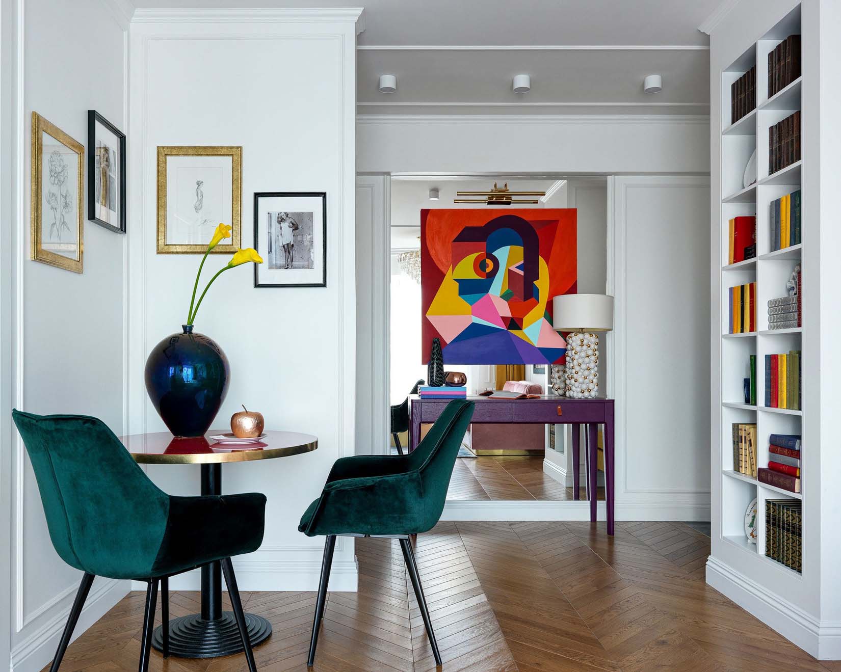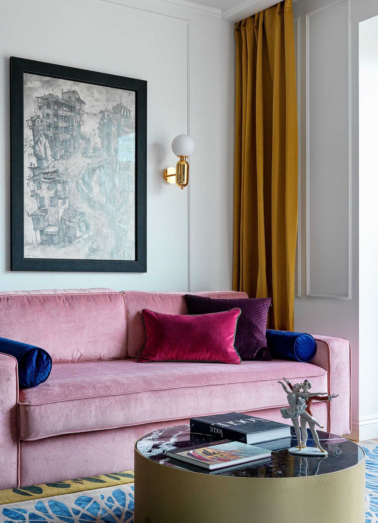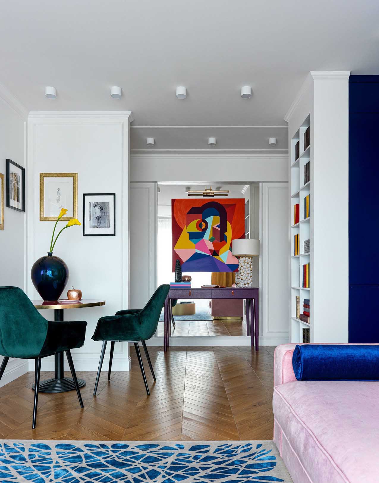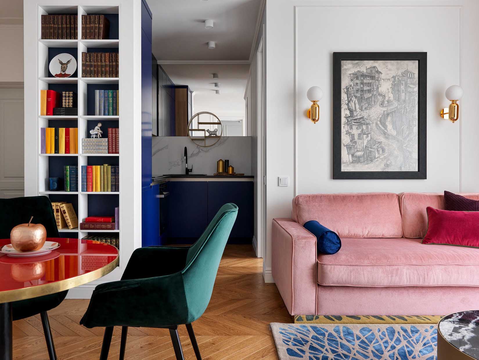 Az enteriőr színhasználata rendkívül gazdag: a finom, nőies rózsaszín mellett megjelenik a mély, nyugodt kék, a ragyogó smaragdzöld, valamint a lila és bordó árnyalatok is izgalmas akcentusként vannak jelen. Mivel a tulajdonos érdeklődik a pszichológia iránt, kiemelt szempont volt egy olyan színpaletta összeállítása, amely harmonikus és a relaxálást segítő légkört teremt.