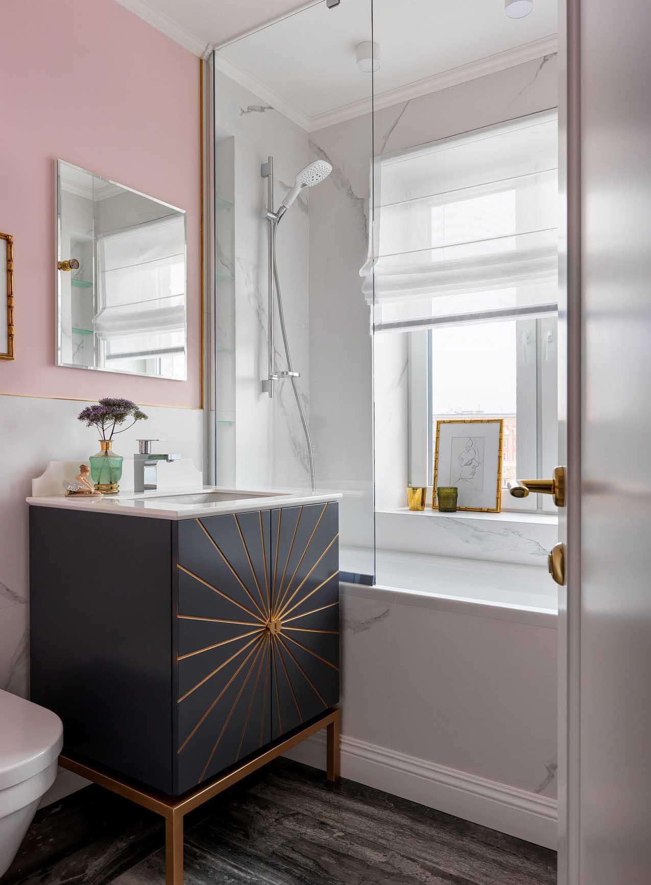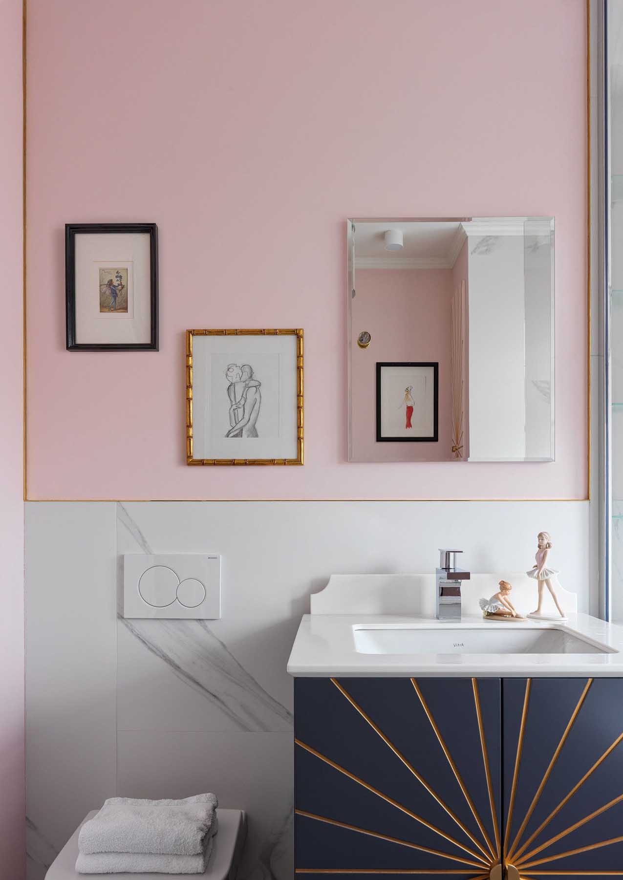 A tulajdonos egy vibráló, személyiségét hűen tükröző otthonra vágyott. „A púderes rózsaszín árnyalatok, a légies római roló és a padló hűvös szürkéjének kontrasztja egyszerre kölcsönöz nőies és kifinomultan elegáns karaktert a térnek” – foglalja össze a lakberendező.