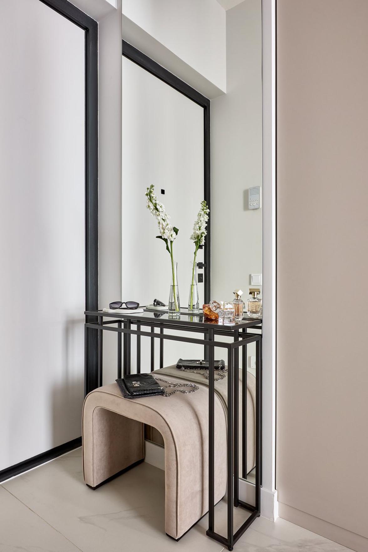 Az egyedi szekrény a rendelkezésre álló falfülkébe került beépítésre, mivel máshol nem volt lehetőség az elhelyezésére. A berendezést egy tükör, egy konzolasztal és egy puff teszi teljessé.