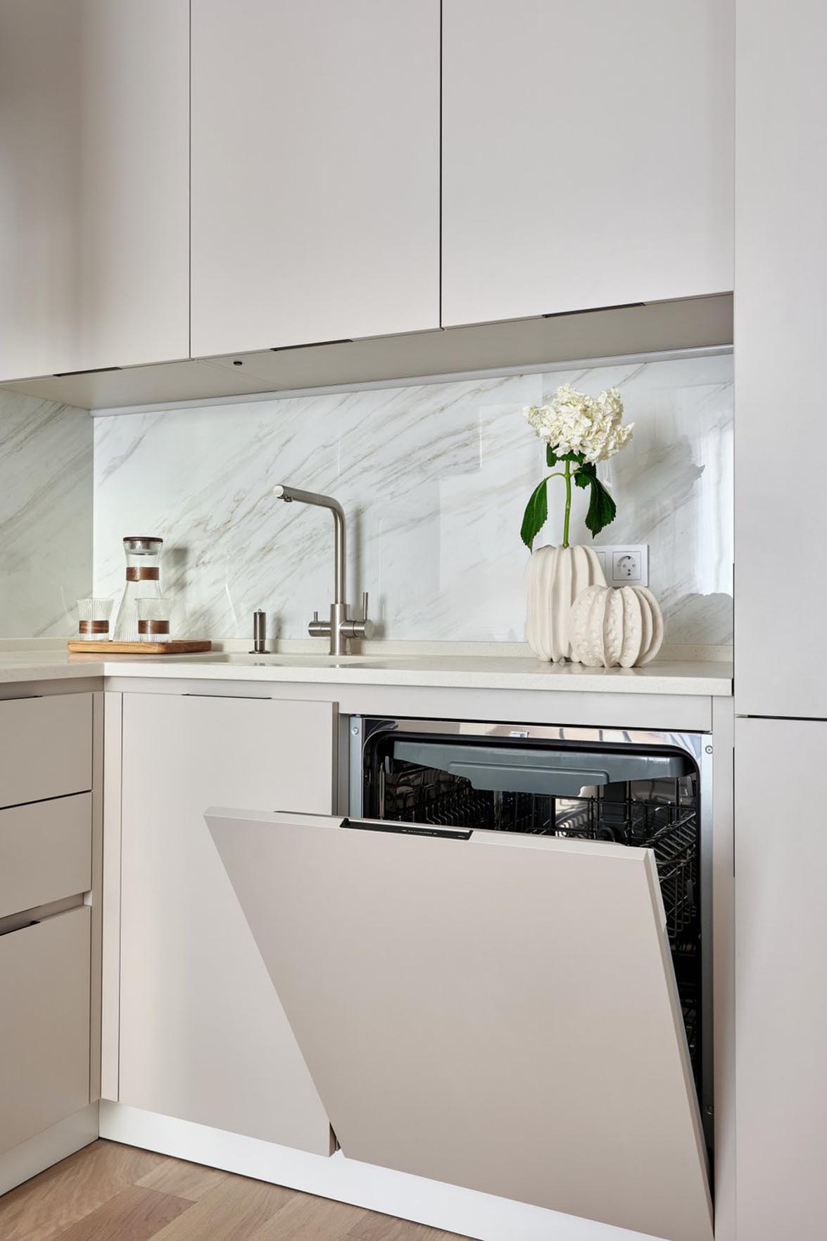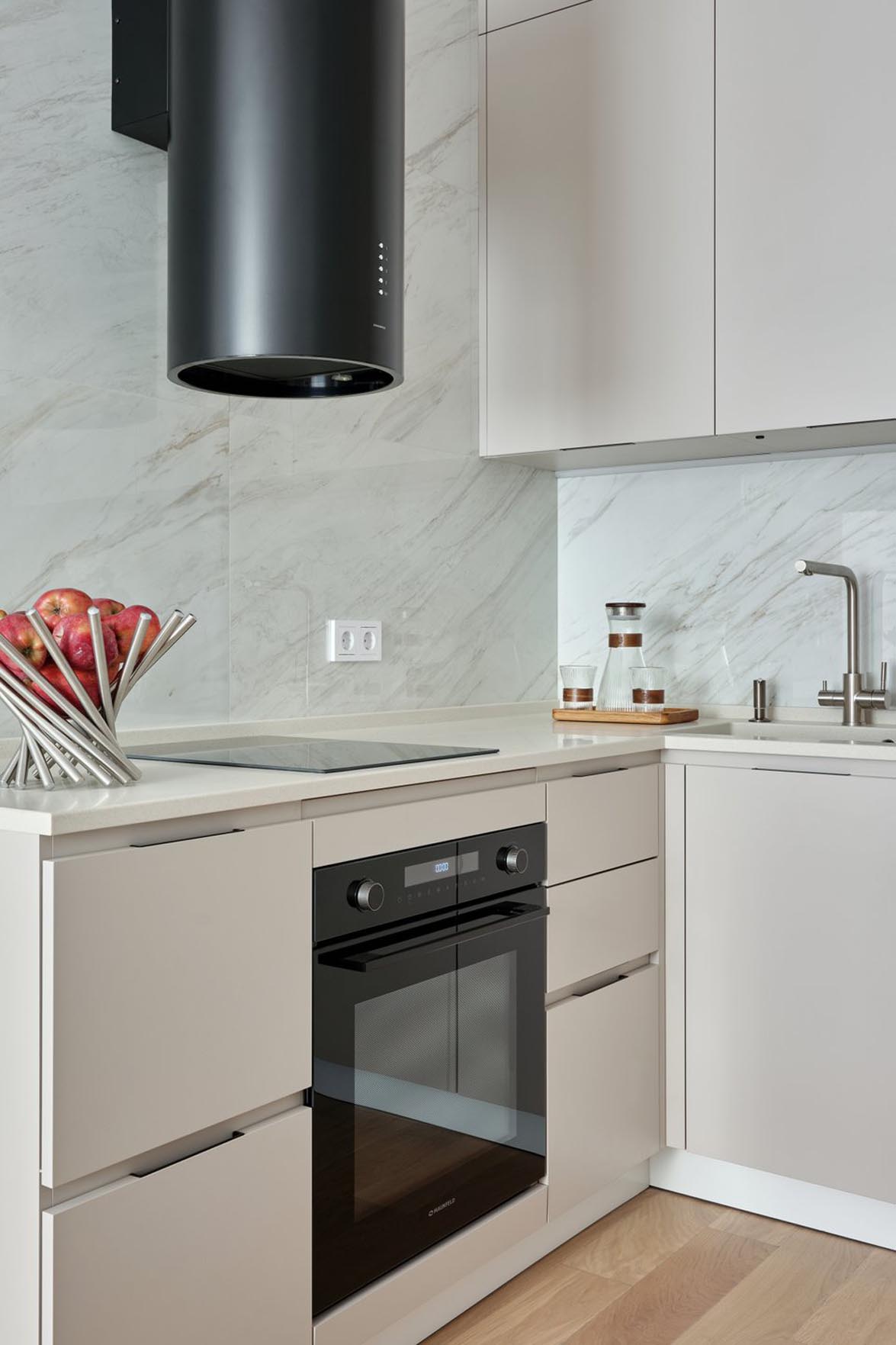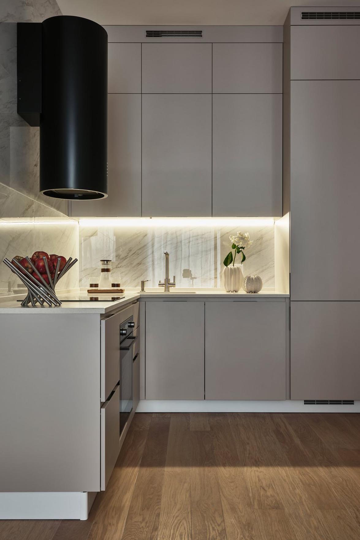 A tulajdonosok kérése az volt, hogy a konyha – különösen a főzőzóna – ne váljon hangsúlyossá, hanem olvadjon bele a nappali enteriőrjébe. Ezt a hatást letisztult, sík, fogantyú nélküli frontokkal és a két zóna egységes színhasználatával érték el. Felső szekrénysort csak az egyik falra szereltek, ezzel is segítve, hogy a tér kevésbé legyen zsúfolt.