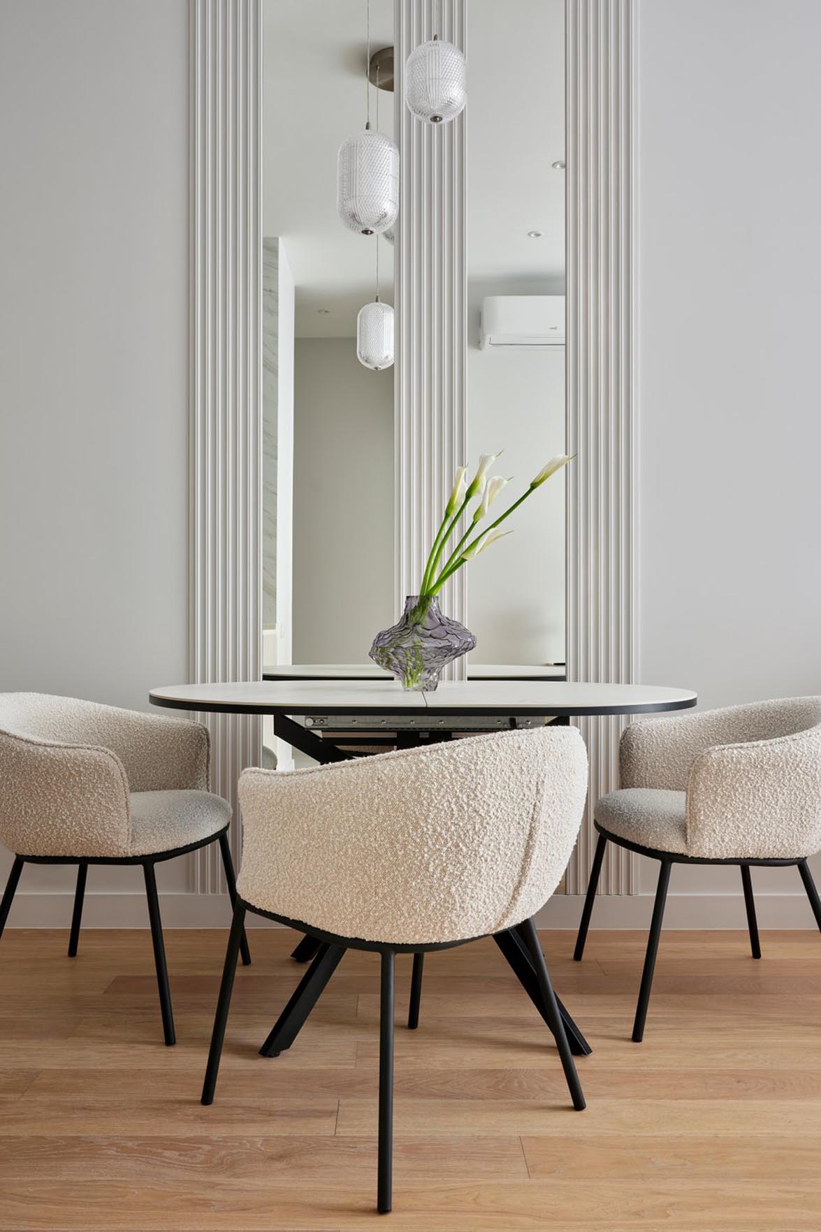 „A projektben sok tükröt használunk – mesélik a tervezők. – Különösen előnyösen mutat a falpanelek és a tükrök kombinációja az étkezőasztalnál, melyekben szépen tükröződik a lépcsőzetes függeszték. Ez a kompozíció egyszerűen kivitelezhető és viszonylag költséghatékony.”