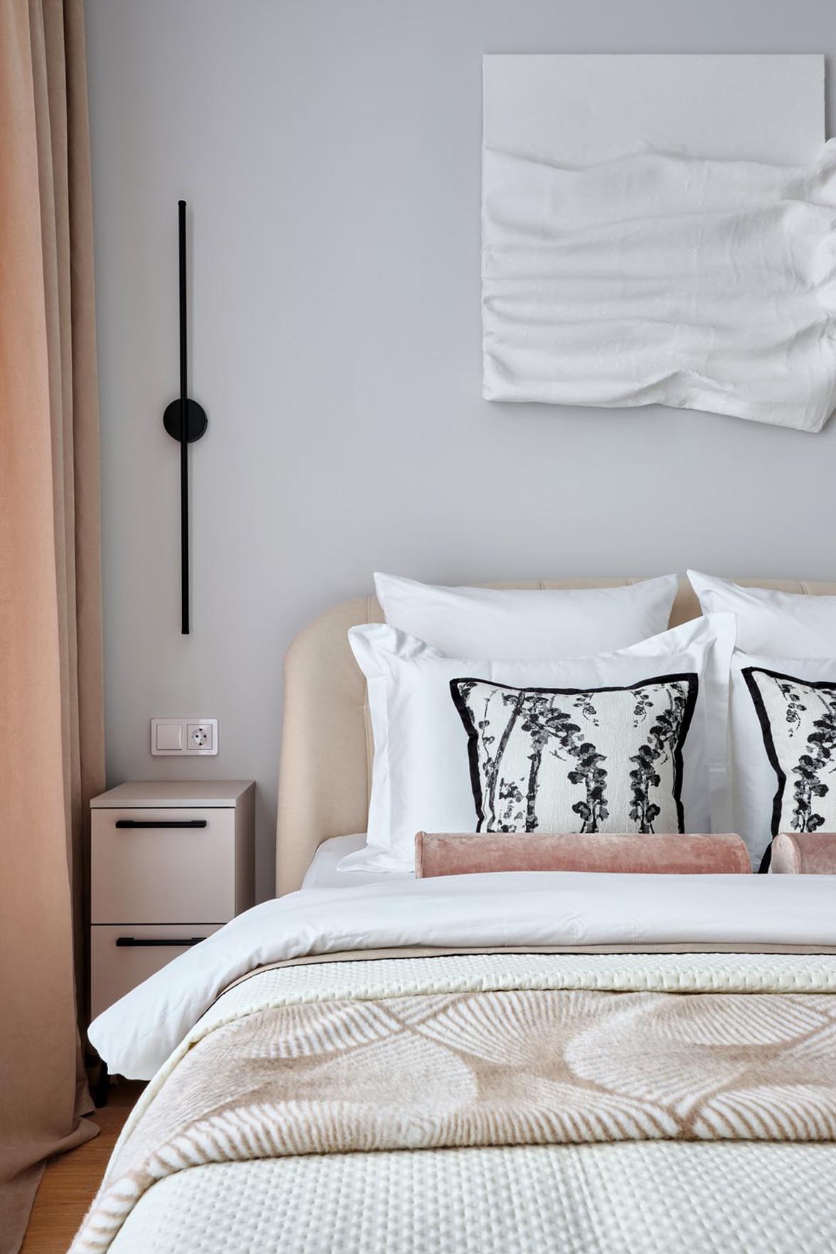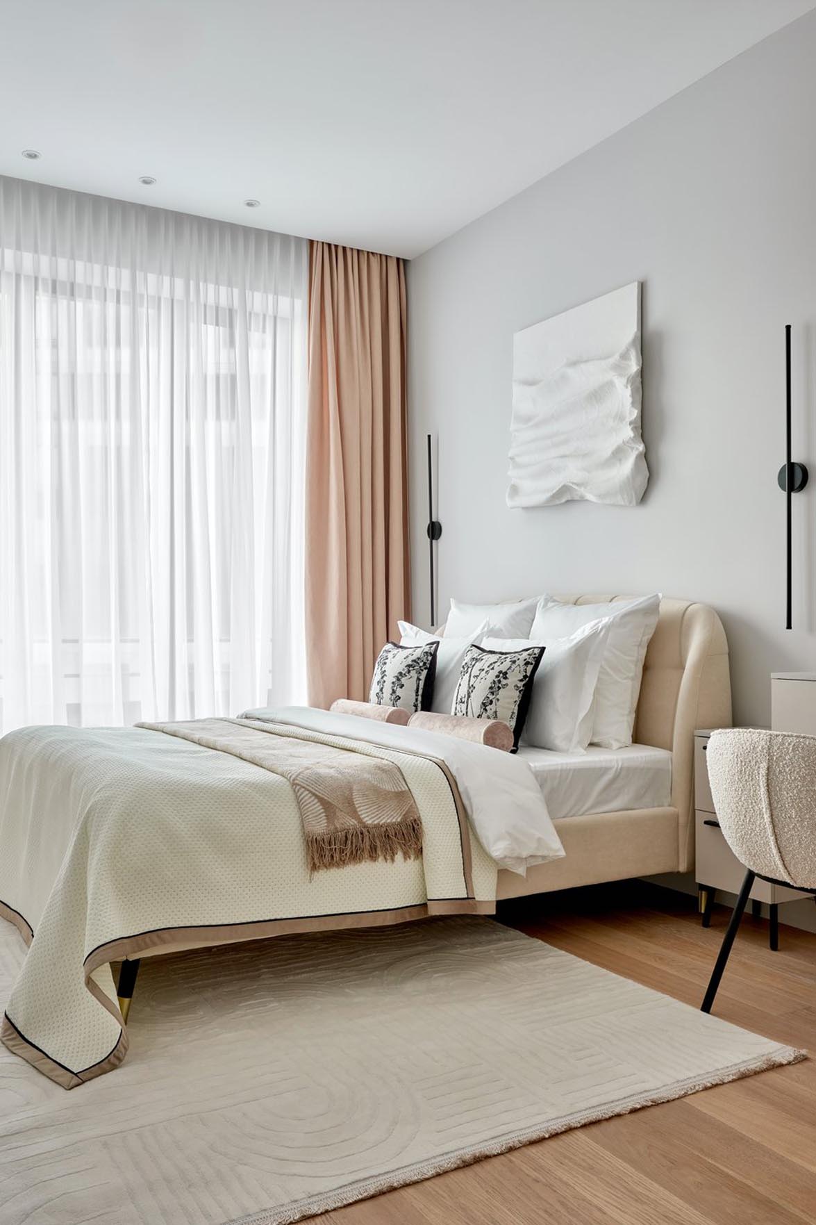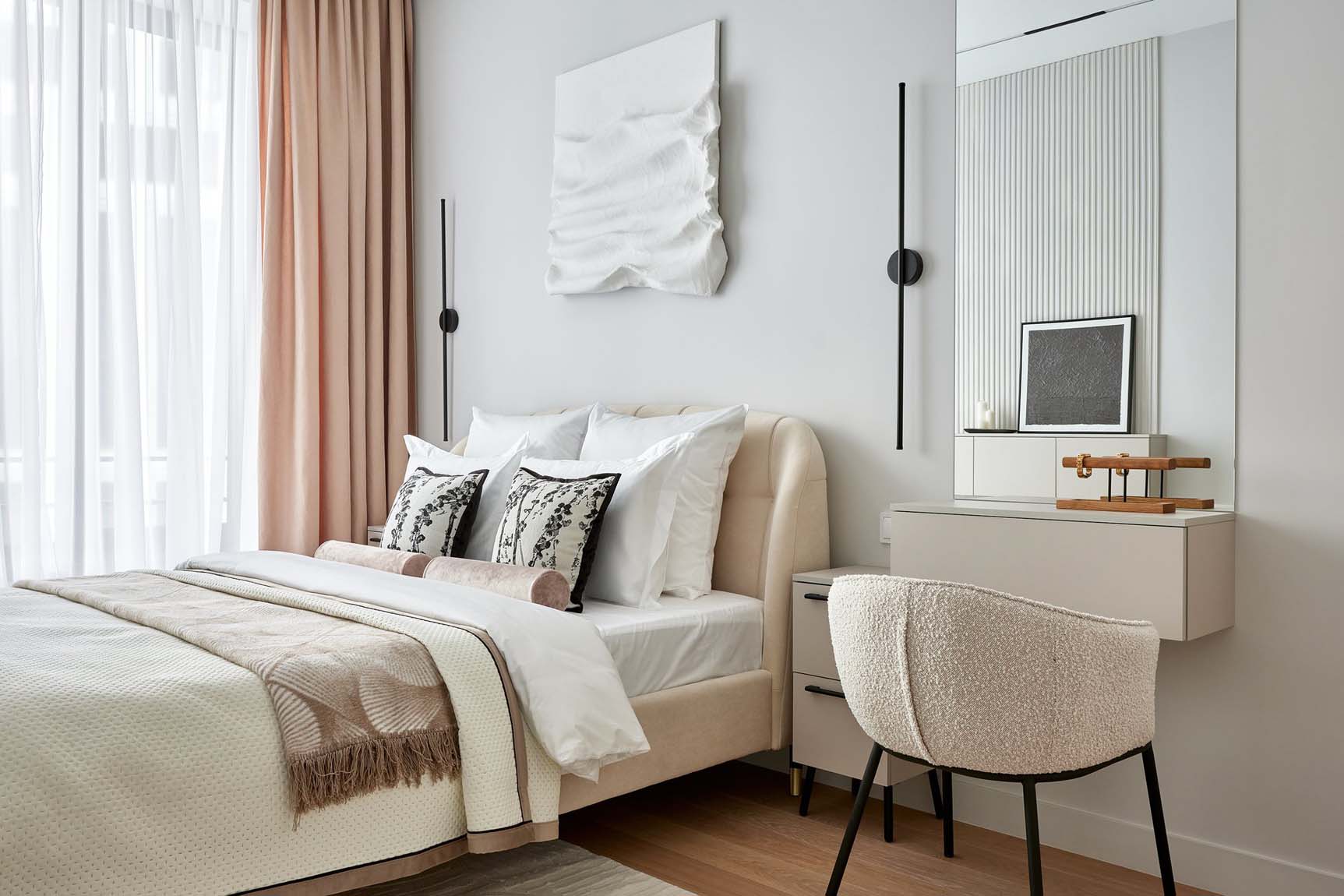 A szoba központi eleme az ágy és a fejtámla fölötti nagyméretű panel. „Egy lábakon álló, ágyneműtartós, gyönyörű, lágy formájú, kárpitozott fejtámlával rendelkező ágyra volt szükségünk. A berendezést két éjjeliszekrénnyel, egy fésülködőasztallal és fali lámpákkal egészítettük ki.”