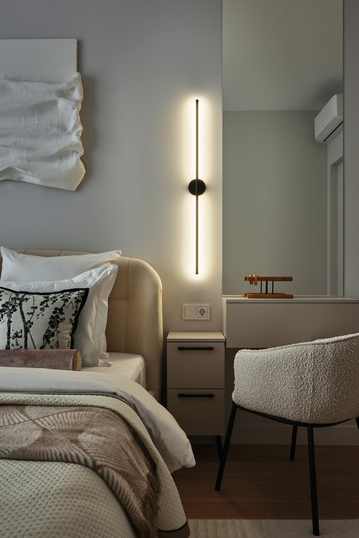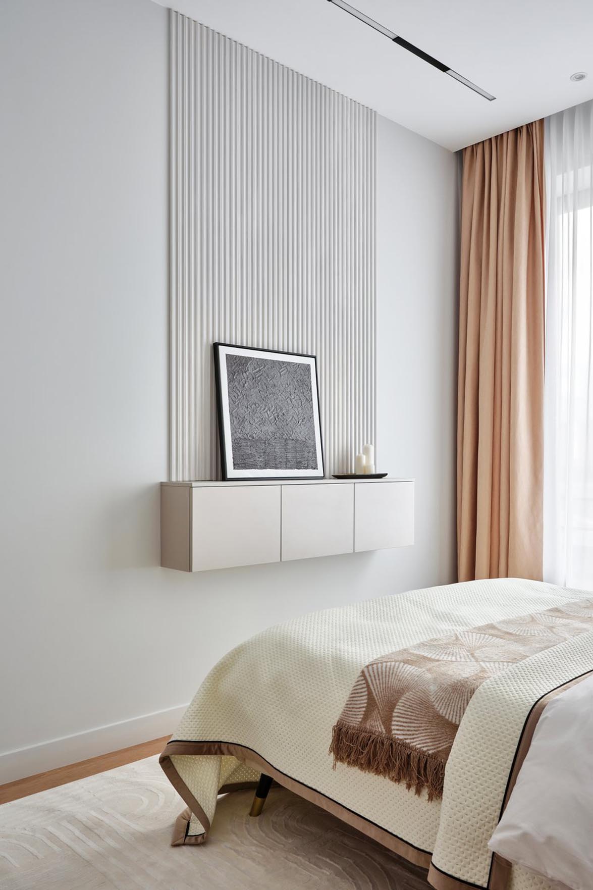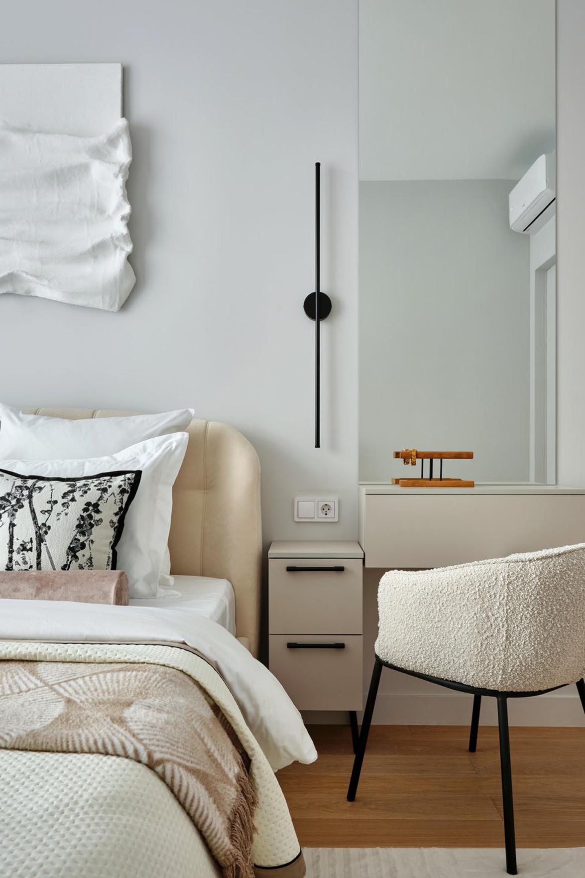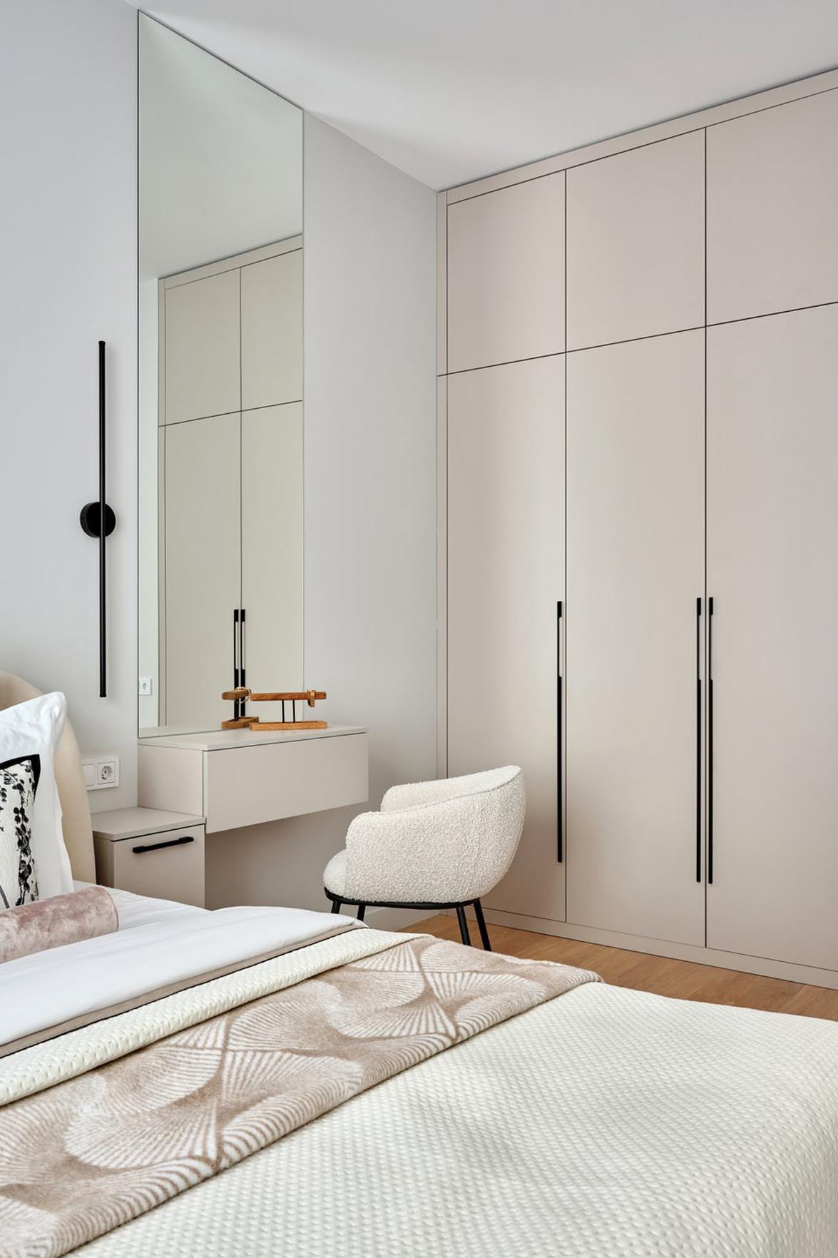 A hálószoba hangulata és színhasználata követi a nappaliban megkezdett koncepciót. „A helyiségben eredetileg volt egy falfülke, amely szinte kínálta magát egy gardróbszekrény számára – kommentálják a tervezők. – Ezt egyedileg készítettük el, faltól falig és a mennyezetig érően. A falfülkében lévő villanykapcsolót áthelyeztük egy másik falra, hogy a beépítés lehetséges legyen.”