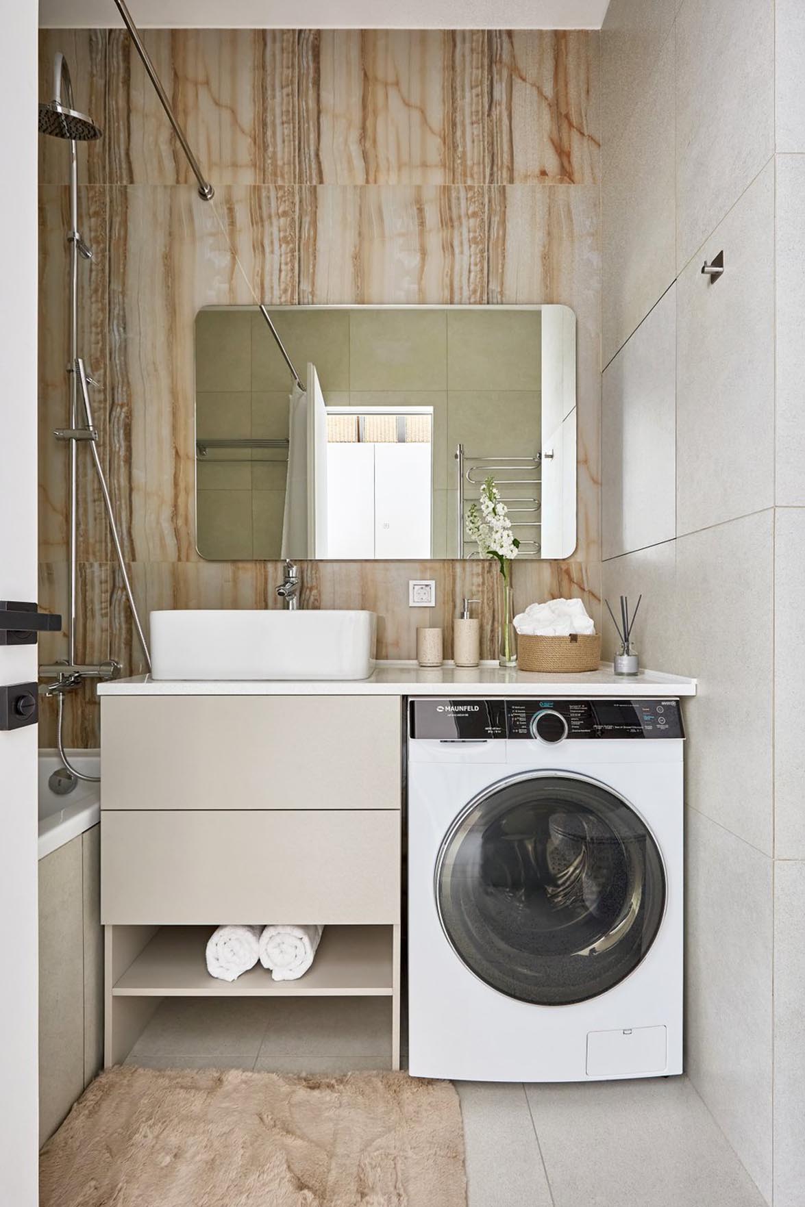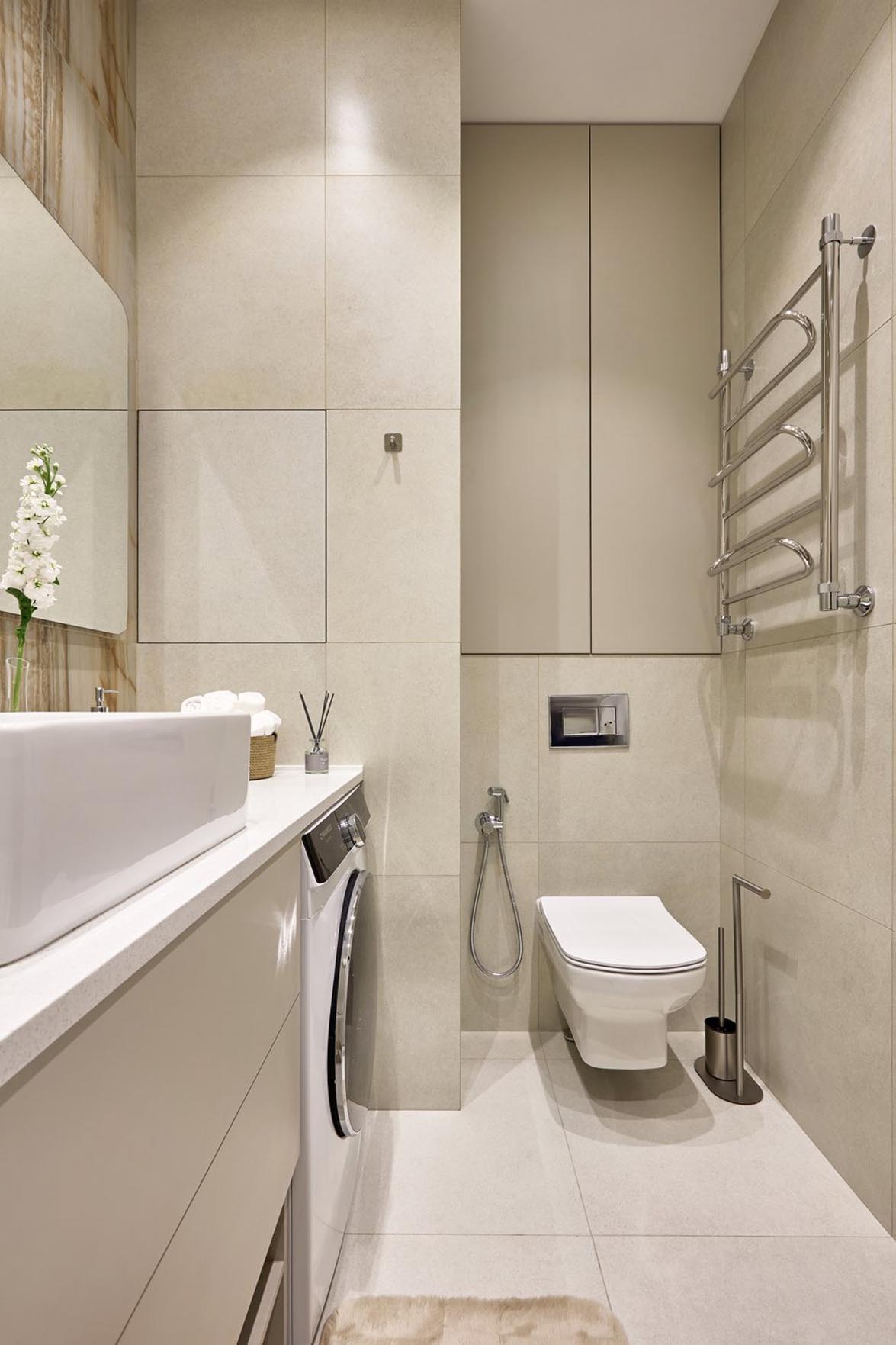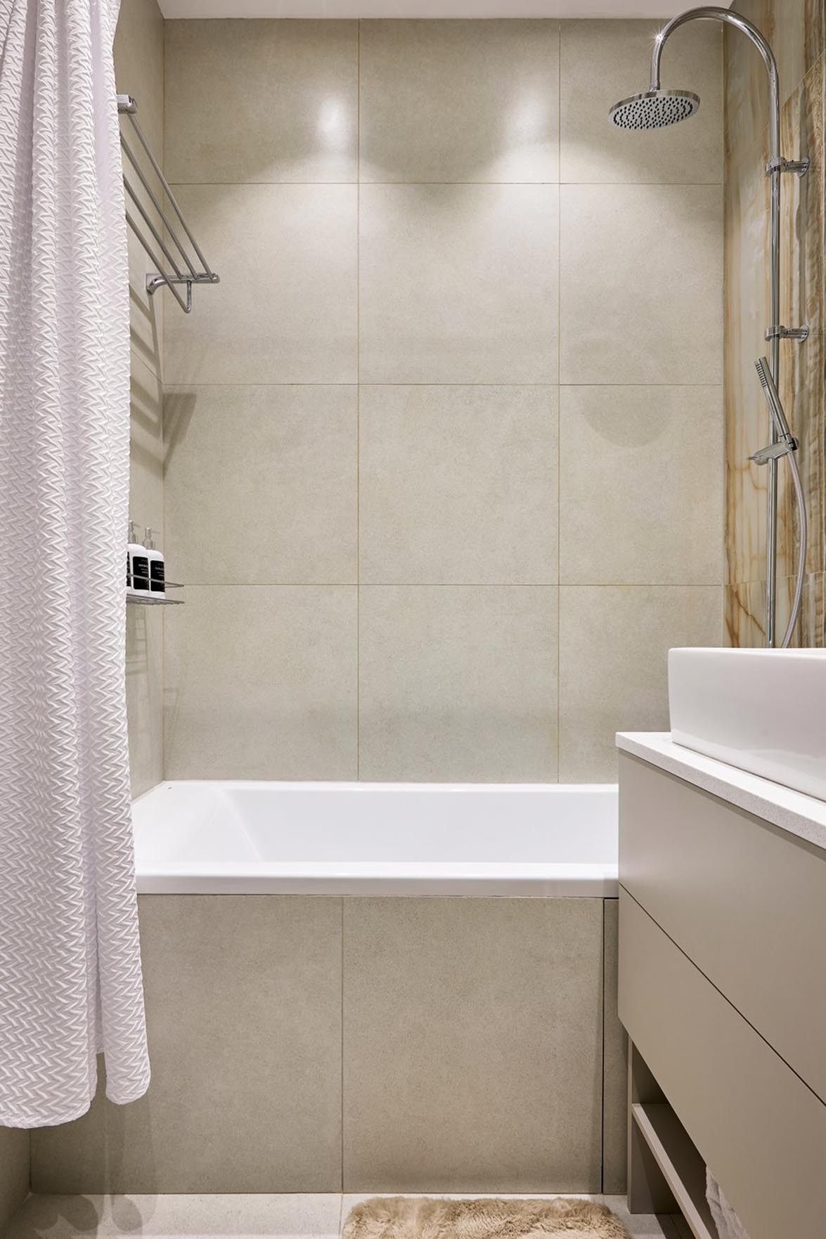 A fürdőszobában megmaradtak az eredeti, beruházó által készített burkolatok. Az egyedi bútorok – a mosdó alatti szekrény és a falba süllyesztett WC-tartály fölötti tároló -, valamint a tömör kőpult egyedi megrendelésre készültek. A mosdókagylót nem cserélték le, az az eredeti felszereltség része.
