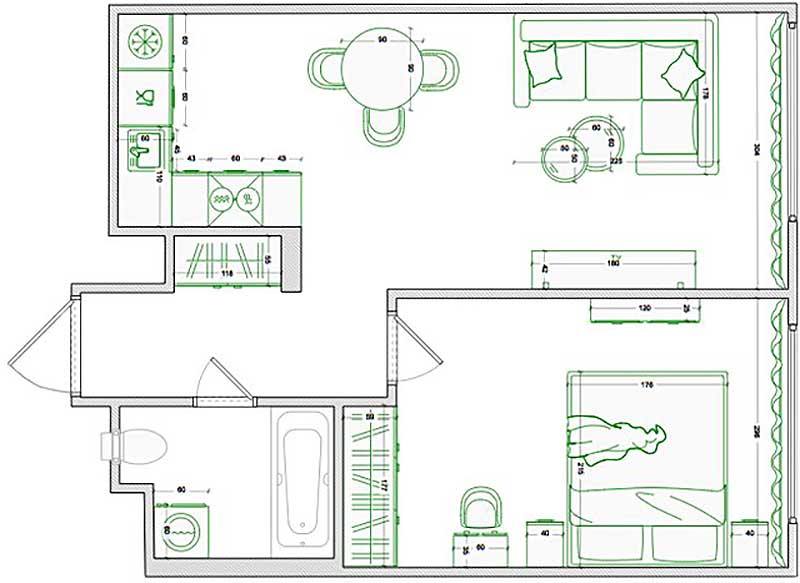A lakást kulcsrakész állapotban vették át, a meglévő elrendezés pedig megfelelt a céloknak, így a funkcionális zónák az eredeti helyükön maradtak. Az ingatlanban egy amerikai konyhás nappali, egy külön hálószoba, egy fürdőszoba és egy kis előszoba található.