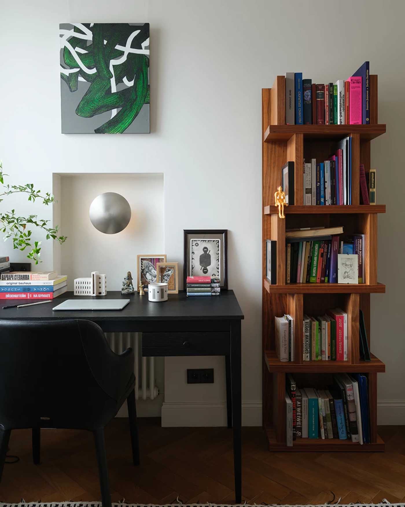 A kreatív munka helyszíne a hálószobához hasonlóan a régi, de felújított nyílászárók mögött bújik meg. Ide egy, a duplaszárnyú ajtókhoz stílusban illeszkedő, egyszárnyú ajtót kutattak fel és újítottak fel a tervezők. A berendezés fókuszában a Lulu Space íróasztala és az Angel Cerda könyvespolcai állnak, a megvilágítást pedig itt is egy Santa & Cole fali lámpa biztosítja, tökéletes környezetet teremtve az elmélyült munkához és a művészeti albumok tanulmányozásához.