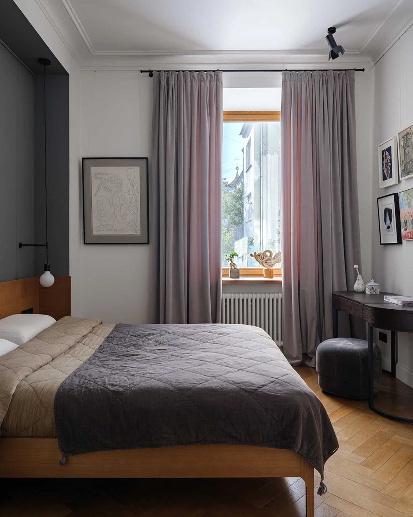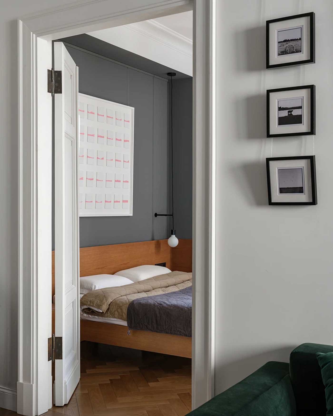 A háló kialakításánál a nyugalom és a praktikum dominált. A két kisebb szoba alaprajzát csak minimálisan módosították, hogy mindkettőben mennyezetig érő beépített szekrényeket helyezhessenek el. A hálószobában a beépített bútorok itt is a fal színébe olvadnak, vizuálisan tágítva a teret. Ezzel kontrasztban az ágy mögötti falfülke – amelybe az egyedi készítésű ágyfejvég került – mélyszürke árnyalatot kapott, drámai mélységet adva a szobának. A kényelmet a Normann Copenhagen puffja és az Astro Lighting olvasólámpái teszik teljessé. A helyiség hangulatát a restaurált, kétszárnyú faajtók alapozzák meg, amelyek a ház eredeti korát idézik.