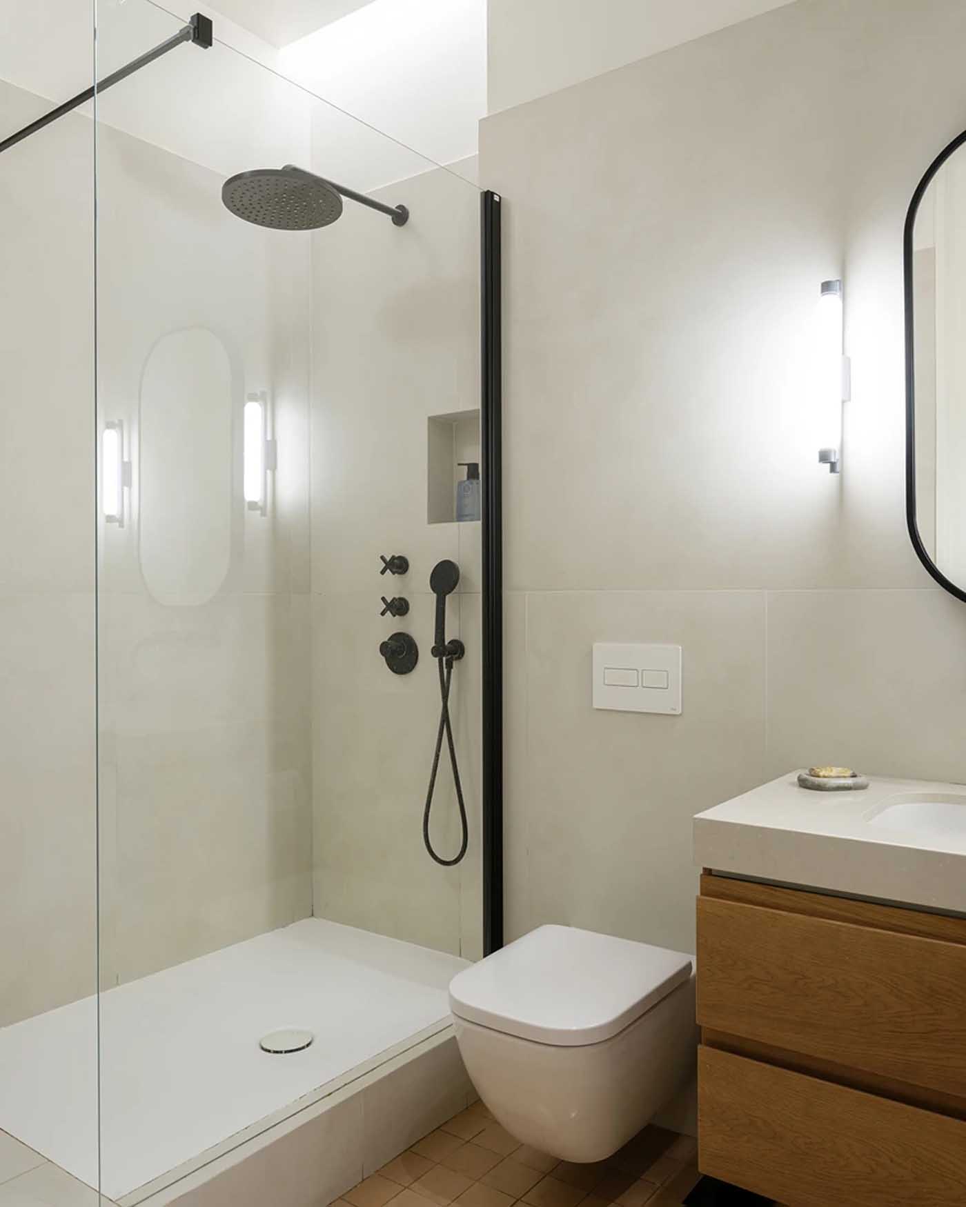 A megnövelt alapterületű fürdőszoba spa-élményt nyújt. A padlót kézzel készített cementlapok borítják, amelyek élő anyagként idővel patinásodnak, így őrizve meg a régi bérházak hangulatát. Bár a vendégek gyakran azt hiszik, eredeti burkolatról van szó, ez valójában egy új, minőségi választás. A szaniterek a Duravit és a Dornbracht kínálatából kerültek ki, a tükör melletti világítást pedig a Nemo Lighting biztosítja. A helyiség mennyezete és a rejtett mosókonyha blokkja a hálószobai fülkéhez hasonló, sötétebb árnyalatot kapott, ami elegáns kontrasztot képez a világosabb felületekkel.
