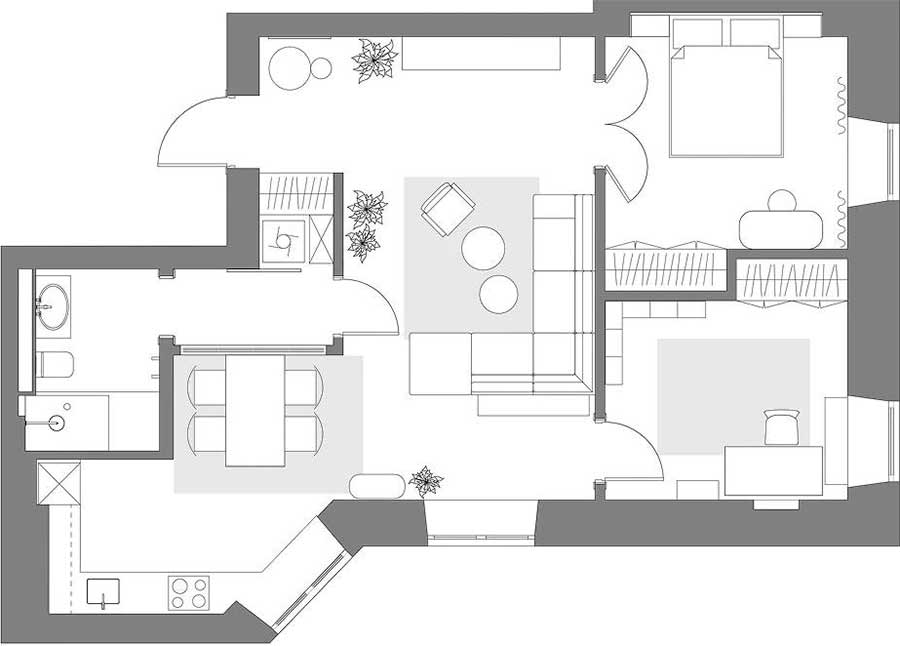 Az eredeti alaprajz régi építésű házakban tipikus problémákat mutatott: egy sötét, szűk előszoba vezetett egy L-alakú, nagy átjáróház-szerű szobába, ahonnan két kisebb helyiség nyílt. A konyha bonyolult geometriájú, tele kiugrókkal és sarkokkal, a teret pedig felesleges beépített szekrények és nyomasztó galériák szabdalták. A lakás adottságai azonban kiválóak voltak: nagy ablakok mély párkányokkal, nagy belmagasság és egy tágas fürdőszoba.